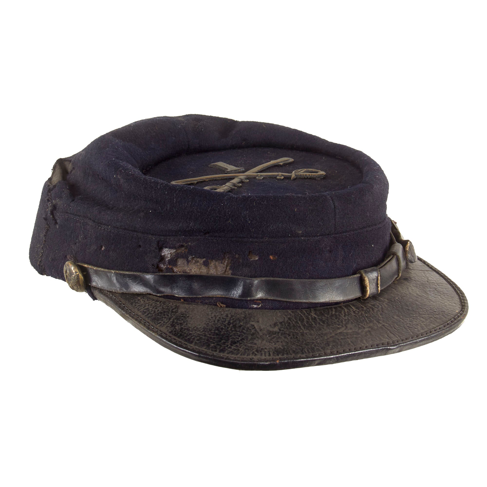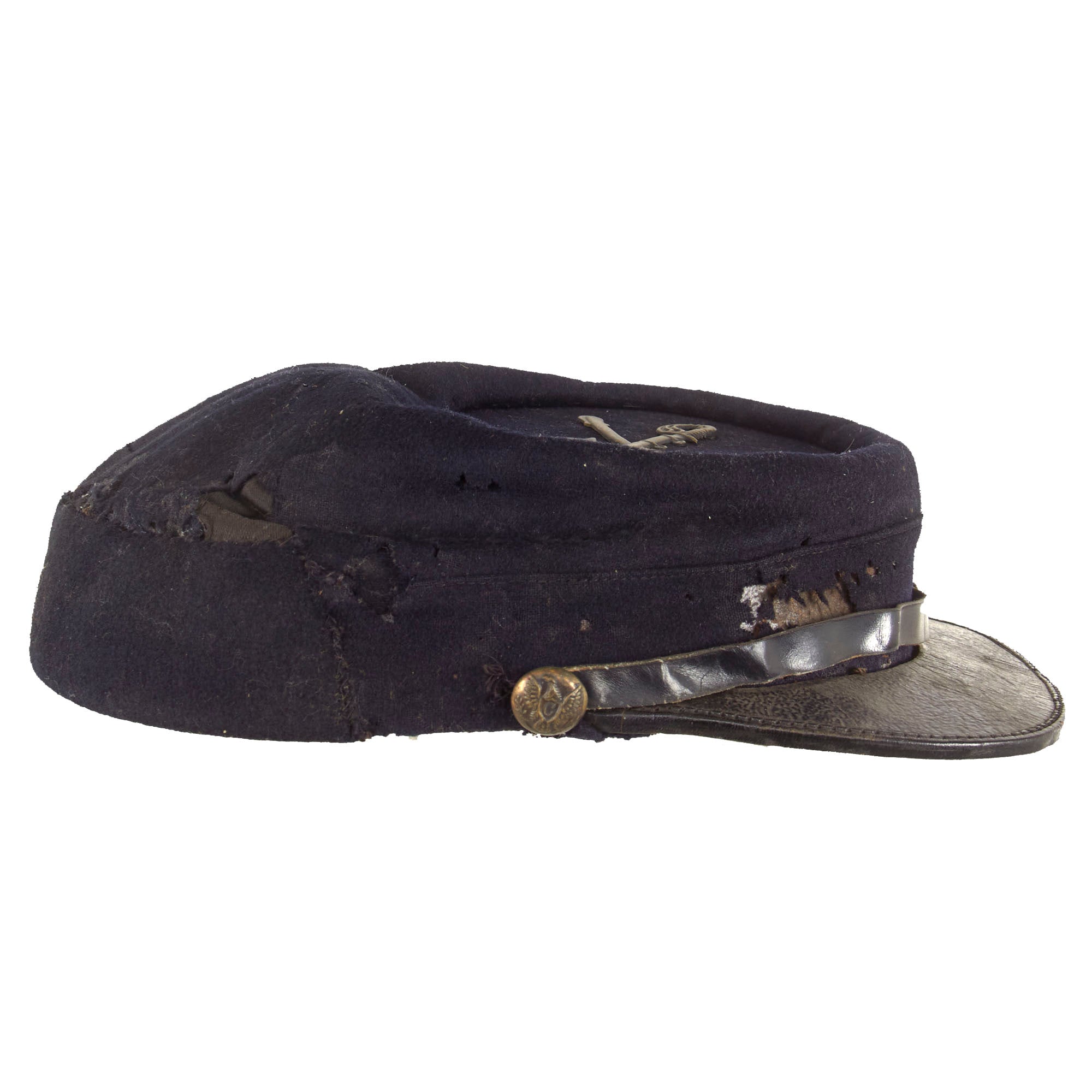 Original Item: Only One Available. This is a fair example of an early Indian War Model 1872 U.S. Army Regulation Kepi worn by an enlisted Cavalryman. This U.S. Army Model 1872 Kepi features fabric of dark blue wool broadcloth, with a painted leather visor, Moroccan leather sweatband, with Brown polished cotton lining in the crown. The crown stands 2 3/4" high at the front, 4 3/4" at the rear seam and the top is 4 1/2" in diameter. The body of the cap meets a band of wool seamed only at the back and stiffened with leather.