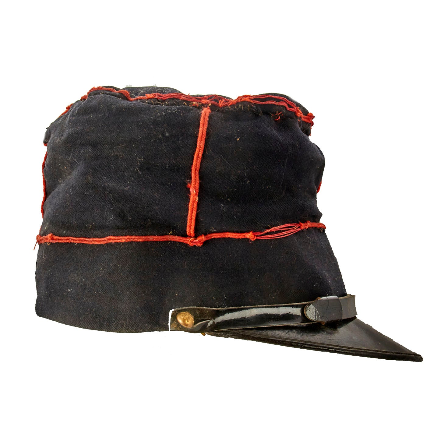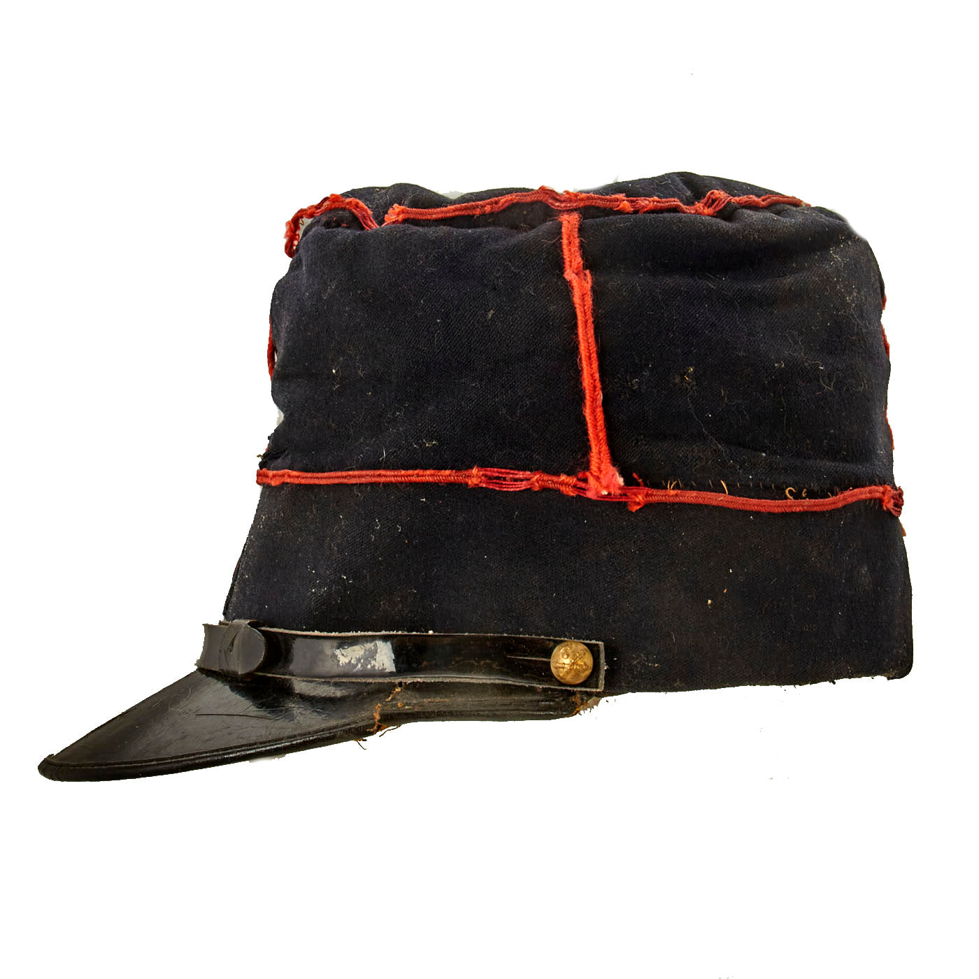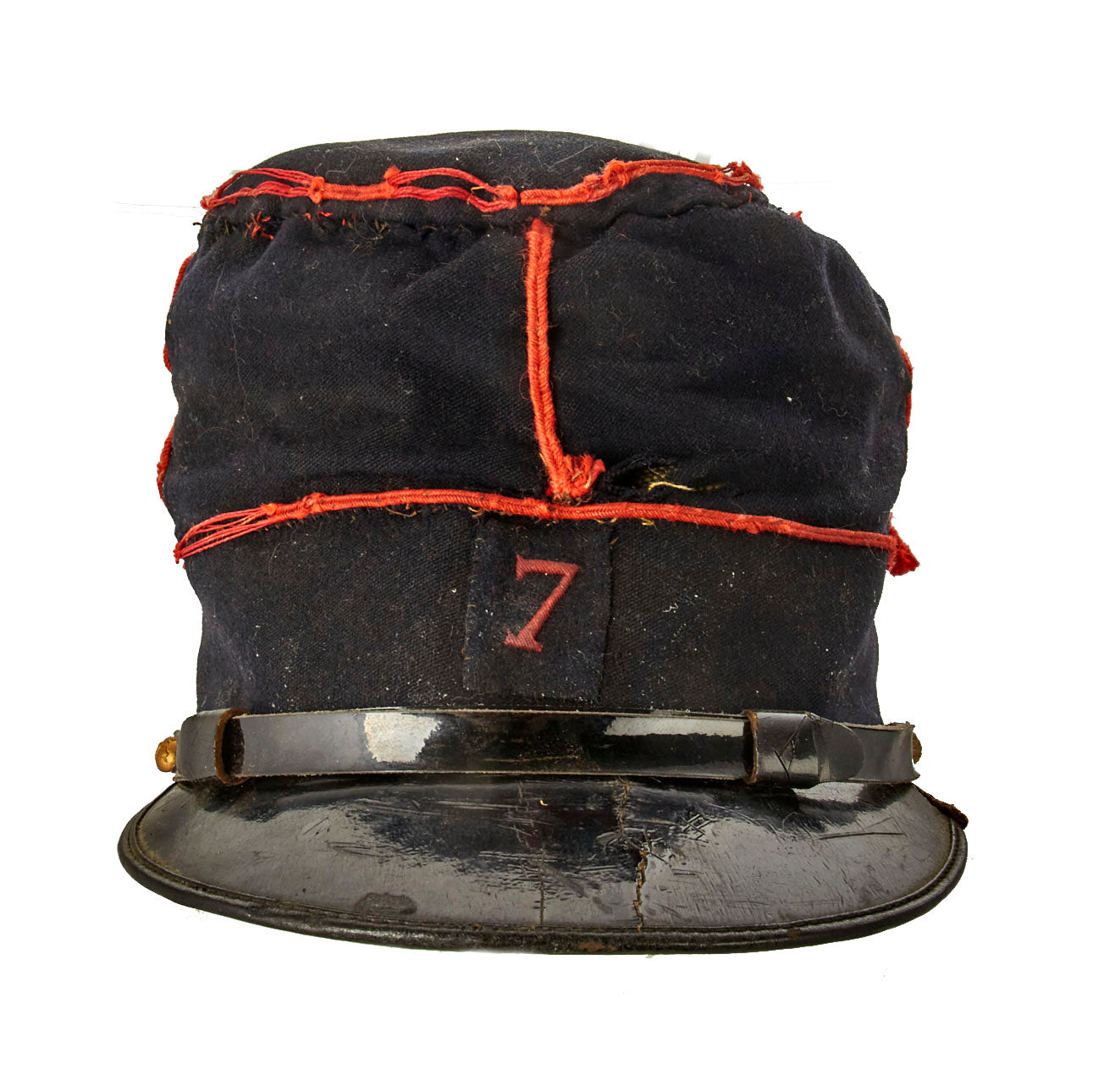 Original Item: Only One Available. Early war WWI French M-1910 enlisted man’s kepi for technical troops fitted with signal branch buttons. Pre/Early WWI Dark Blue wool body with red piping and chinstrap attached by the means of an Artillery Regiment Button on each side of the cap. A Red Regimental numeral 7 made of wool is affixed to the front.