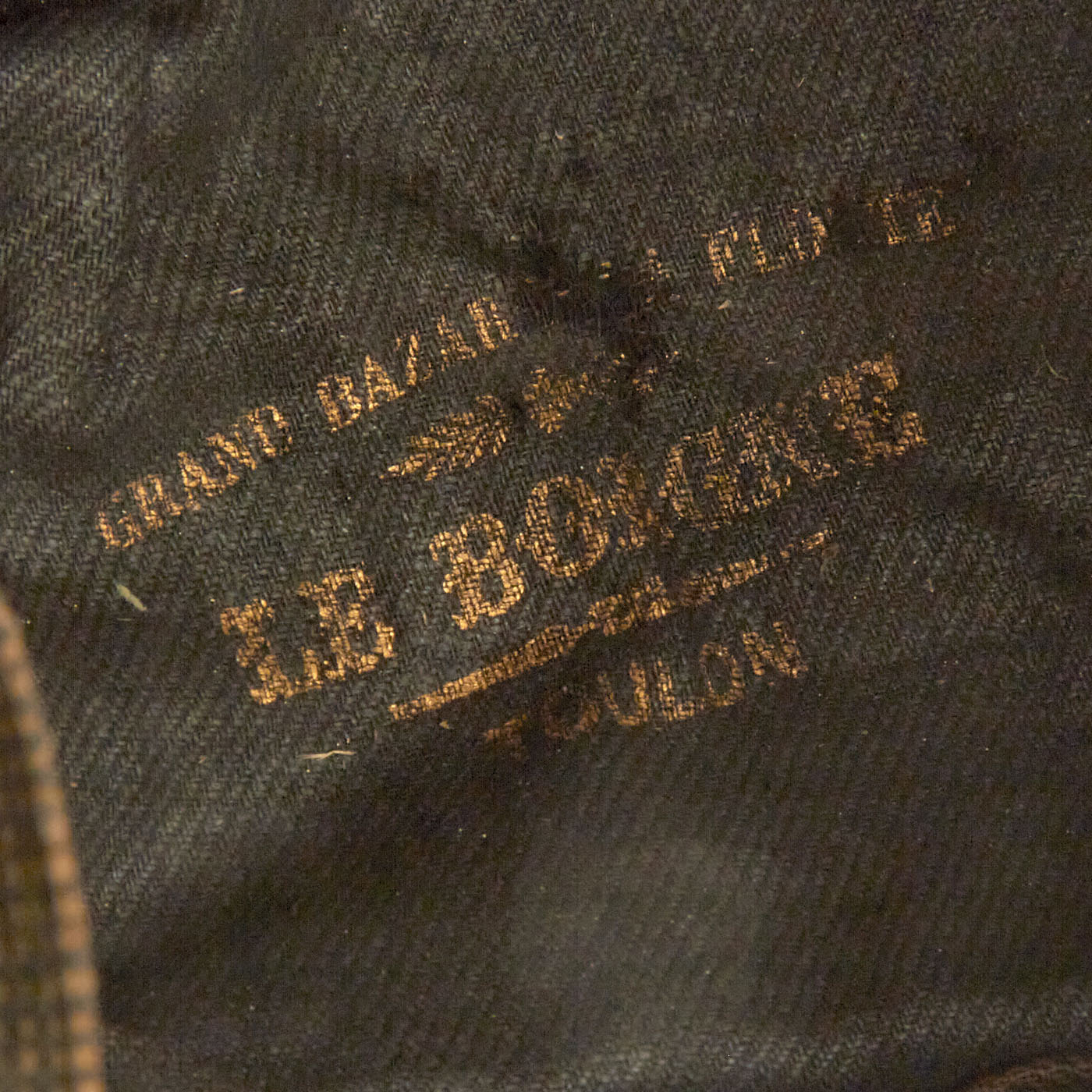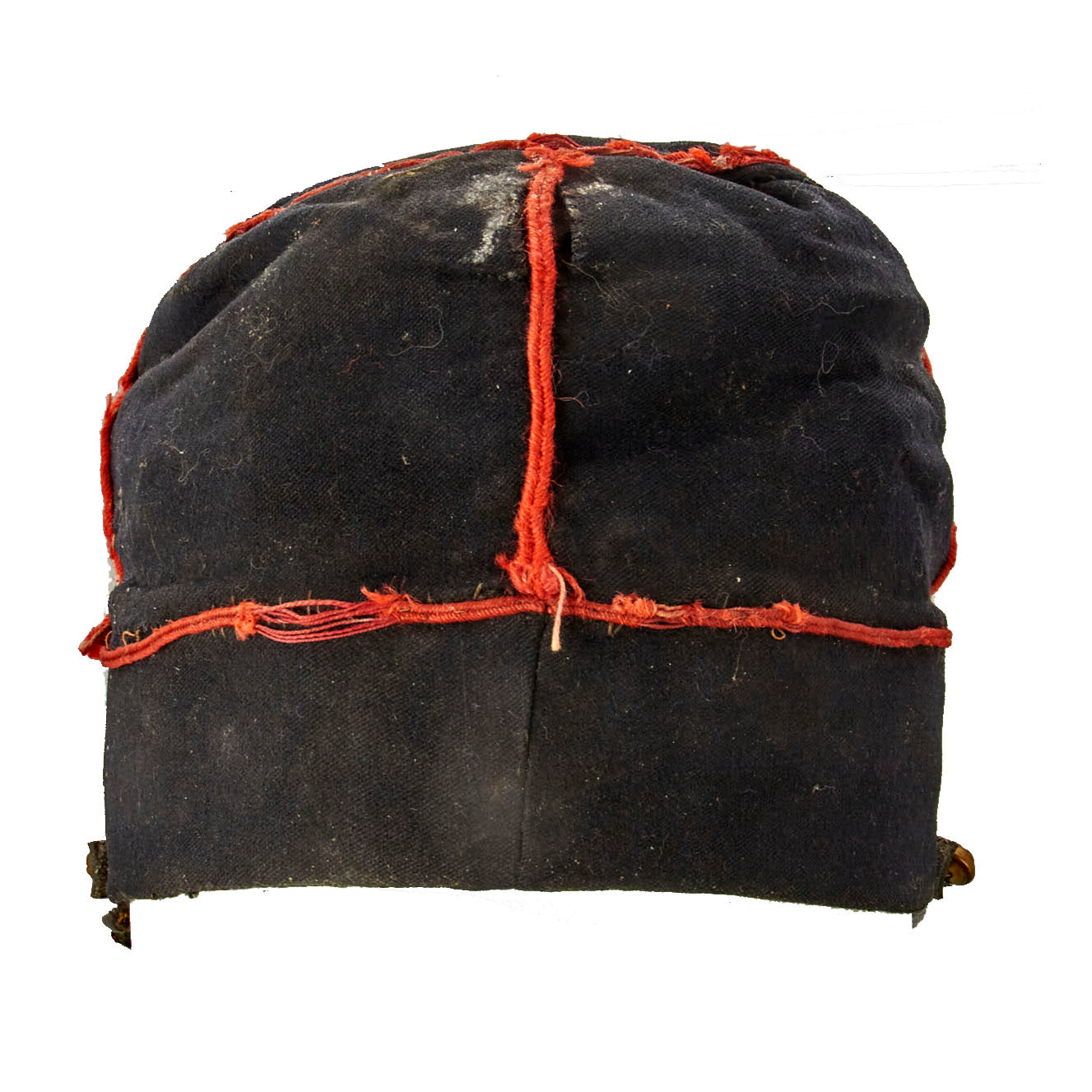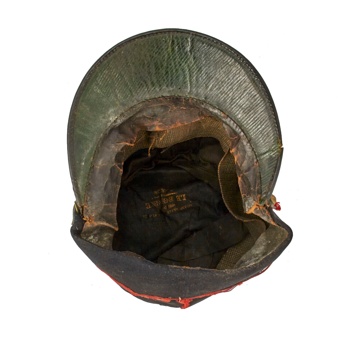 Original Sweatband is intact, albeit loose in some areas, and showing signs of wear and age. Polished Cotton lining is intact, but has become unstitched around the sweatband. The cap bears a Toulon maker’s marking which appears in the crown of the body. Visor is of painted leather, which shows signs of cracking and crazing from age. The original visor binding is intact. The chinstrap most likely is a later replacement. The body of the cap itself exhibits some mothing, some small tears here and there, and wear to the braidining.