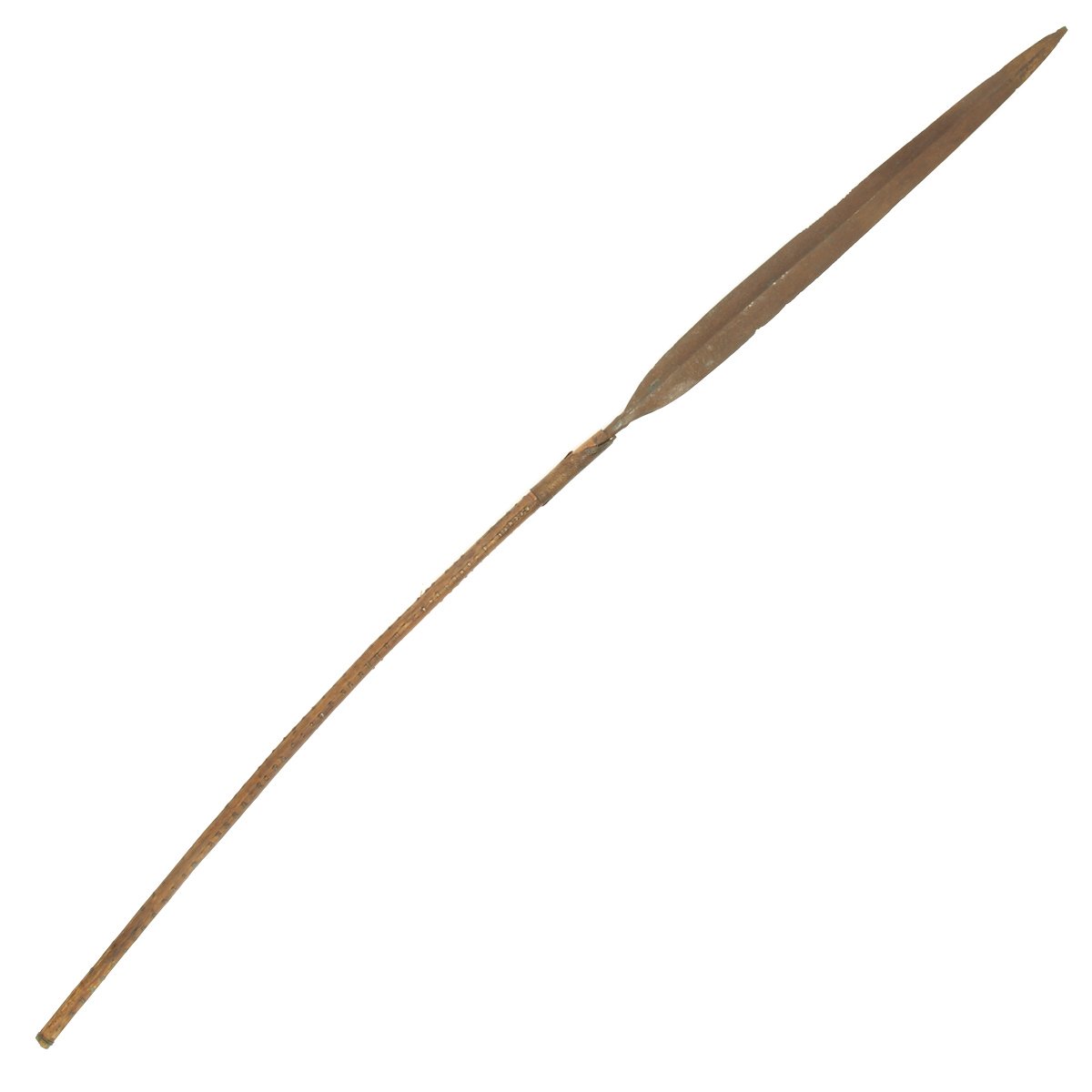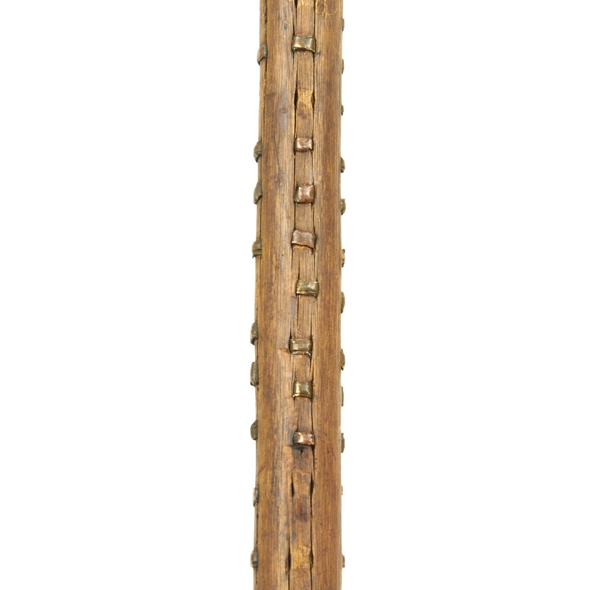Original item: One Only. This Assegai fighting spear dates from the time of the great Zulu Chief SHAKA, and this was used in combat hand to hand fighting. The iron head measures 25" in length with a width of 2 inches, and is covered in ancient rust and corrosion. The 31" wood shaft, bowed with age, is covered in decoration of sheet copper "staples" laid out in design, which also make the spear easier to grip. Overall length of 56". Clearly this has seen a lot of combat.