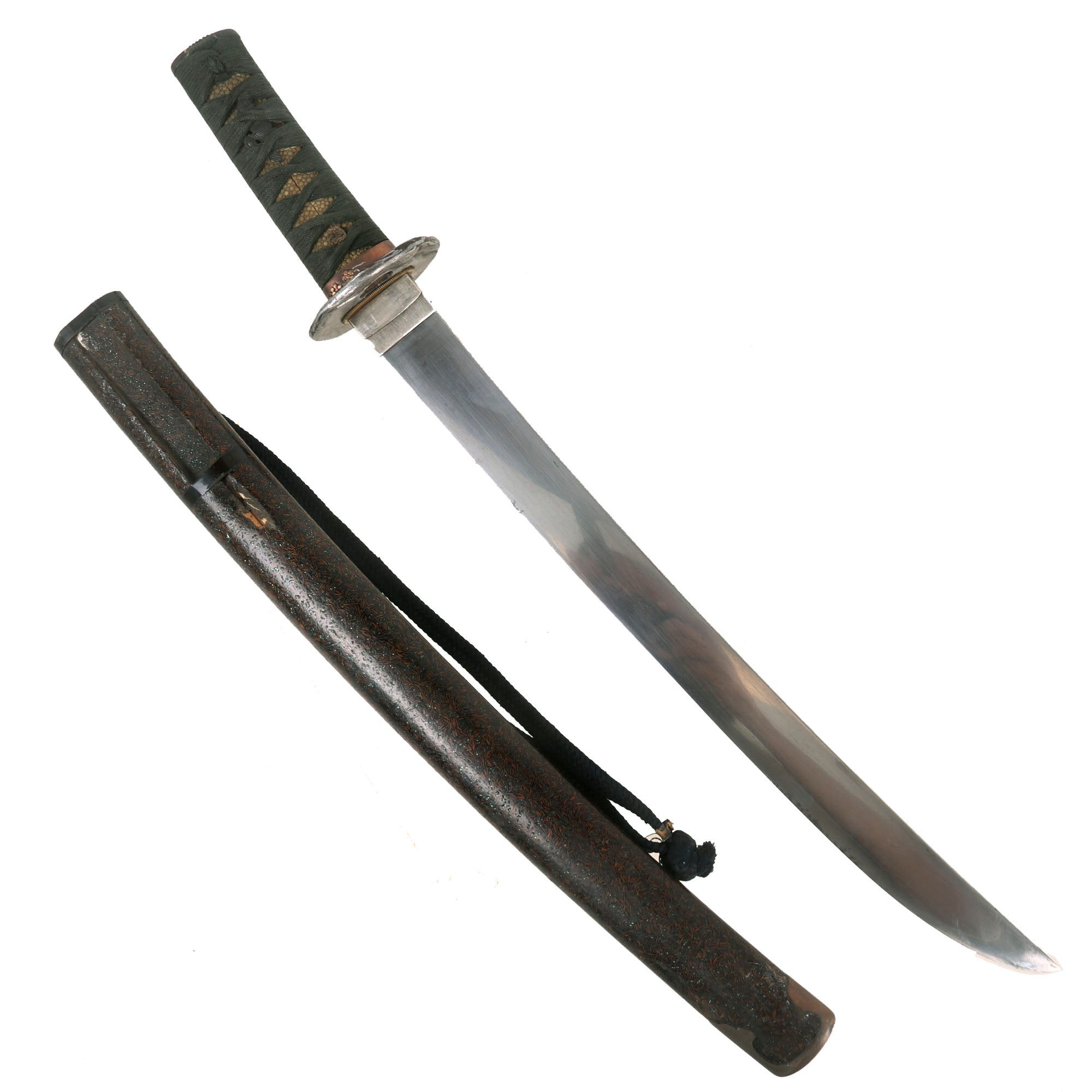 This interesting example dates from the Edo period (江戸時代, Edo jidai) or Tokugawa period (徳川時代, Tokugawa jidai) of Japanese history. This is the period between 1603 and 1867, when Japan was under the rule of the Tokugawa shogunate and the country's 300 regional daimyo. As the blade length is closer to that of a tanto, some would term this an "Ko-Wakizashi" (小脇差). It has the same Hira-Zukuri (平造) blade shape with no shinogi blade ridge, which is standard for tanto knives, however the fittings are definitely Wakizashi style.