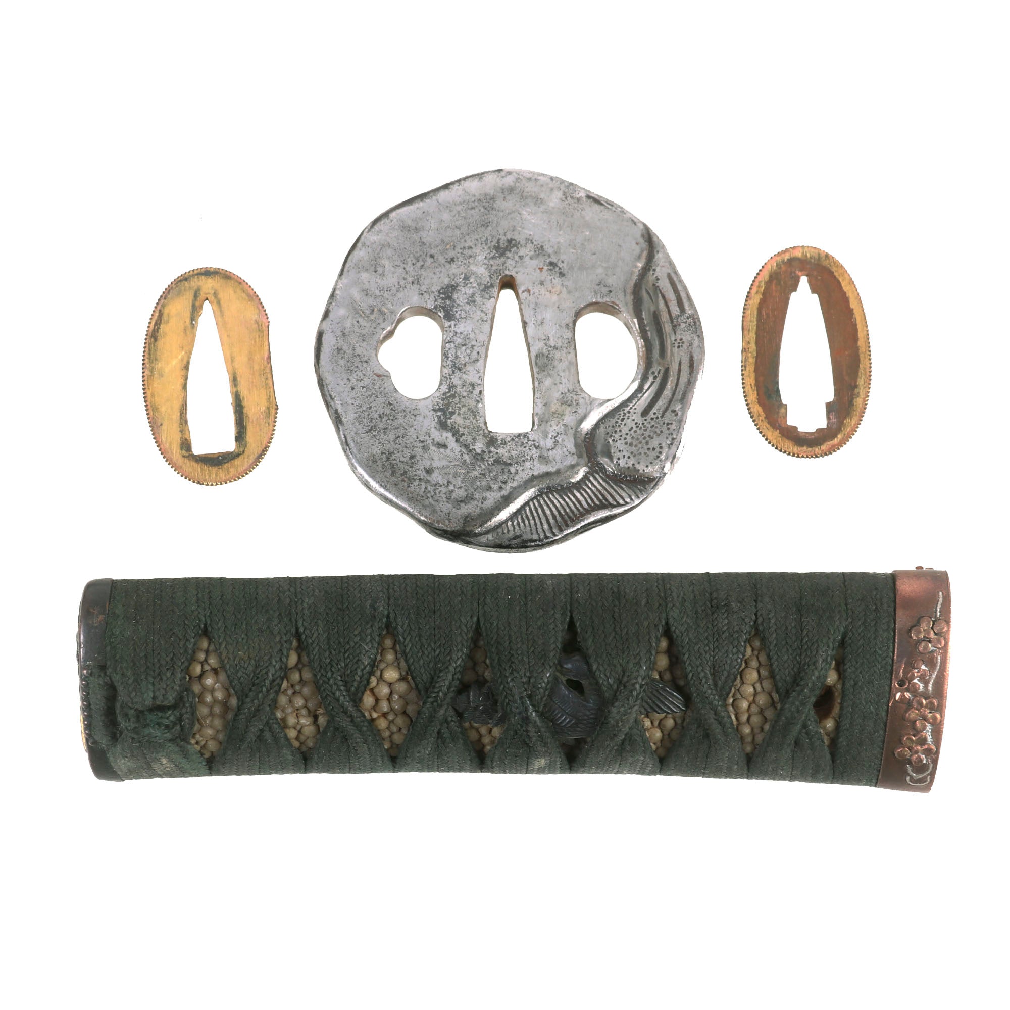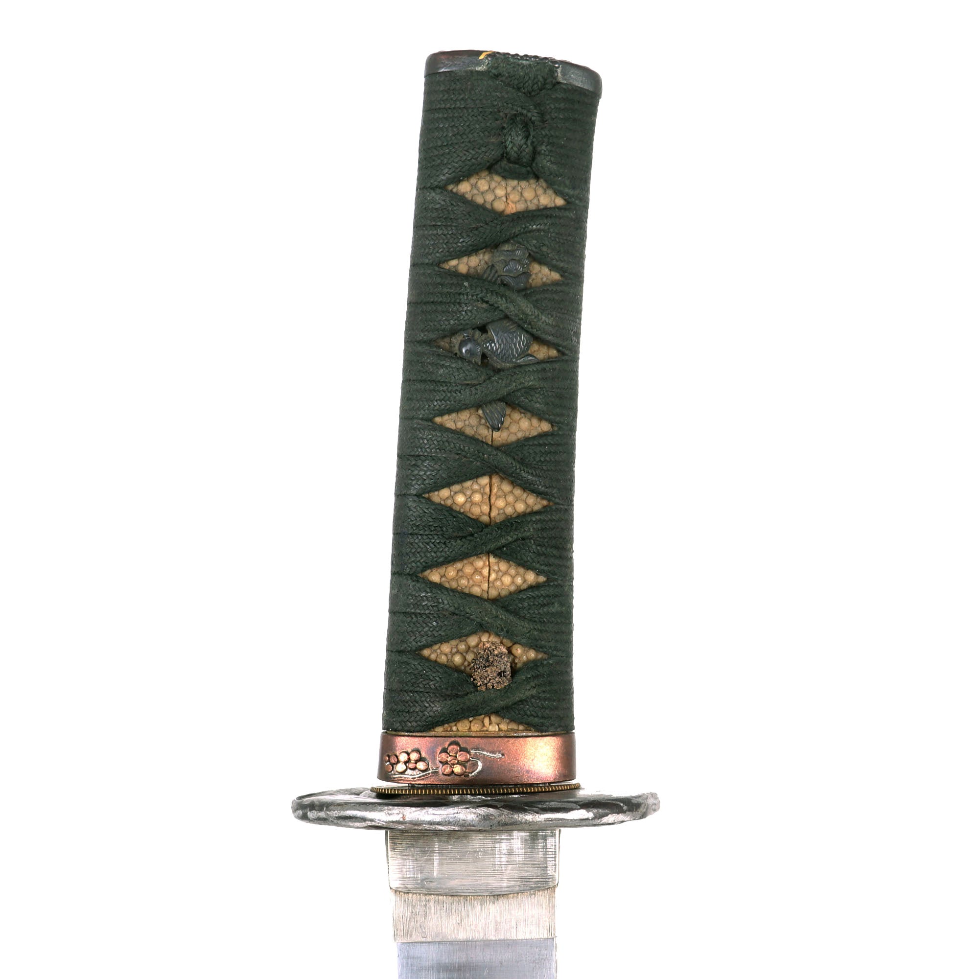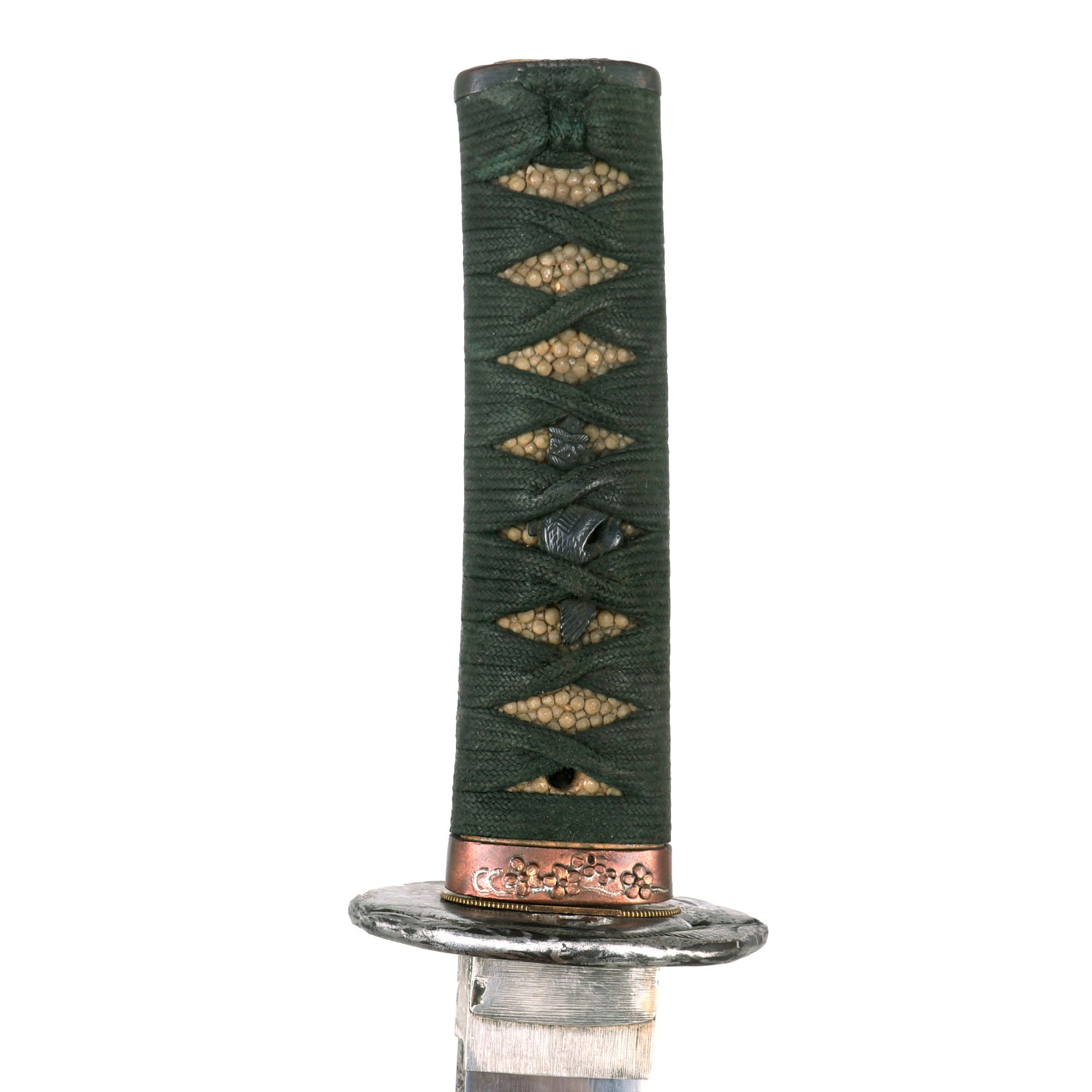 The stingray (Sa-Me) grip is in very good condition, with a nice dark green ITO grip wrapping, which holds the end cap in place. It is in good condition, showing moderate use, which has stained and discolored the wrapping a bit. There are two matching bronze menuki present, which look to be birds or fish, and are very well executed. The handle is held in place by a single securing peg, which looks to be quite old.