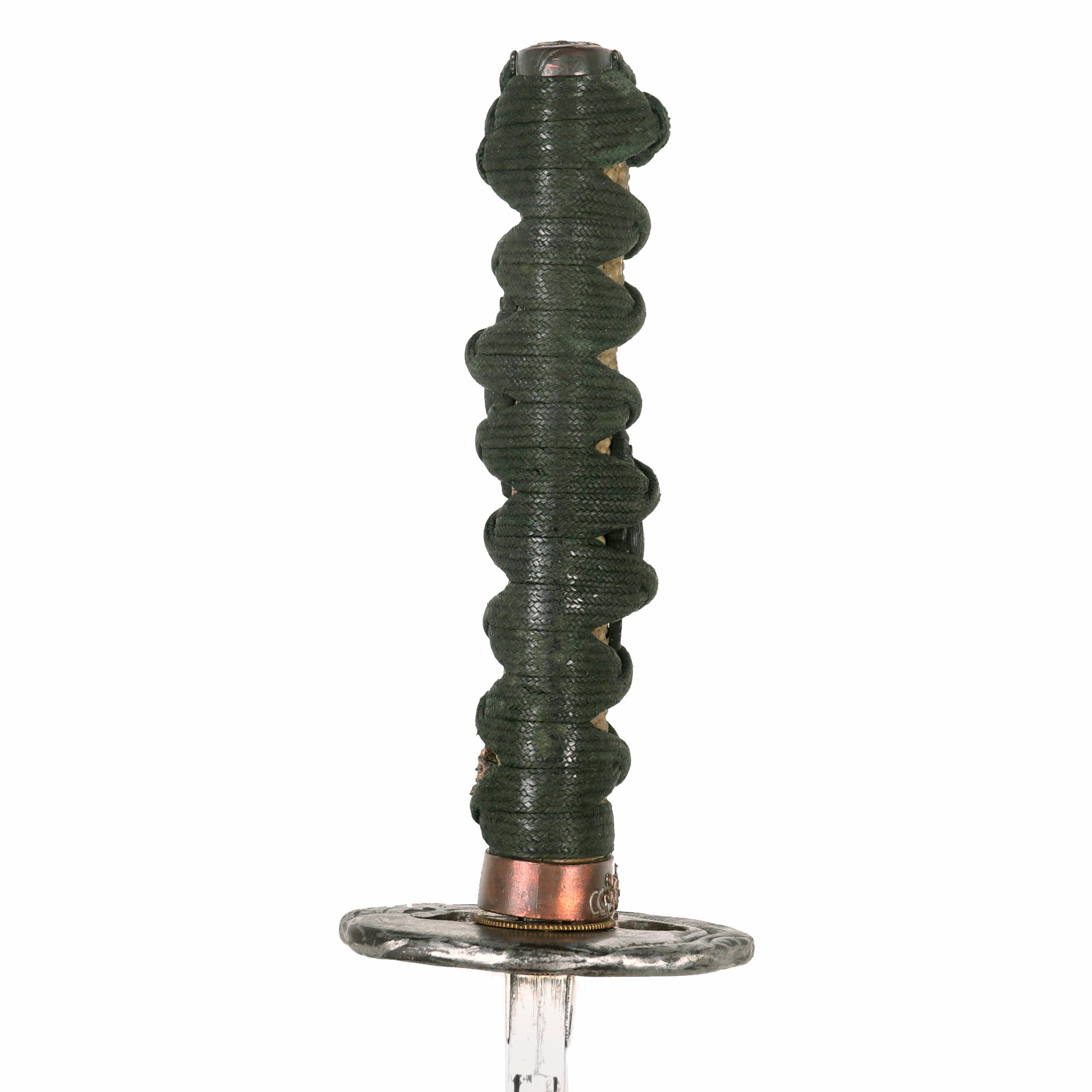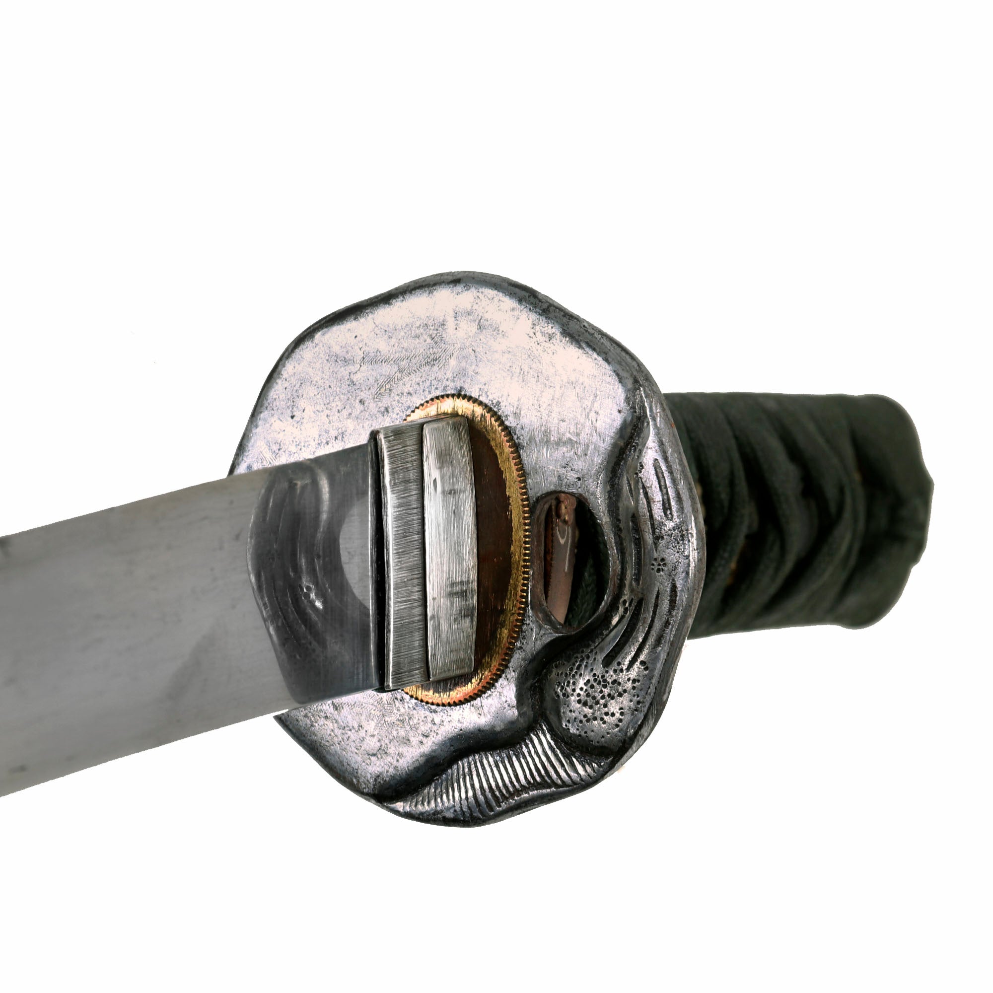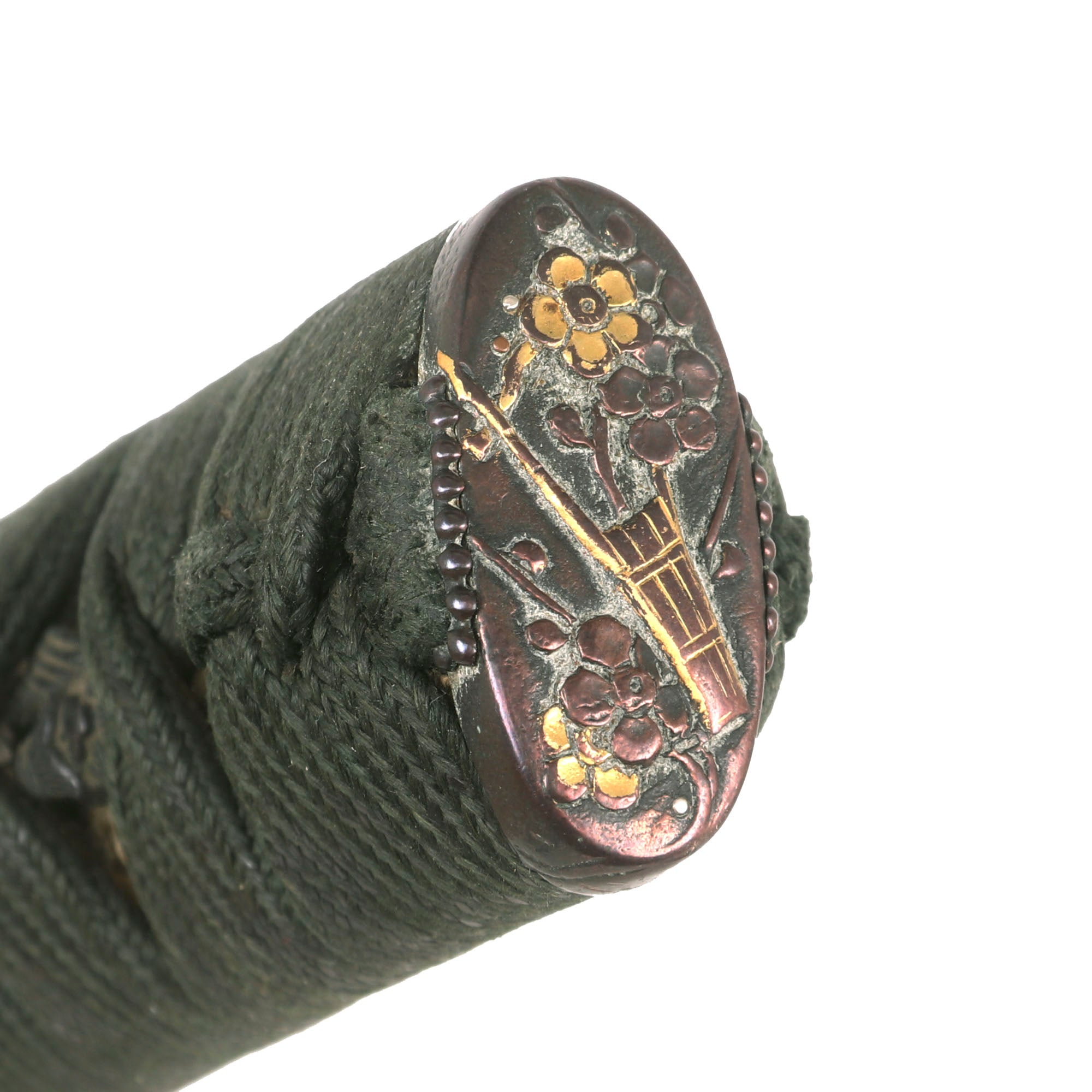 The stingray (Sa-Me) grip is in very good condition, with a nice dark green ITO grip wrapping, which holds the end cap in place. It is in good condition, showing moderate use, which has stained and discolored the wrapping a bit. There are two matching bronze menuki present, which look to be birds or fish, and are very well executed. The handle is held in place by a single securing peg, which looks to be quite old.