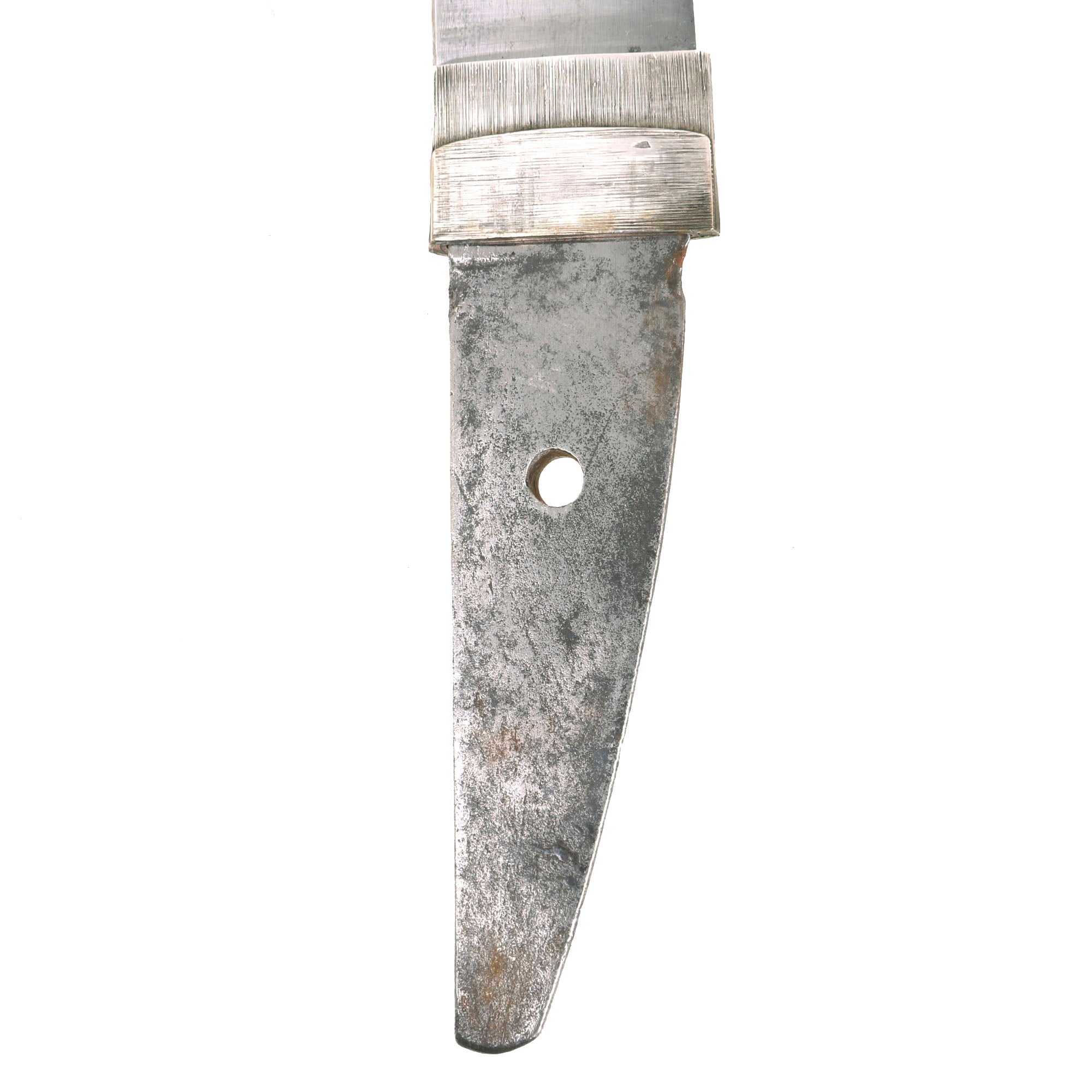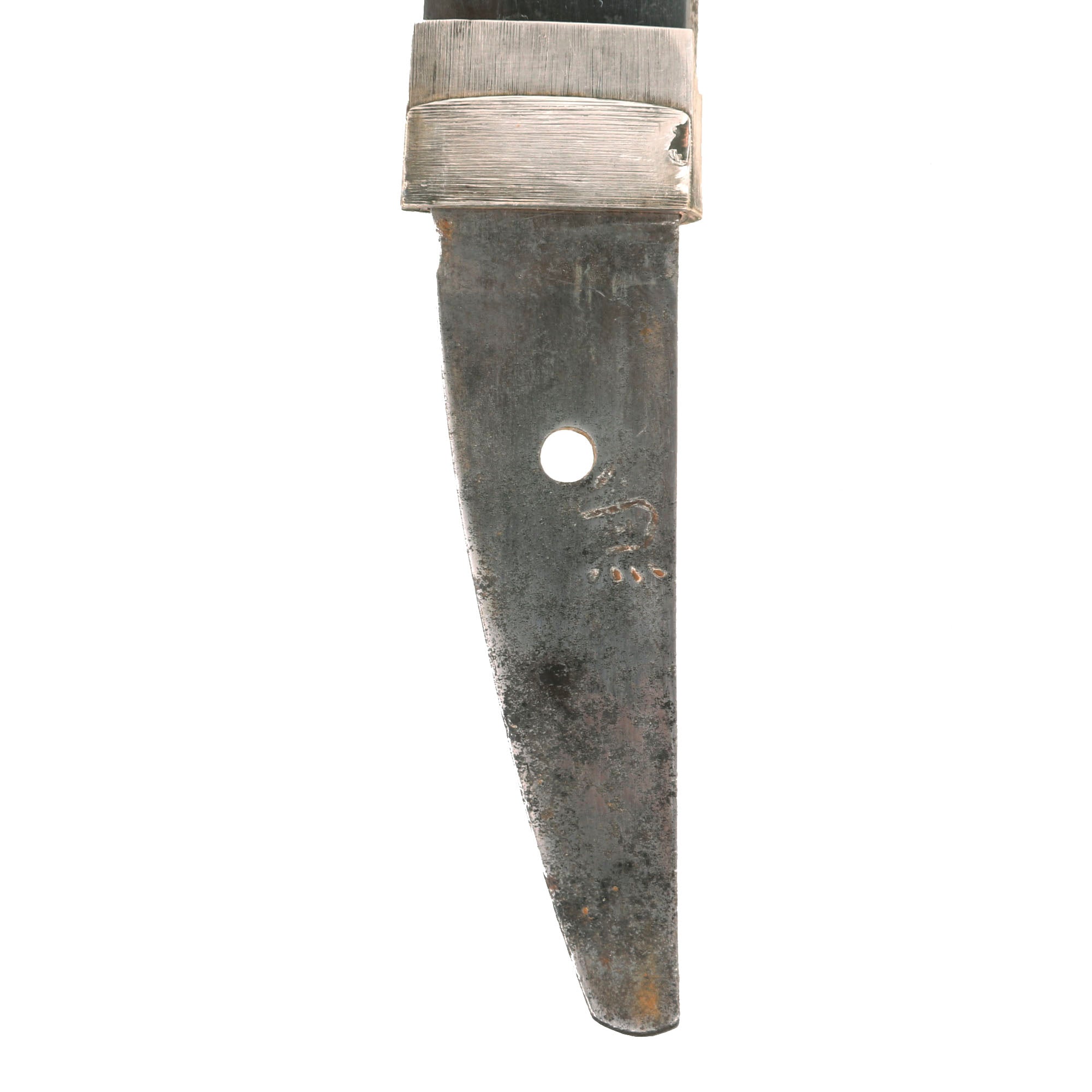 This example has most likely been remounted several times, as was common for Japanese blades. This has pretty much removed the YASURIME (鑢目 - file marks) on the tang faint, and given it a lovely worn patina. We can see war on the tang from a past set of fittings, and it does look like tight fitting handle has worn down the tang a bit. There is a single character we can see, 兼 - KANE, but this is not enough to identify any maker, so we would consider this blade to be 無銘 (mumei), or "anonymous".
