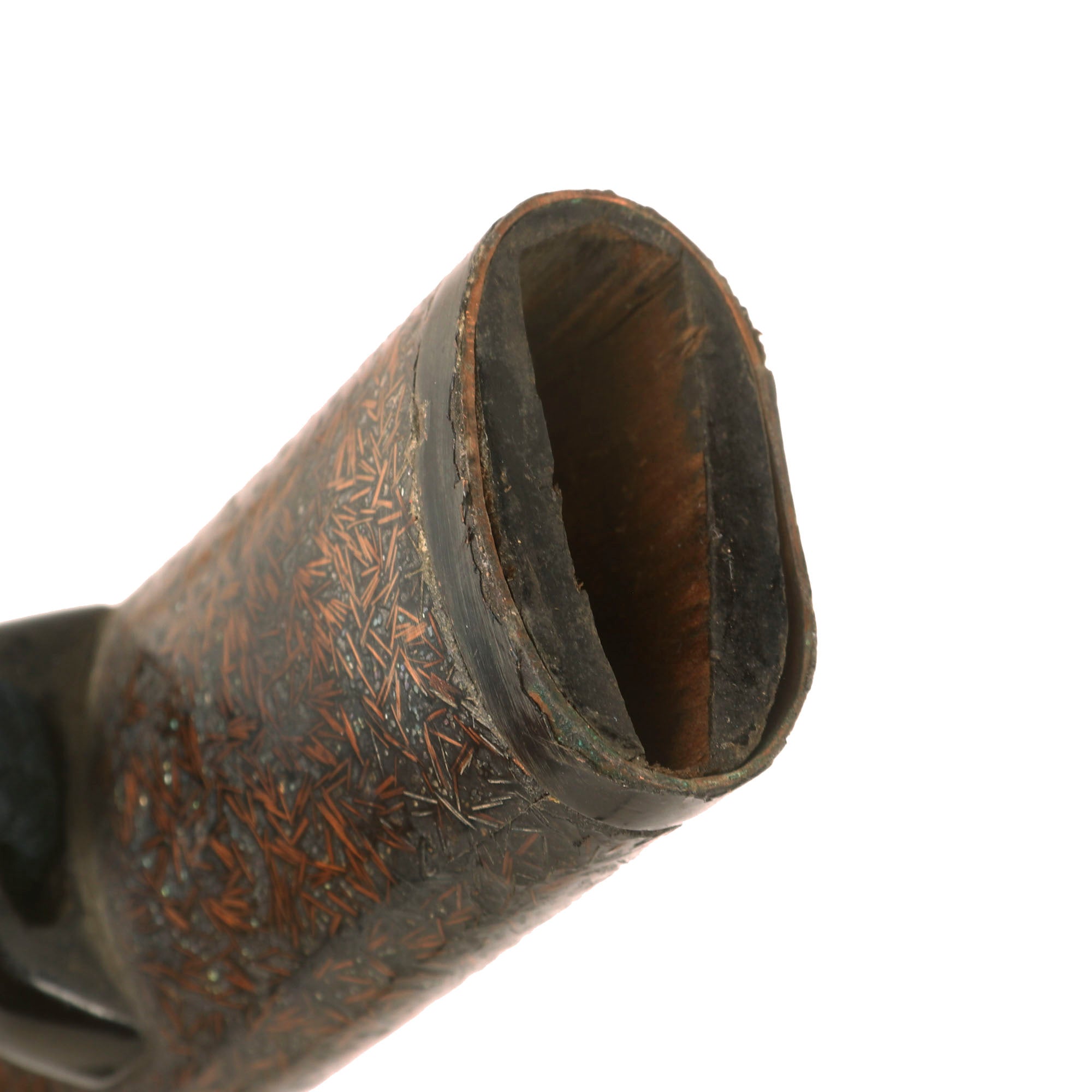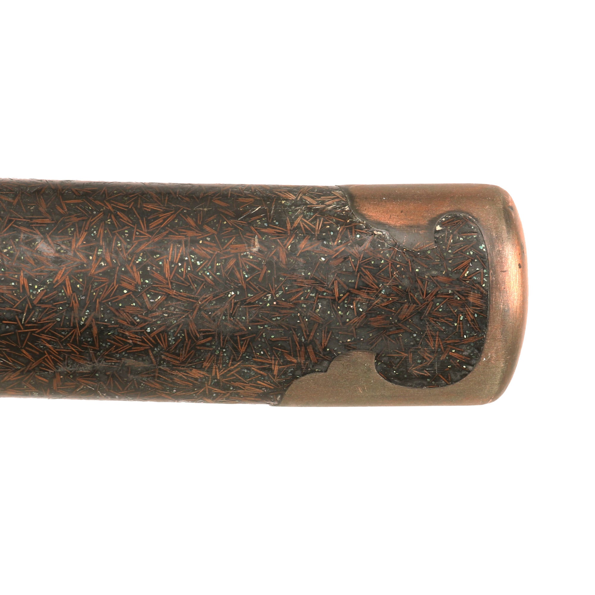 The sword comes in a a well fitting wooden scabbard (SAYA), which has a very nice decorative urushi lacquer finish, showing a fantastic pattern of orange bristles (possibly copper) with green sparks interspersed. The finish is still in very good shape, with a bit of cracking as we often see. One side of the SAYA has a slot for a KOGATANA knife, though there is not one included, and the roof of the channel has collapsed a bit. The other side has a KURIKATA (knob), which has black SAGEO sword cord fitted. The scabbard has a great copper KASHIRA end cap, and is definitely one of the most interesting scabbards we have seen in some time!