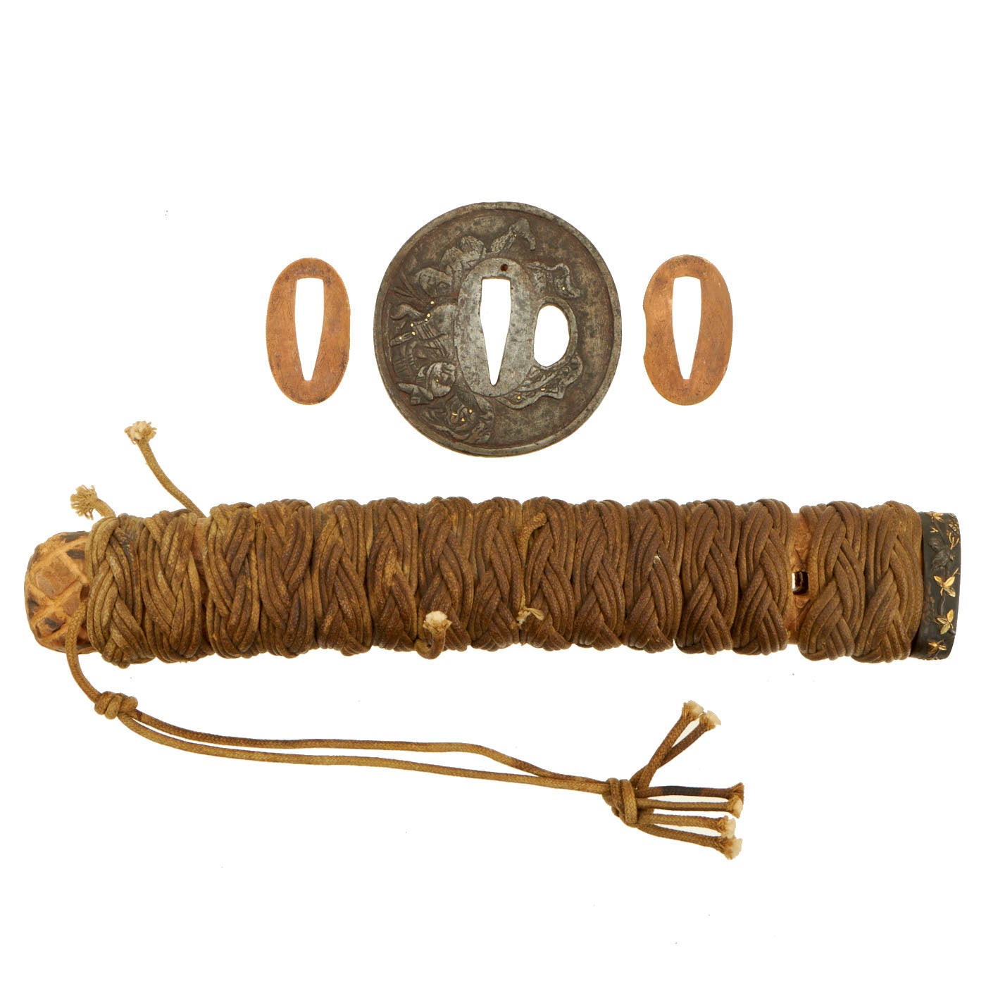 The katana has a silver plated engraved Habaki (blade collar), which is typical of the Edo period. The tsuba (cross guard) is made of iron and is the Maru Gata (round) shape, embossed with various Japanese motifs. There are small brass or silver inlays in the eyes of some of the designs, as well as in other places. There is a Hitsu-ana for a scabbard lock on one side, and it is surrounded by two seppa (spacers) The fuchi (collar) for the tsuka (handle) is non magnetic, and looks to be made of bronze, with some gilt designs on one side. The plaited cord wrapping is in good condition, though part at the bottom has torn away. The handle is retained by a single peg, which looks to be a replacement.