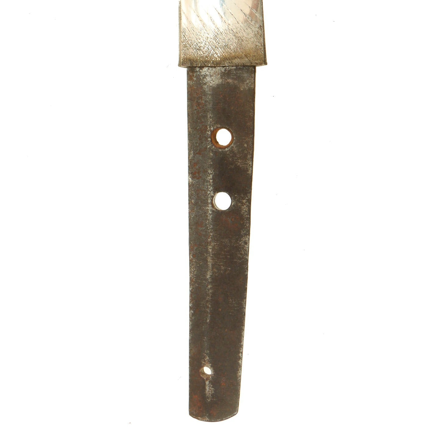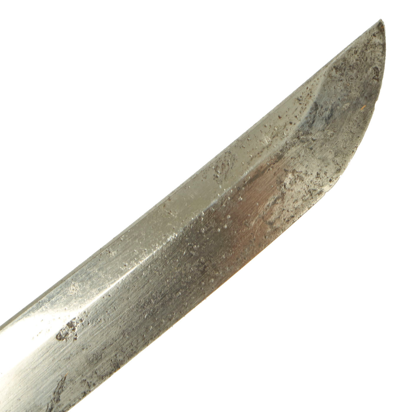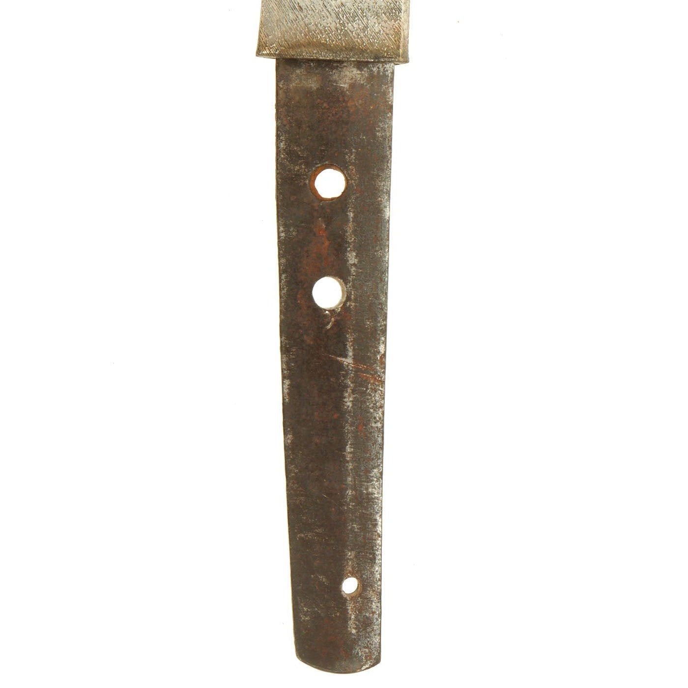 This example has most likely been remounted several times, as was common for Japanese blades. This has made the file marks (yasurime) on the tang faint, and given it a lovely patina. There are two holes (mekugi-ana) in the tang, so the cutting edge may have been somewhat longer previously. There is also a smaller hole drilled towards the bottom of the tang, but we believe it is a WWII modification. As there is no maker name on the tang, this blade is considered 無名 (mumei), or "anonymous".