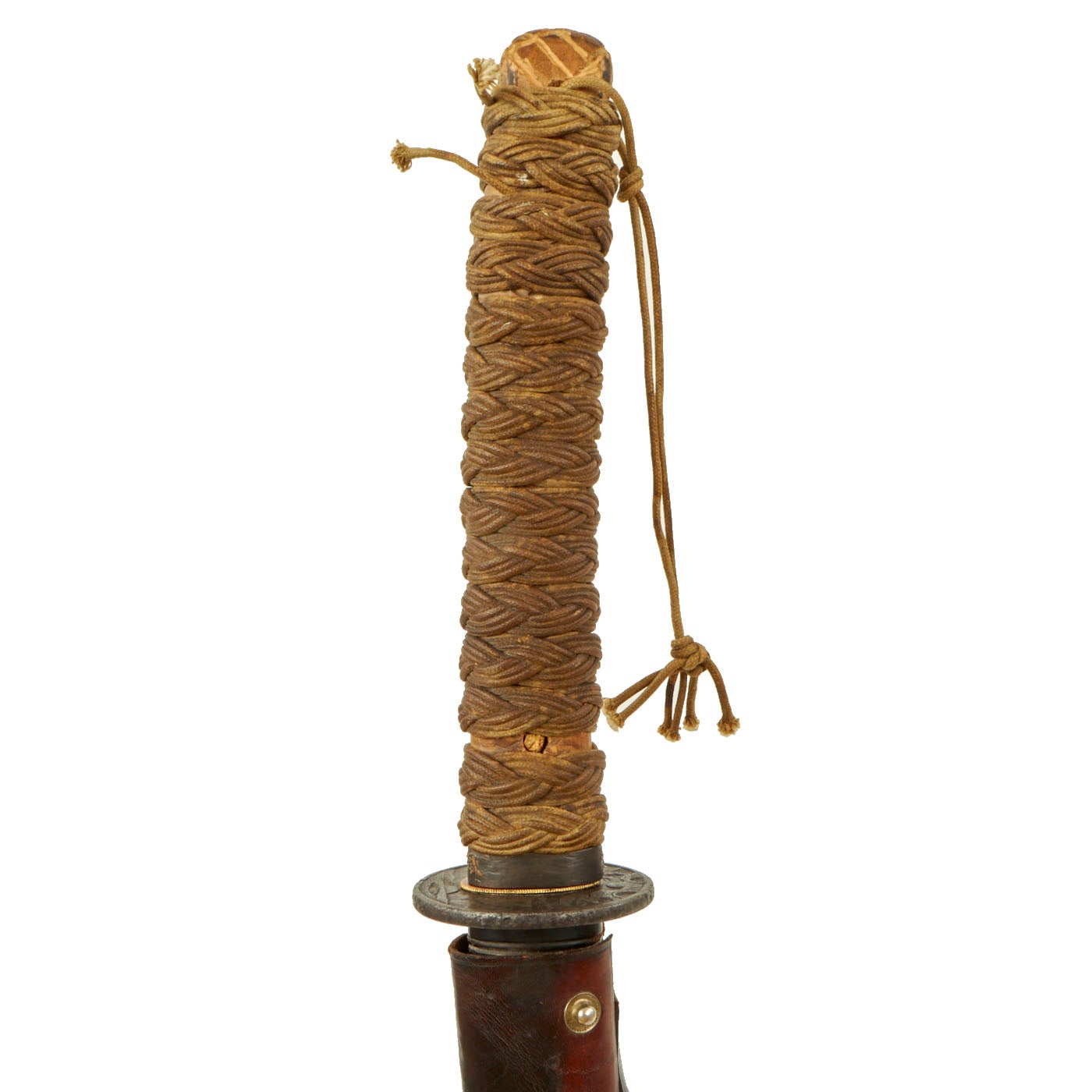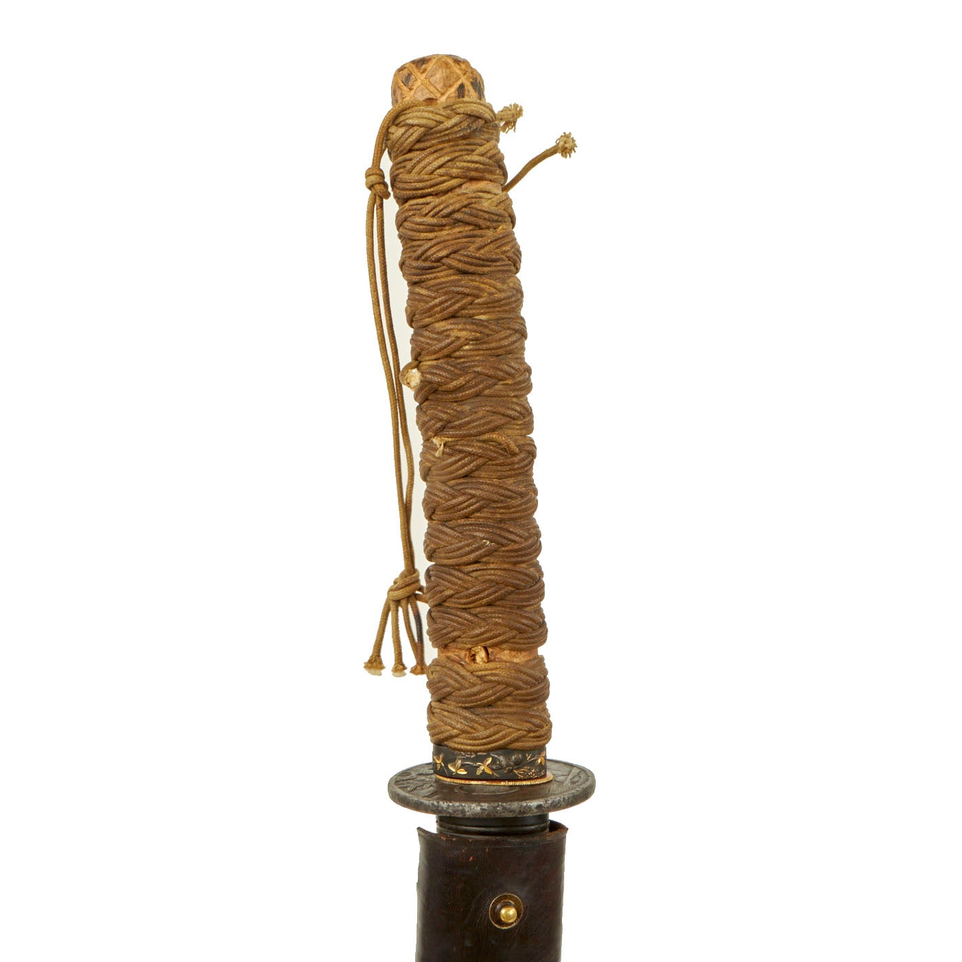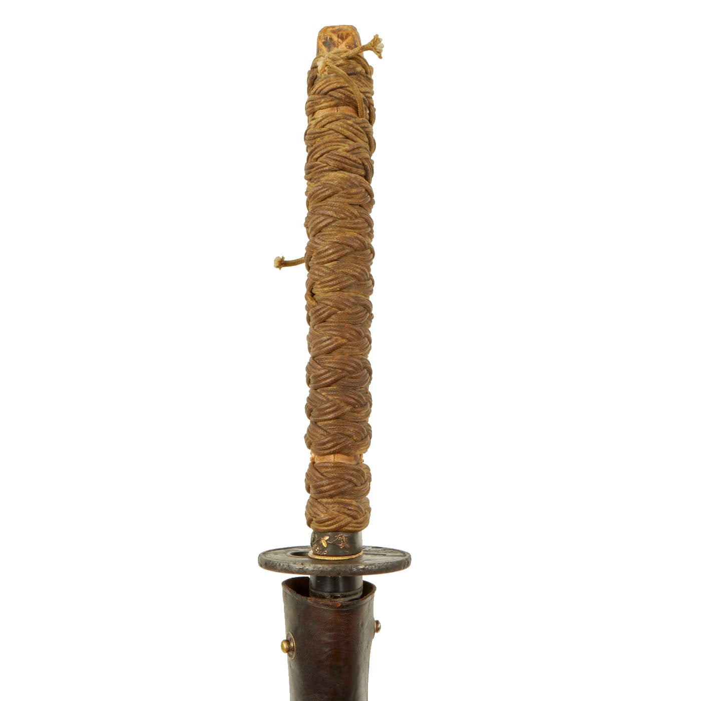 This example dates from the Edo period (江戸時代, Edo jidai) or Tokugawa period (徳川時代, Tokugawa jidai) of Japanese history. This is the period between 1603 and 1867, when Japan was under the rule of the Tokugawa shogunate and the country's 300 regional daimyo. We estimate it was from the early 17th century portion. Apparently during WWII it looks to have been put back into service, and mounted in a WWII style leather scabbard cover, and had a new hilt (tsuka) fitted, made of wood covered with plaited cord. We assume this was a "last ditch" modification late in the war.