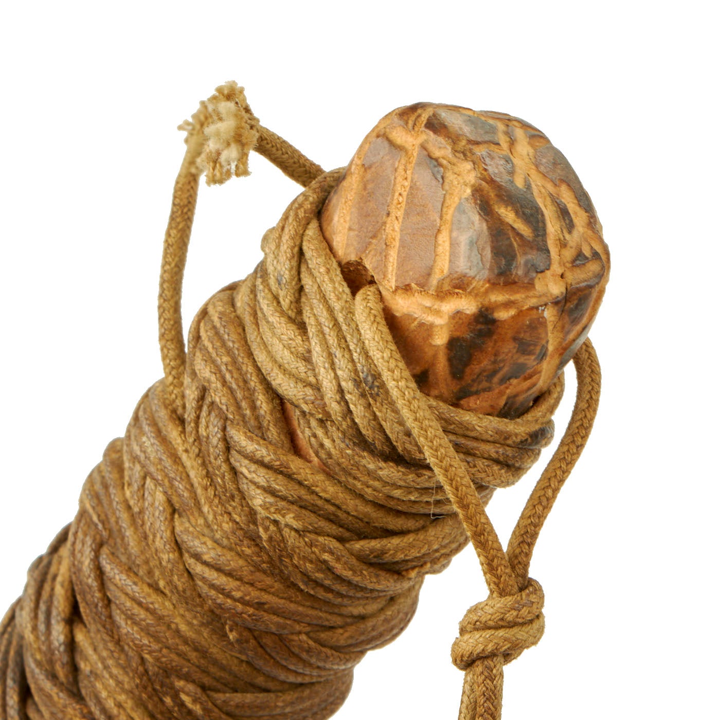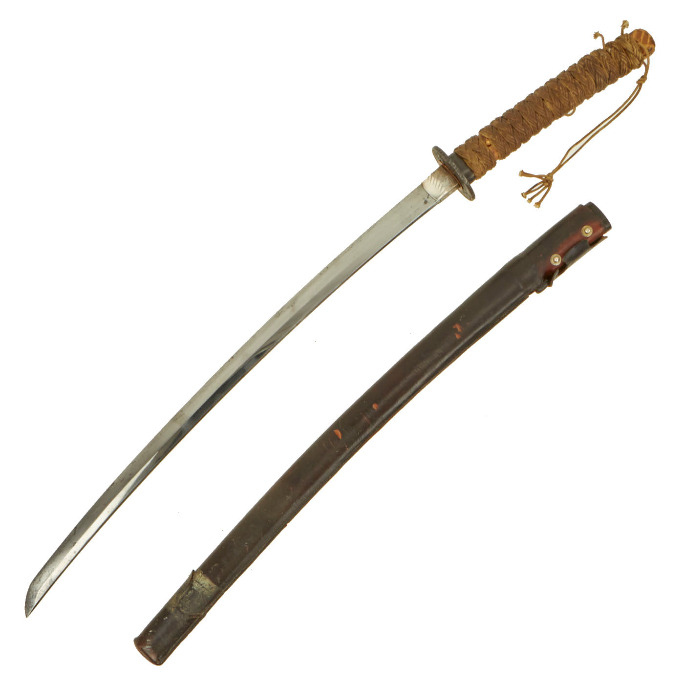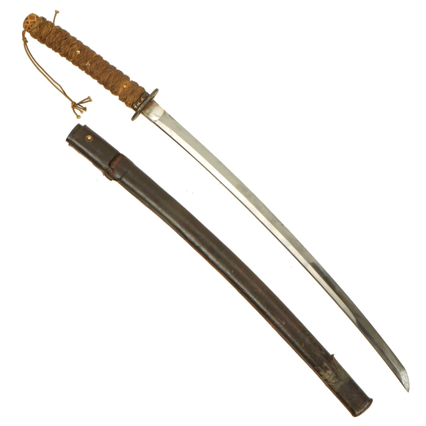 This example dates from the Edo period (江戸時代, Edo jidai) or Tokugawa period (徳川時代, Tokugawa jidai) of Japanese history. This is the period between 1603 and 1867, when Japan was under the rule of the Tokugawa shogunate and the country's 300 regional daimyo. We estimate it was from the early 17th century portion. Apparently during WWII it looks to have been put back into service, and mounted in a WWII style leather scabbard cover, and had a new hilt (tsuka) fitted, made of wood covered with plaited cord. We assume this was a "last ditch" modification late in the war.