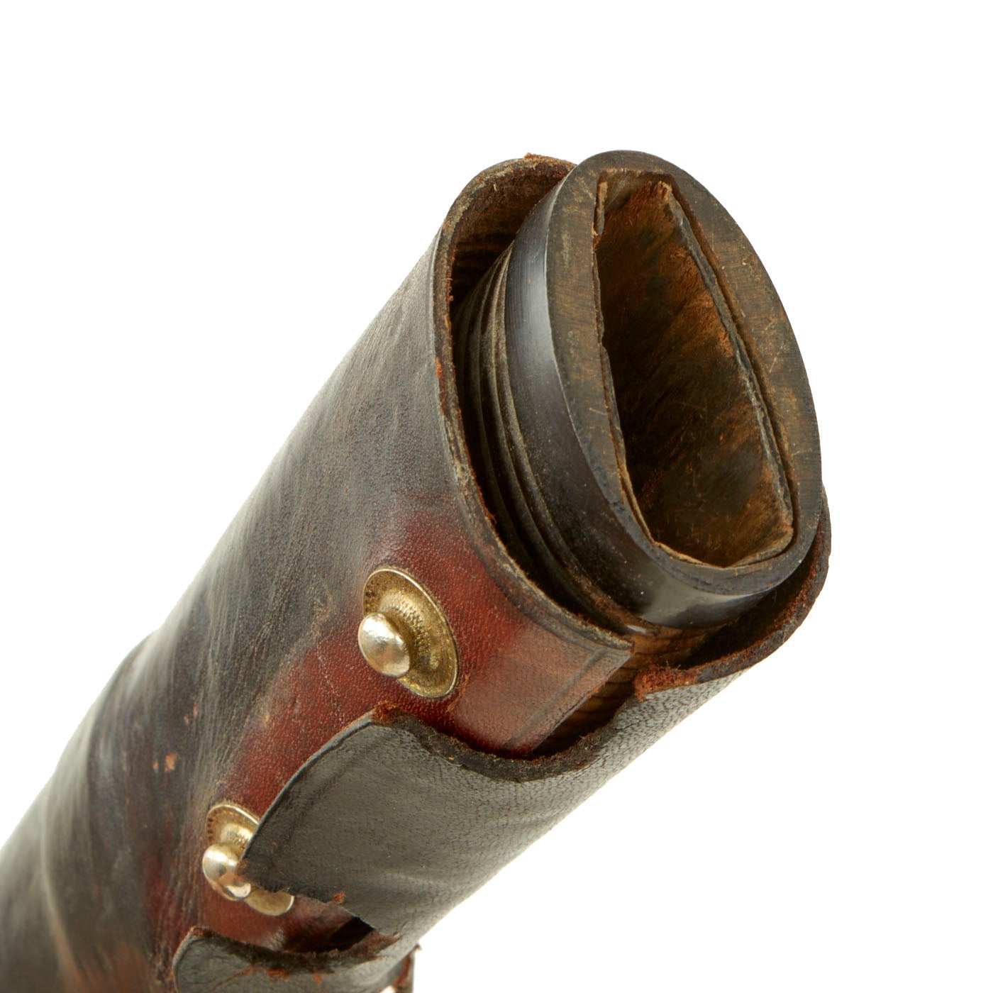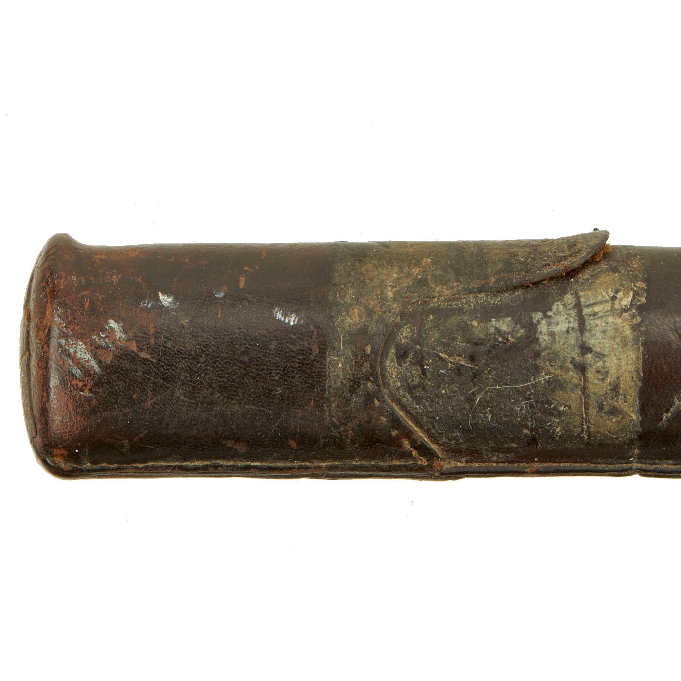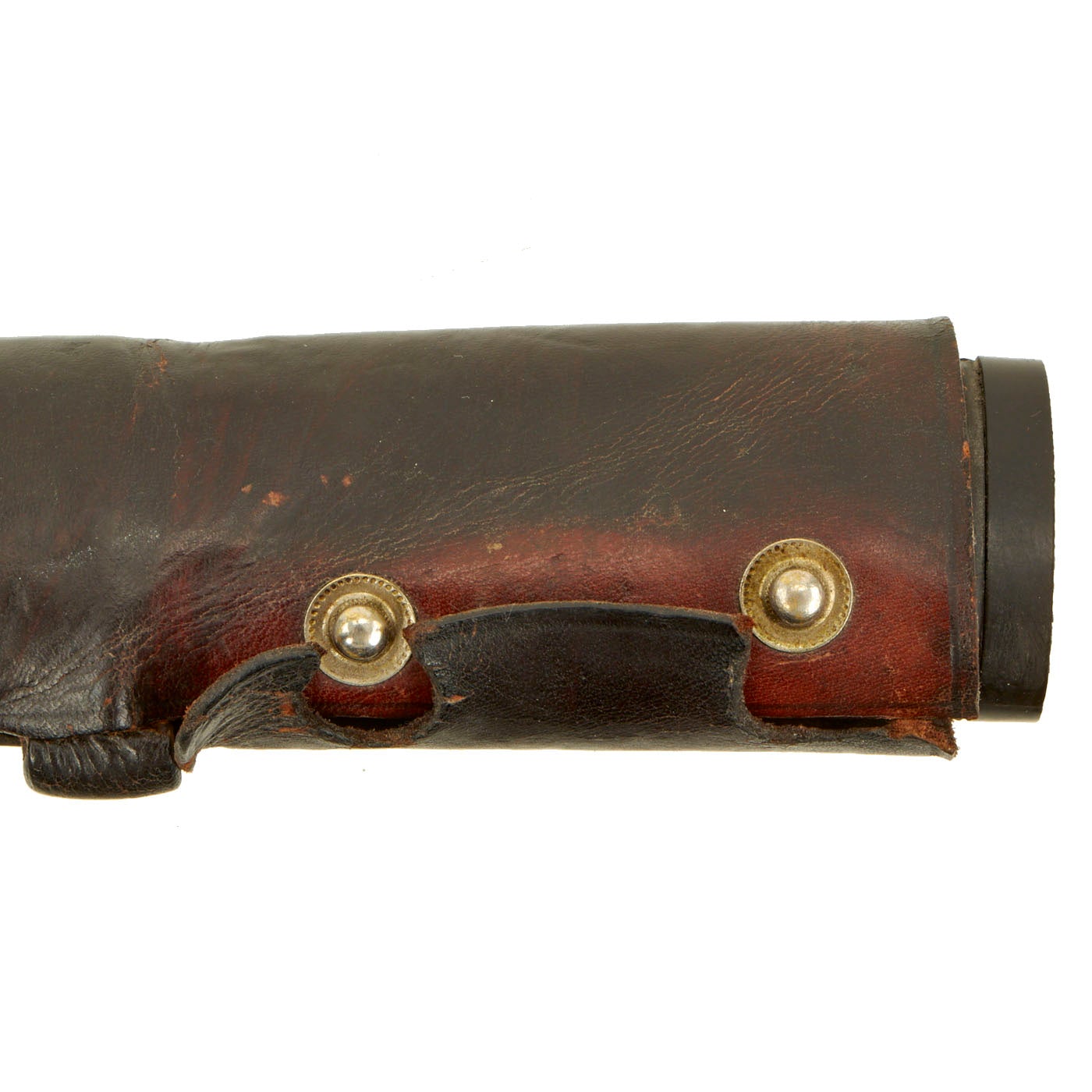The sword comes in a a well fitting ribbed and lacquered wooden scabbard (saya), which was fitted with a hanger ring and leather field cover during the WWII period. The original kurikata (knob) was removed, and a leather hanger installed next to where it used to be, before the covered as fitted. There originally would have been a leather spacer to attach to the snap on the cover, but that is unfortunately missing.