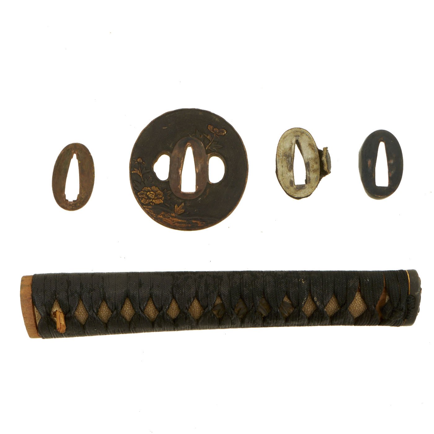 The HABAKI (blade collar) is copper or bronze, very common on Edo period blades. The tsuba (cross guard) is made of blacked copper and is round, with brass flower and leaf inlays, and there are embossed dog designs on the blade side. It also has cutouts for a kogatana handle on each side. The fuchi (collar) for the tsuka (handle) is non magnetic, as is the Kashira (End Cap), and there are two menuki (grip ornaments) present, which look to be leaves or flowers. The stingray (Sa-Me) grip with complete Ito (cloth binding) is worn, but still in good condition. The handle is retained by a single peg, which is somewhat damaged.