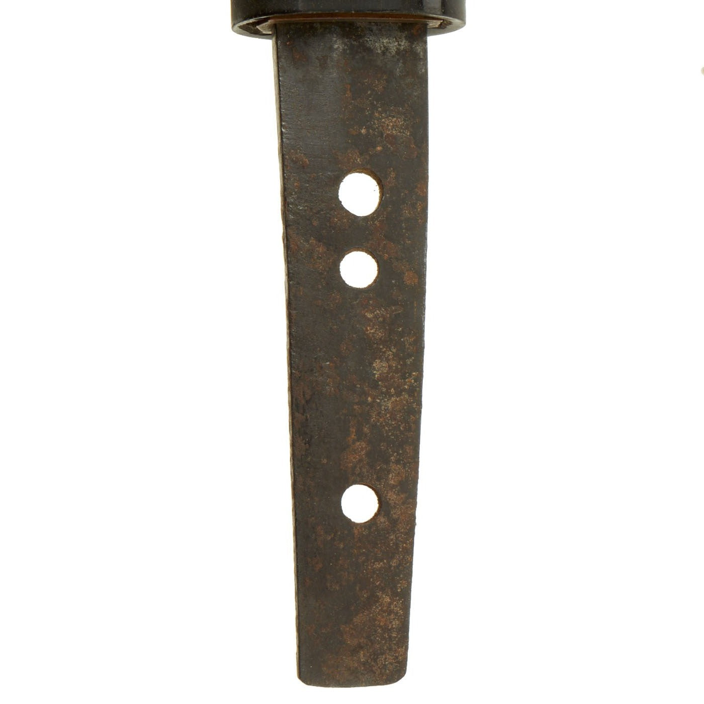 - Blade wounds (kizu) or lamination artifacts are present on the blade. Both ware (lamination lines) and fukure (carbon pits) are visible.