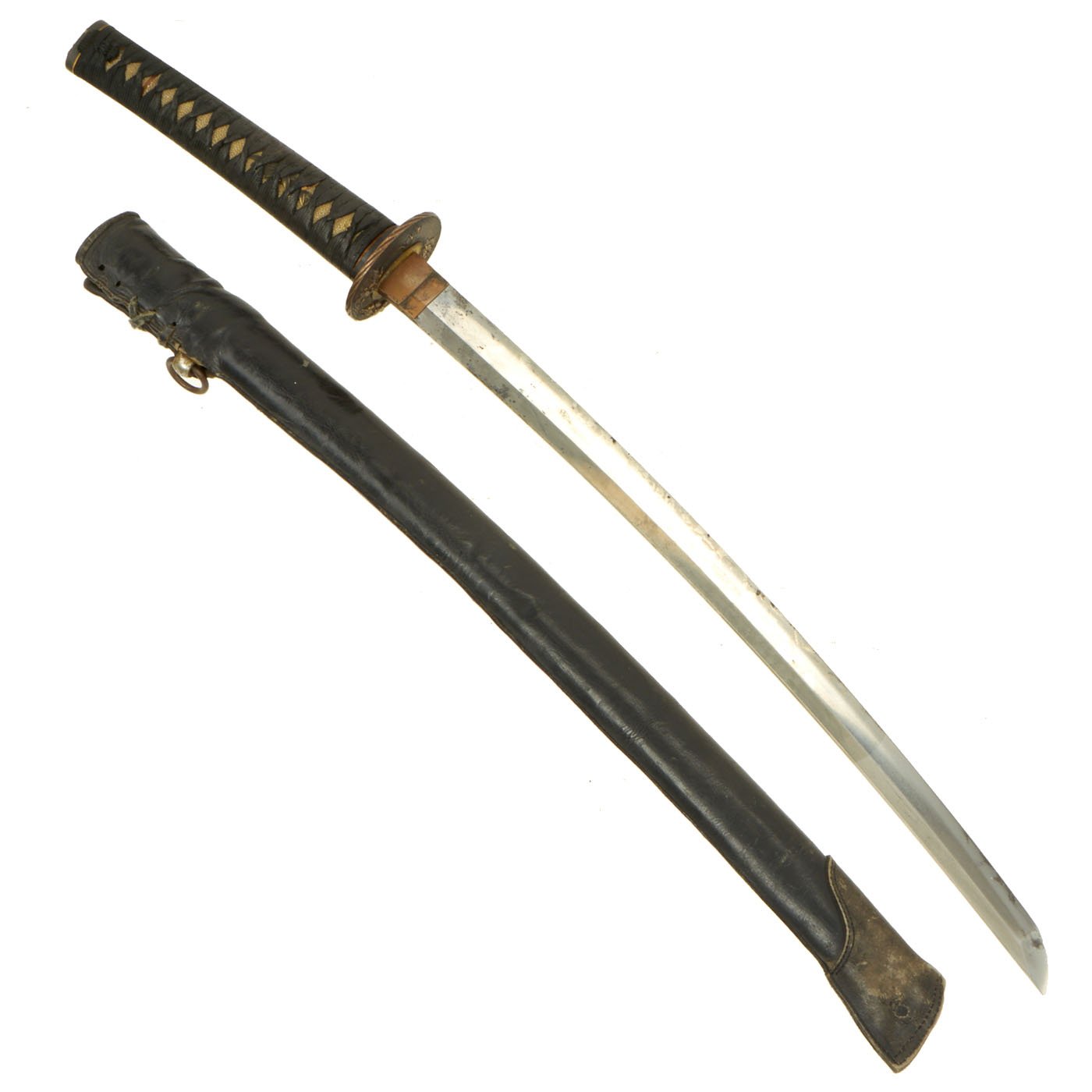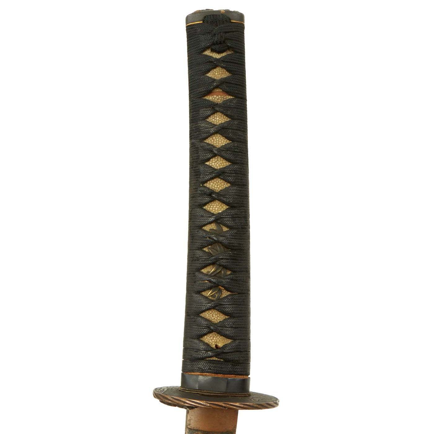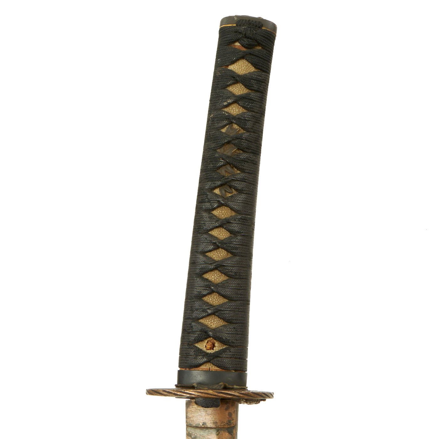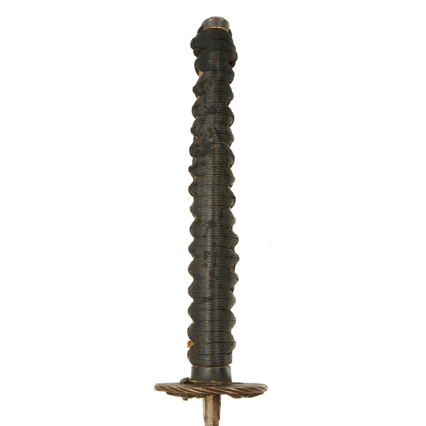 This example dates from the Edo period (江戸時代, Edo jidai) or Tokugawa period (徳川時代, Tokugawa jidai) of Japanese history. This is the period between 1603 and 1867, when Japan was under the rule of the Tokugawa shogunate and the country's 300 regional daimyo. We estimate it was from the early 17th century portion. Apparently during WWII it looks to have been put back into service, and mounted in a WWII style leather scabbard cover, which now looks to also have the remnants of a "capture tag" glued on, from when it was turned in after WWII.