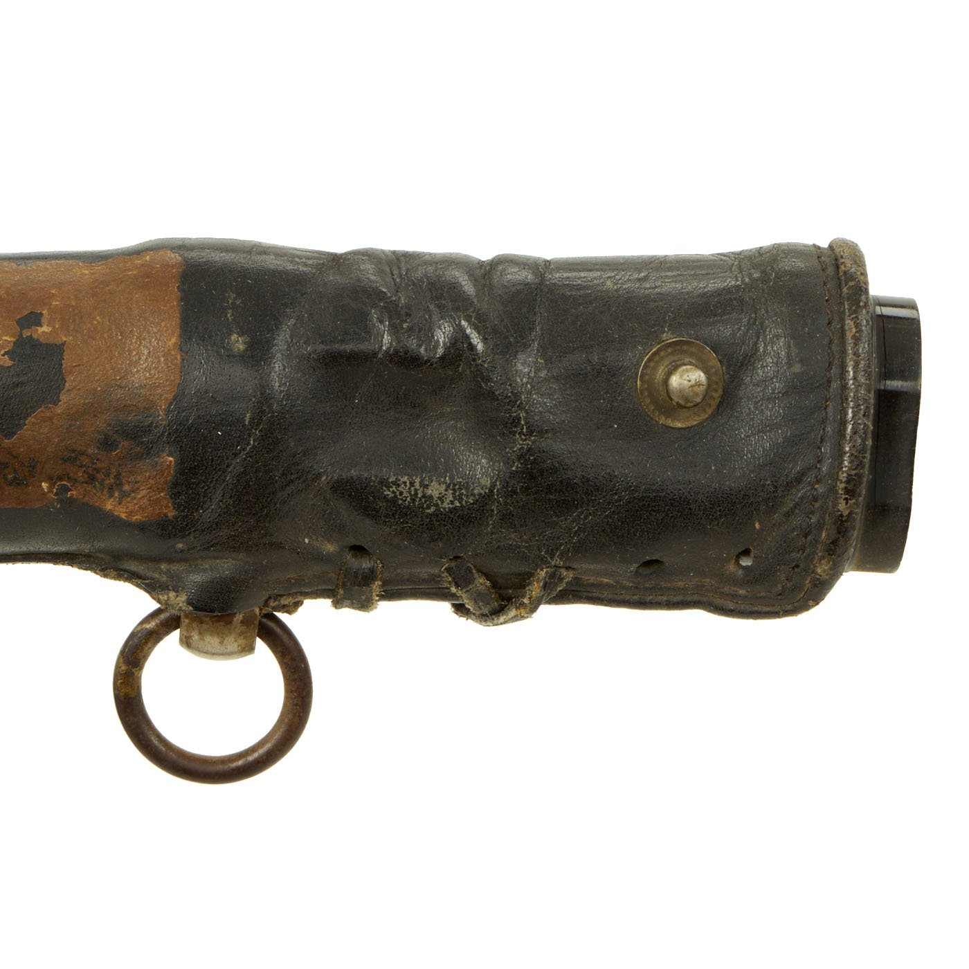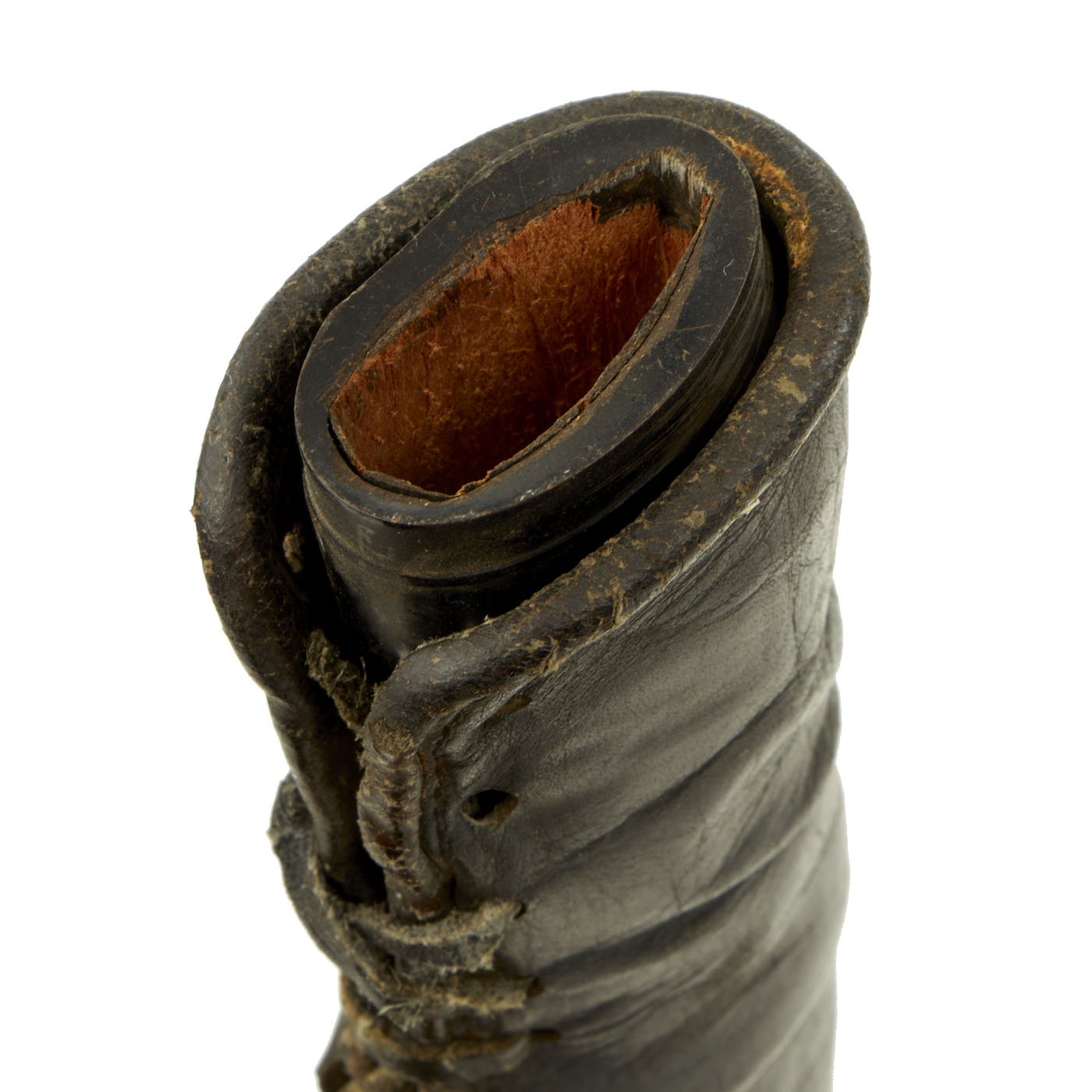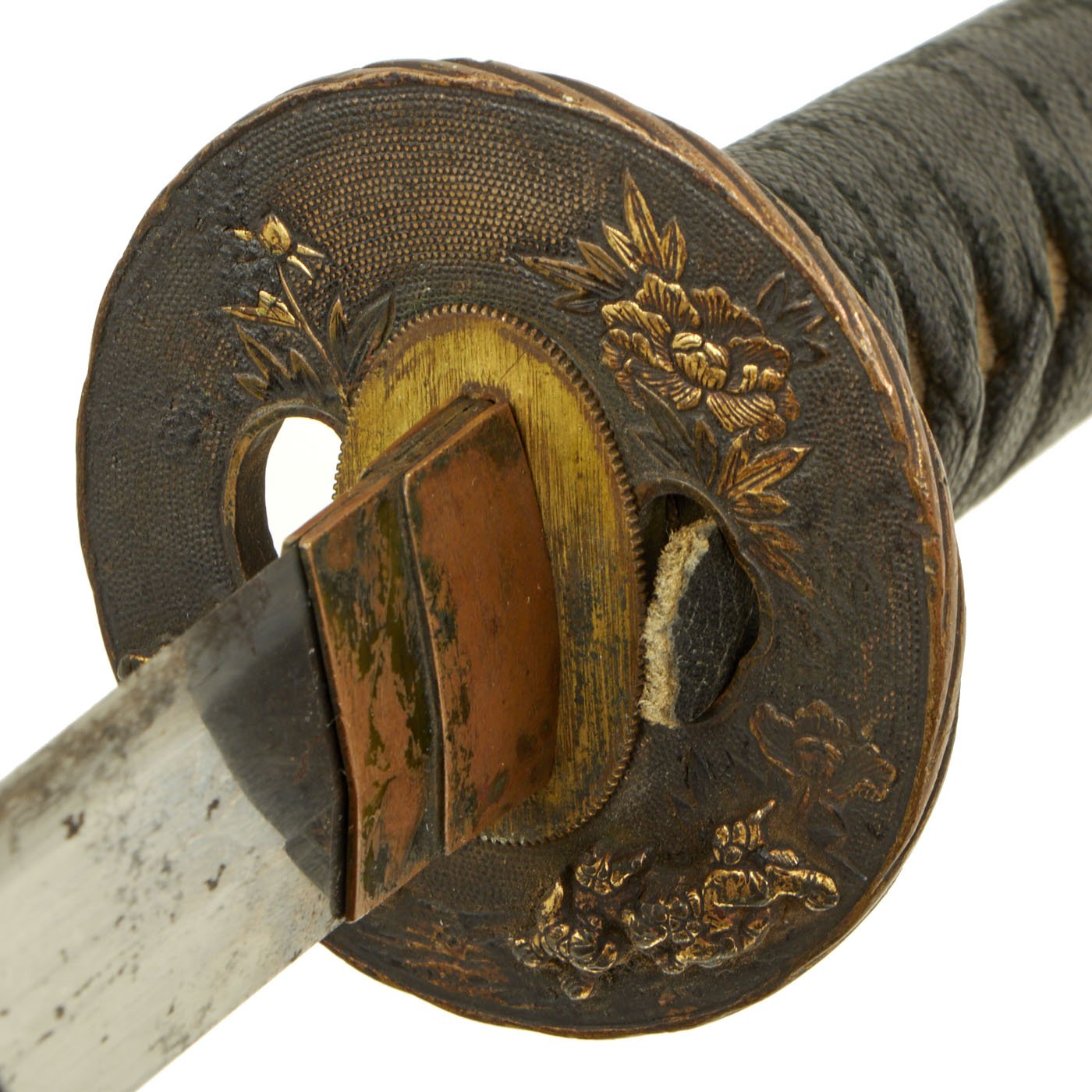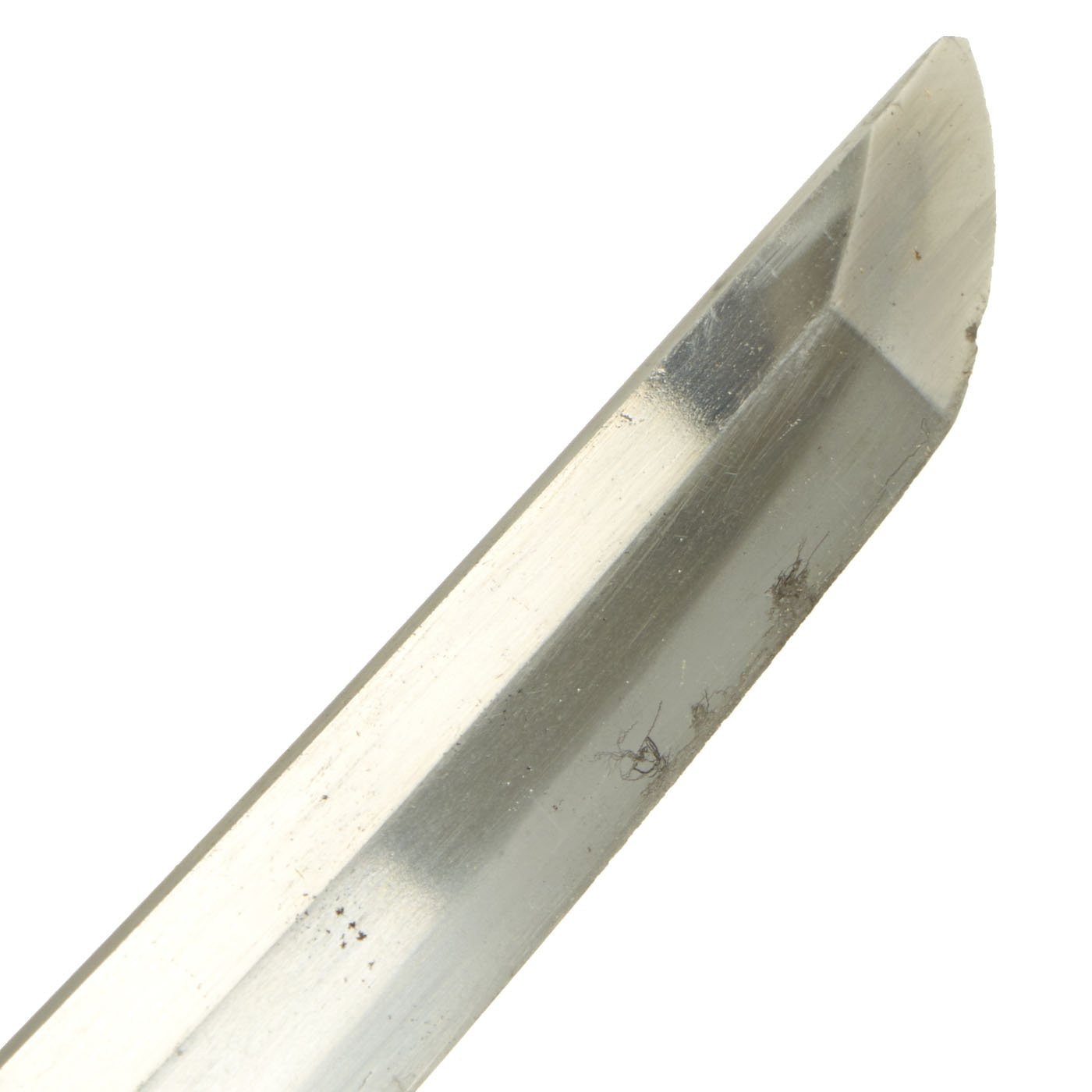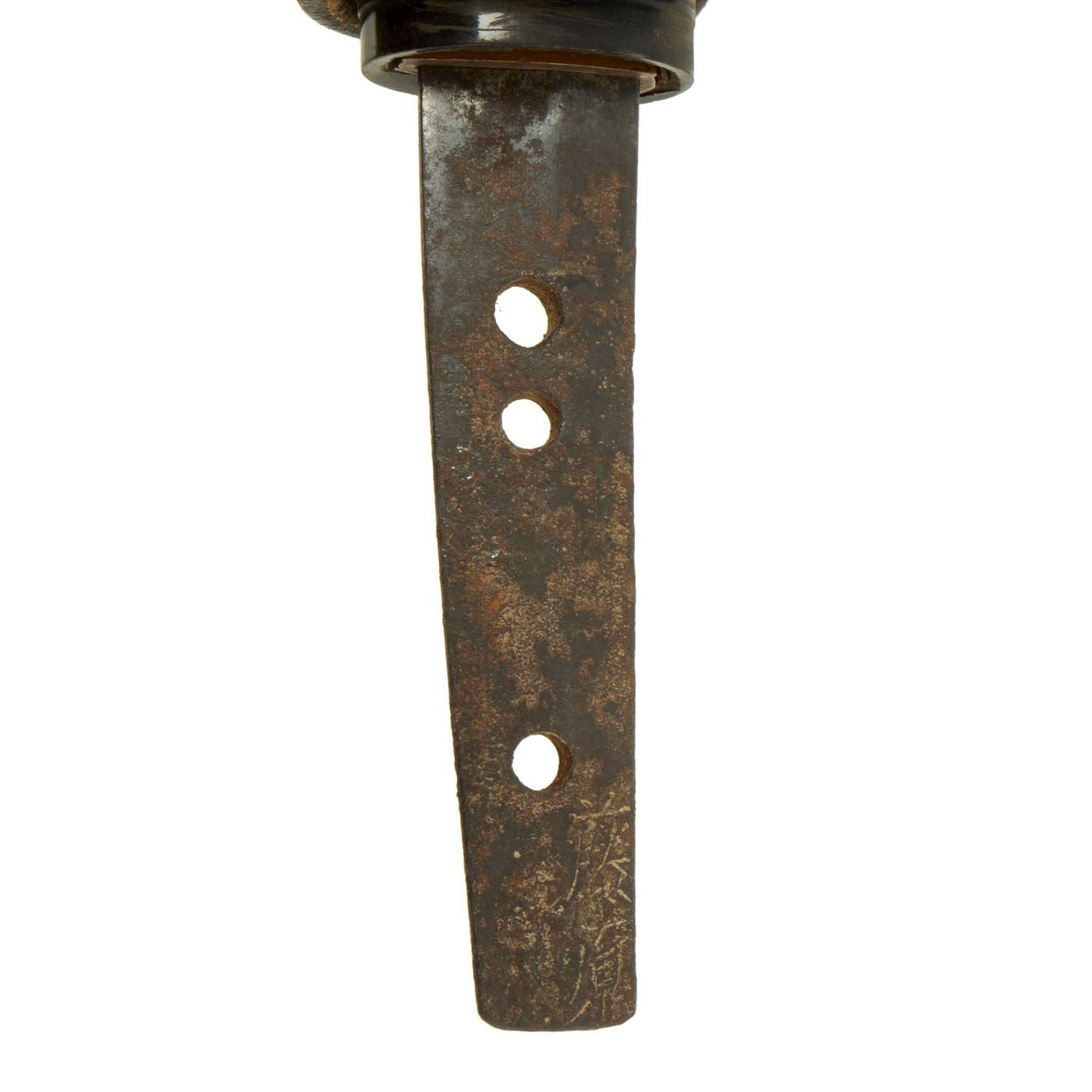This example dates from the Edo period (江戸時代, Edo jidai) or Tokugawa period (徳川時代, Tokugawa jidai) of Japanese history. This is the period between 1603 and 1867, when Japan was under the rule of the Tokugawa shogunate and the country's 300 regional daimyo. We estimate it was from the early 17th century portion. Apparently during WWII it looks to have been put back into service, and mounted in a WWII style leather scabbard cover, which now looks to also have the remnants of a "capture tag" glued on, from when it was turned in after WWII.