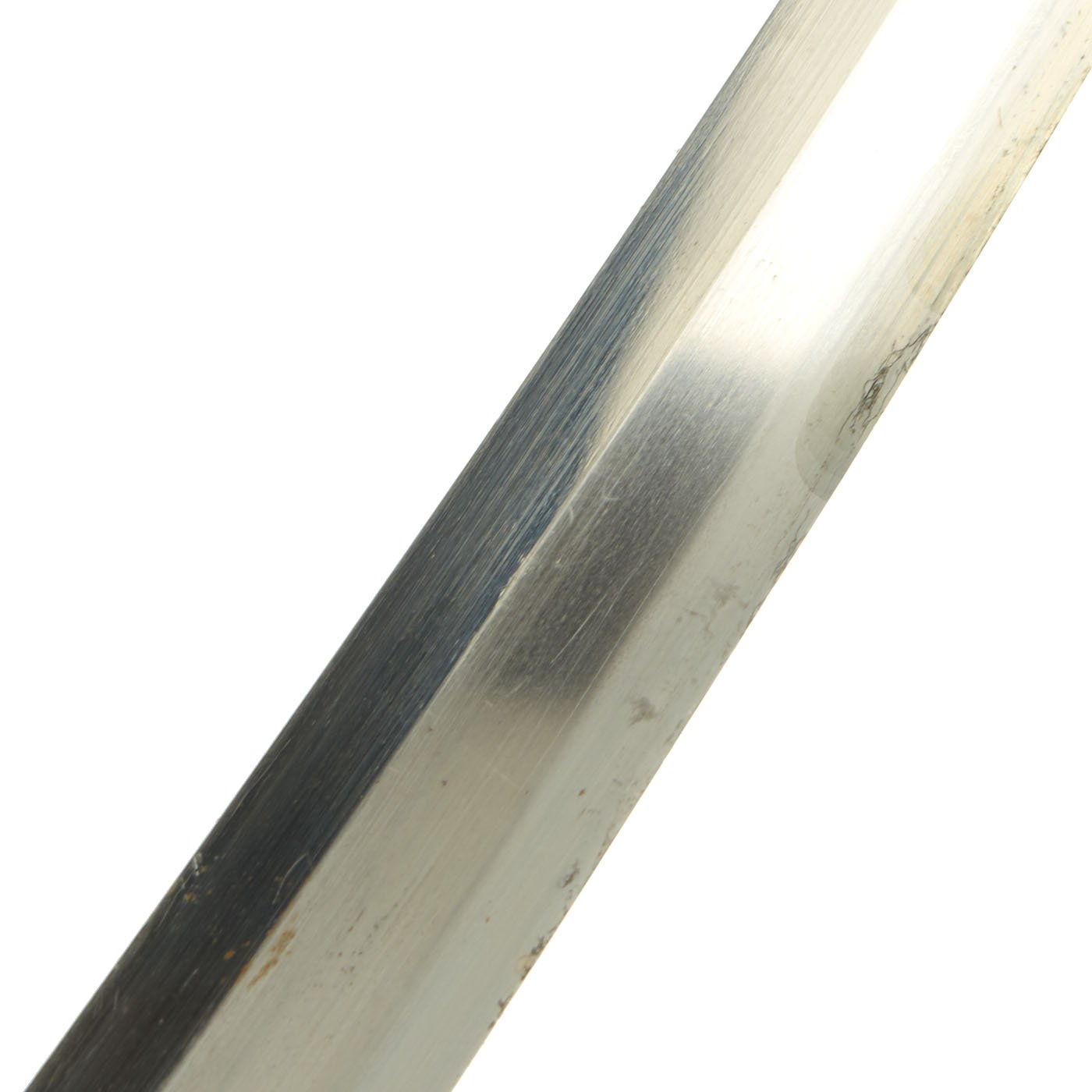 The HAMON (temper line) is still visible, and is of the SUGUHA (straight) type. NIE Crystals are visible, and there is NIOI cloudiness visible in the hamon with lamination lines. The YOKOTE (division between the tip and body) is still fully visible, as is the BOSHI (tip temper line), which is a very attractive OOMARU (large turnback) type. There is visible HADA (grain) in the body of the blade, which is the standard MASAME (straight) type. The tang (nakago) is of the Futsu 普通 (regular) style, with a "kiri" (cut) tip, as is typical for a cut down blade.