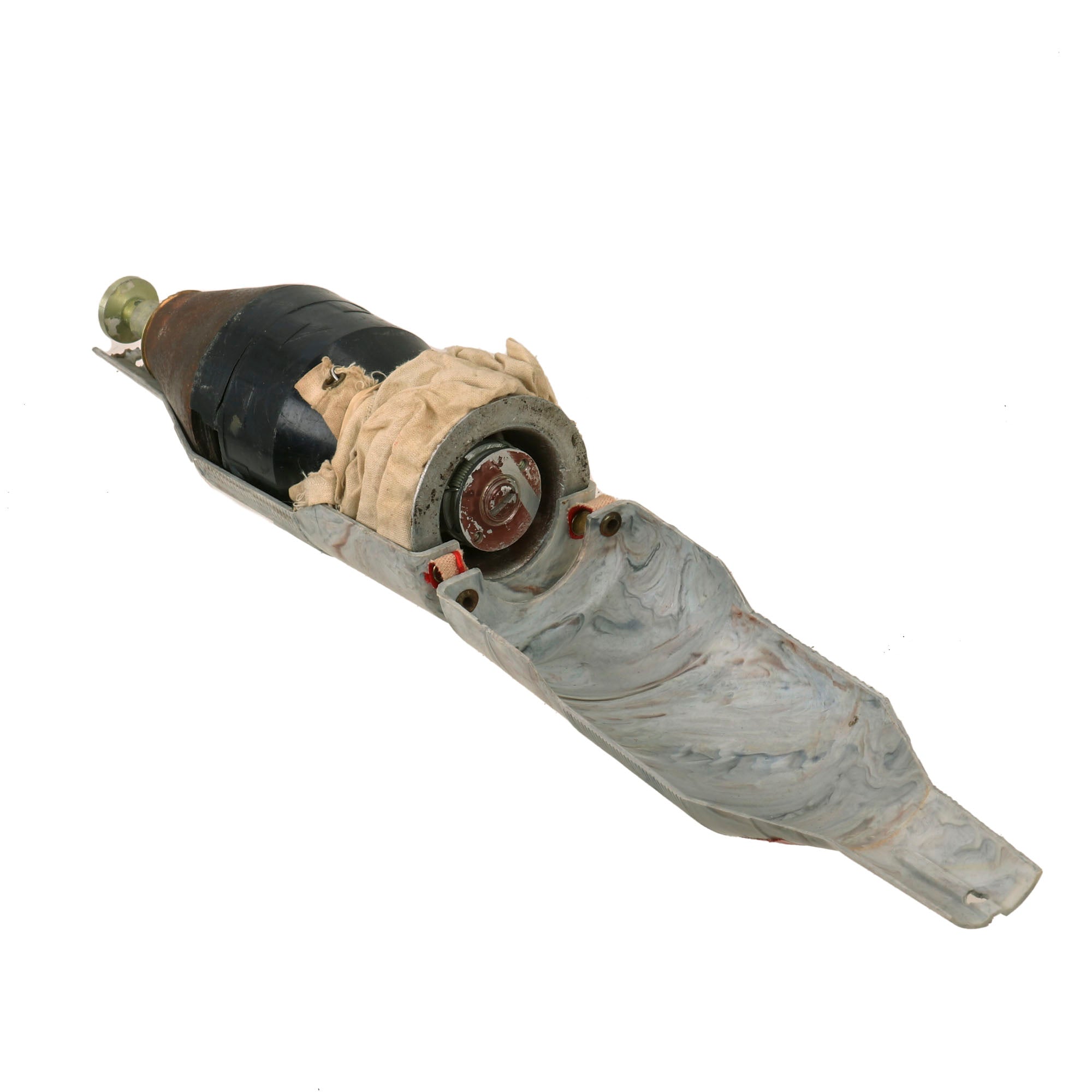 As the outer cover falls away from the grenade a spring is released which deploys a tube-shaped cloth stabilizer which is slightly torn in places and stained, but still appears to be complete.
