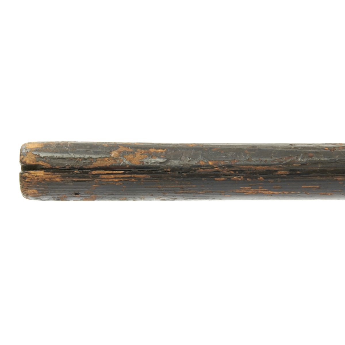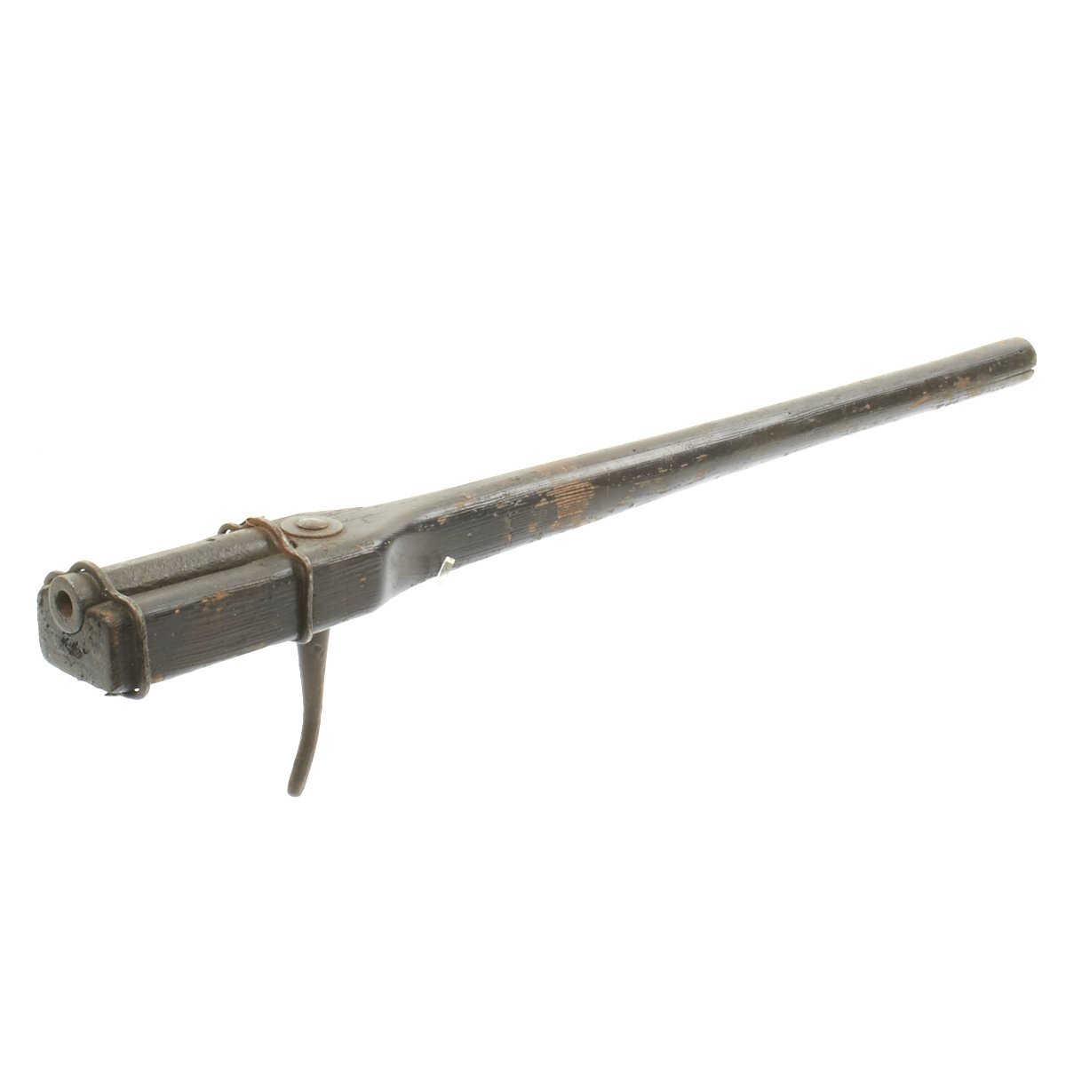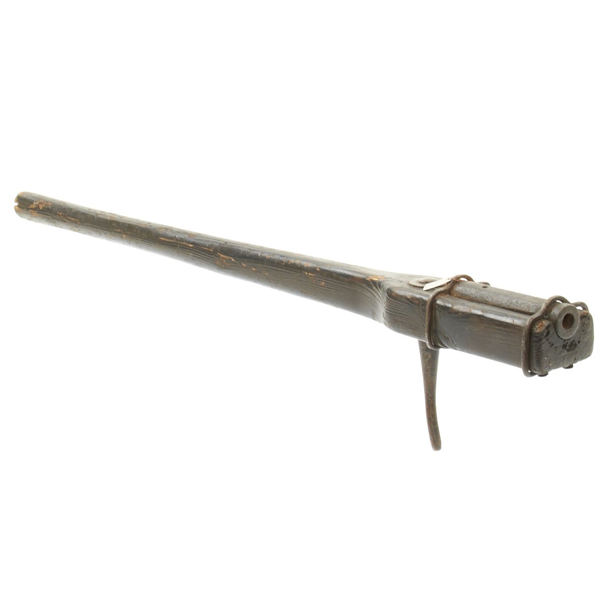 The iron barrel is original to the late 1400s to the early 1500s, and the rest is Victorian restoration to what it looked like in its working life. The Tower Armories had many totally original examples to base their accurate restorations upon.What we have measures about 31" in overall length made of a wood stock that is perfectly straight with a widened bulge towards the from to accommodate the barrel, which is held in place by two hand forged iron rings.