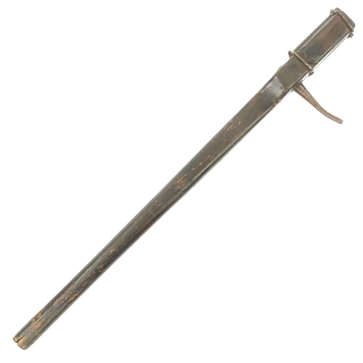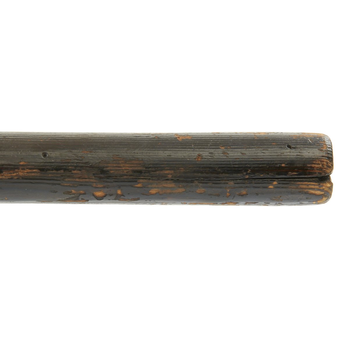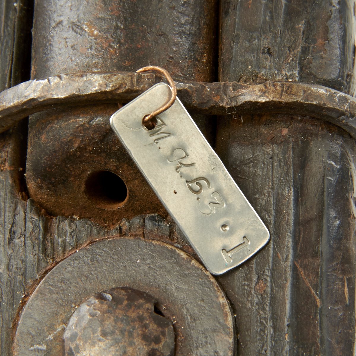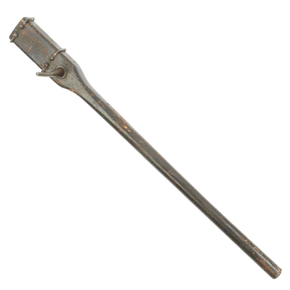 The iron barrel is original to the late 1400s to the early 1500s, and the rest is Victorian restoration to what it looked like in its working life. The Tower Armories had many totally original examples to base their accurate restorations upon.What we have measures about 31" in overall length made of a wood stock that is perfectly straight with a widened bulge towards the from to accommodate the barrel, which is held in place by two hand forged iron rings.