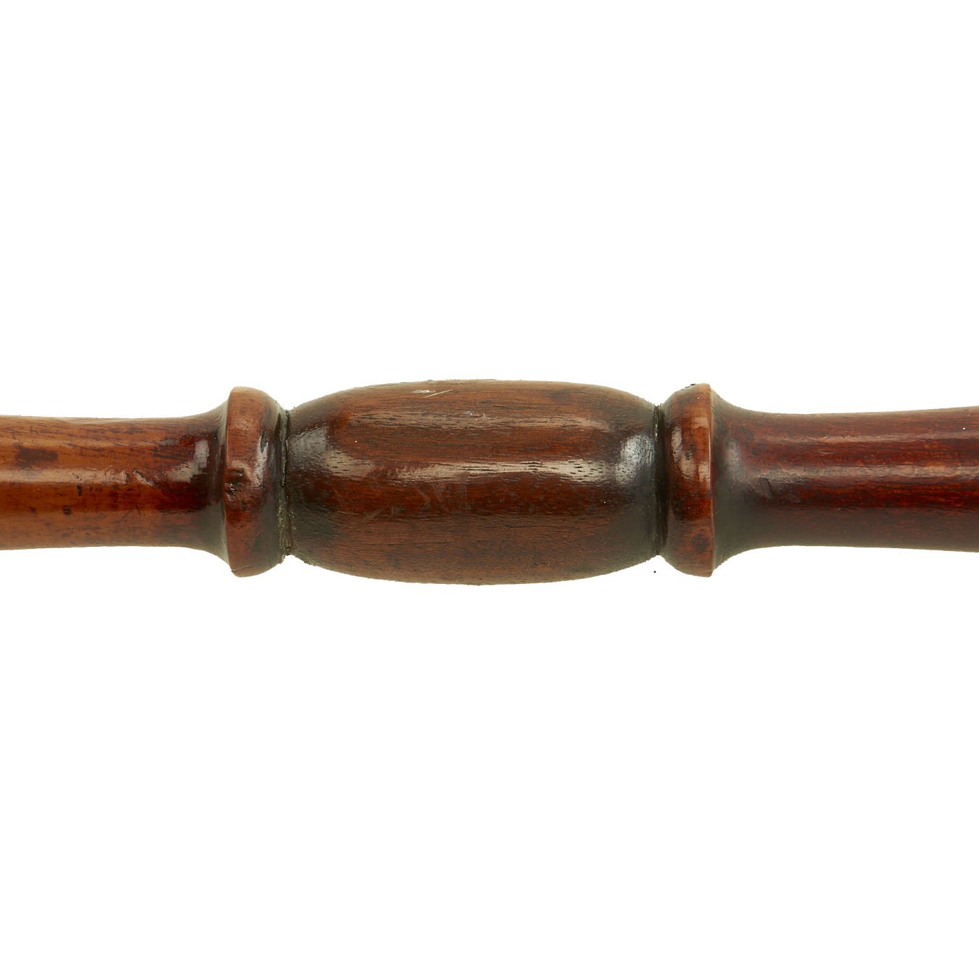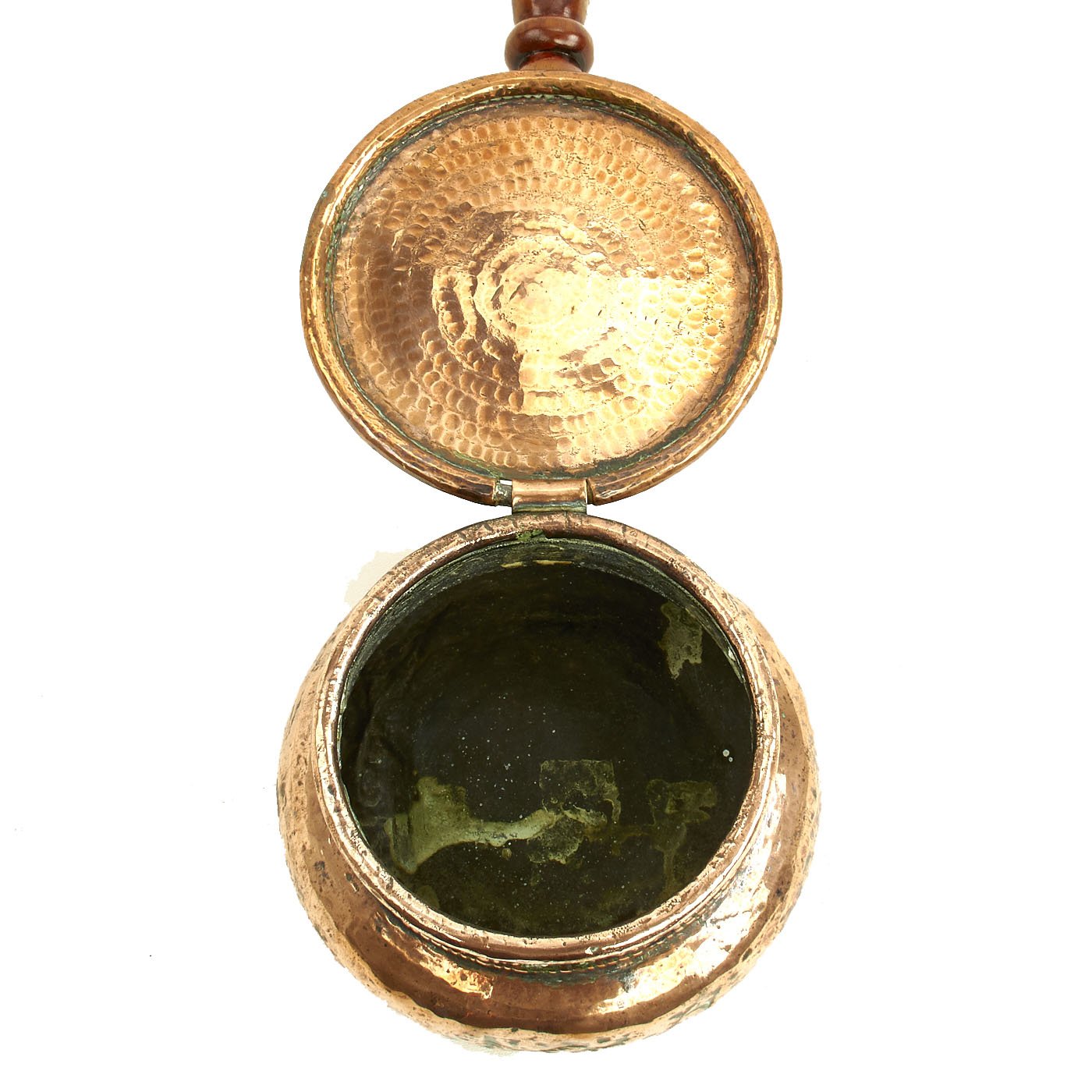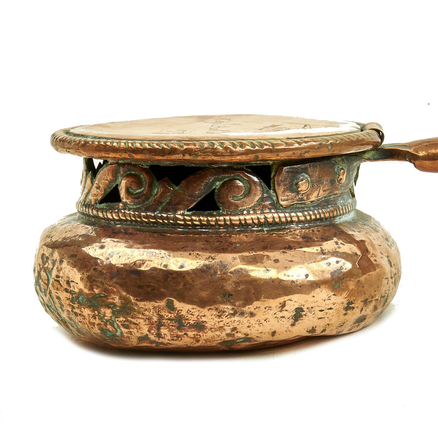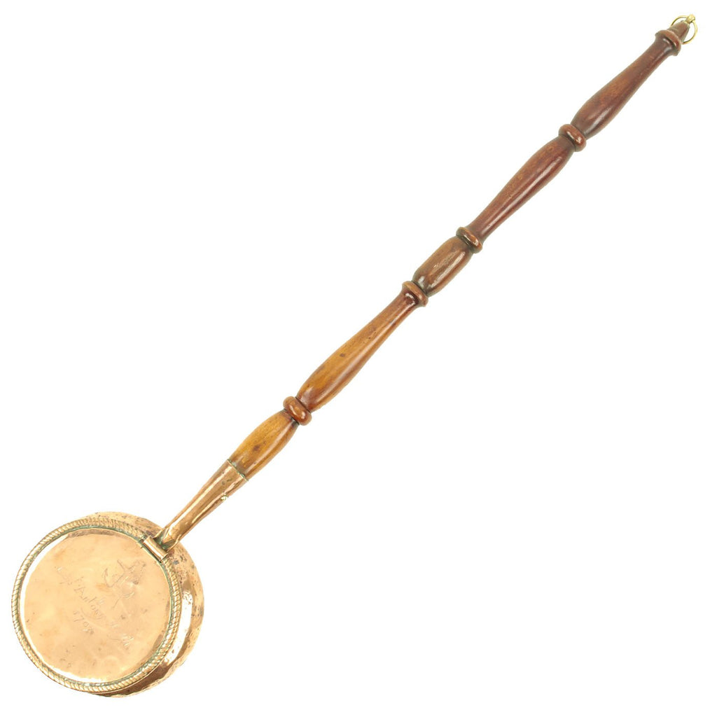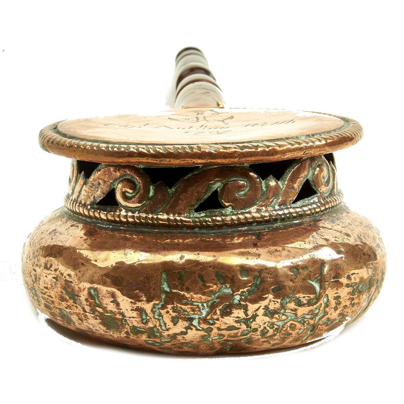 Here is a most appealing Bed Warmer that the servants would fill with red coals and slide over the bed sheets before the Master slipped between the sheets. Our example features a very ornate pan in the shape of a large jar, the lid is 7 1/2" across and when closed is about 4" high. It has a turned wood handle 31" long including its mounting collar, and overall measures approximately 38" long.