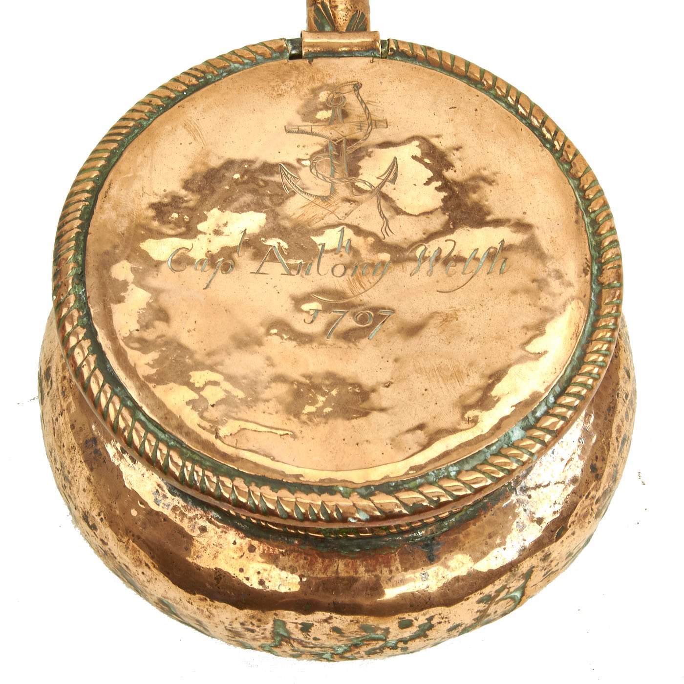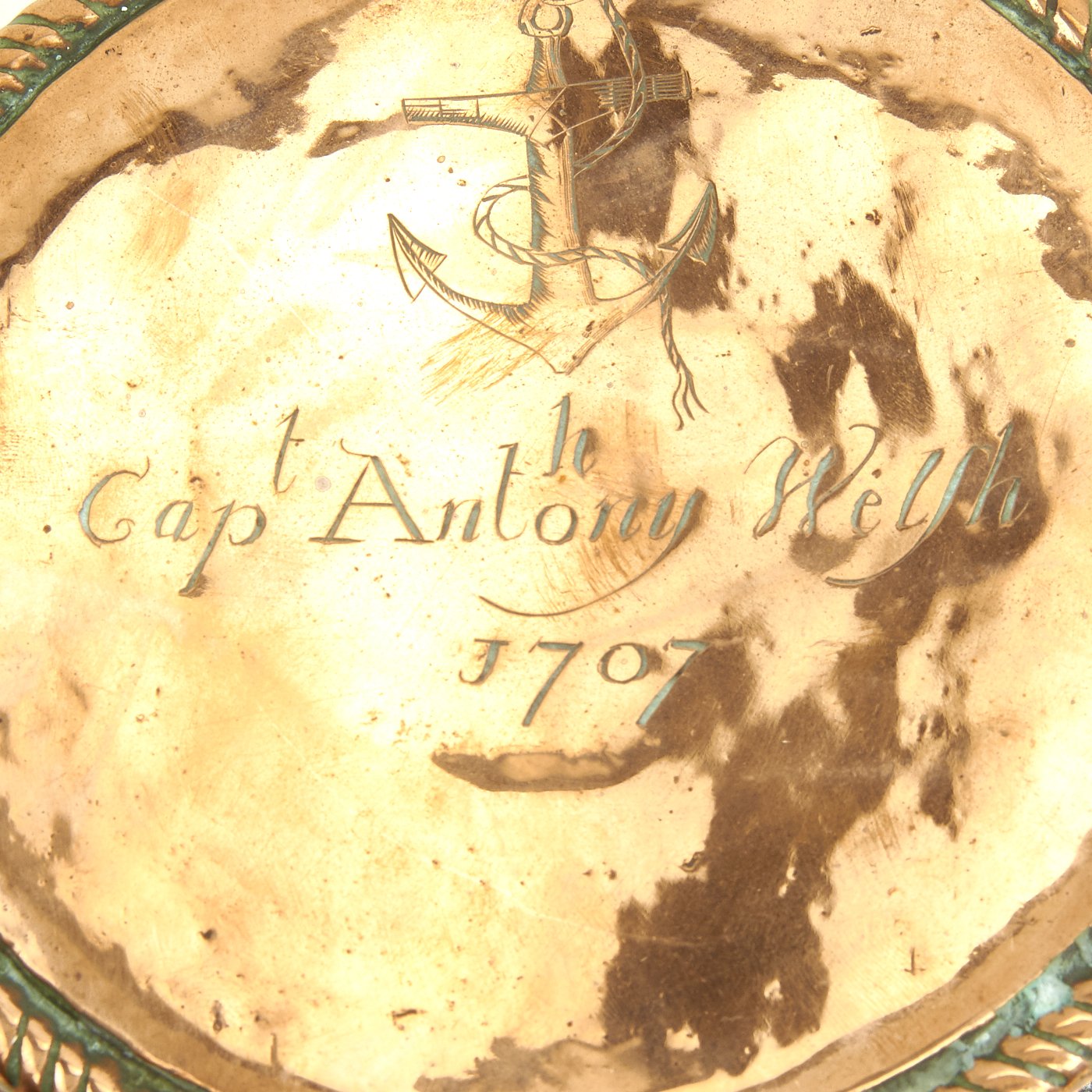 Above this is a “Fouled Anchor” motif, indicating that Captain Welsh was in the ROYAL NAVY. Note in the photographs that the "H" in ANTHONY has been added to the name ANTONY being injected above the original engraving. Is that charming or what?