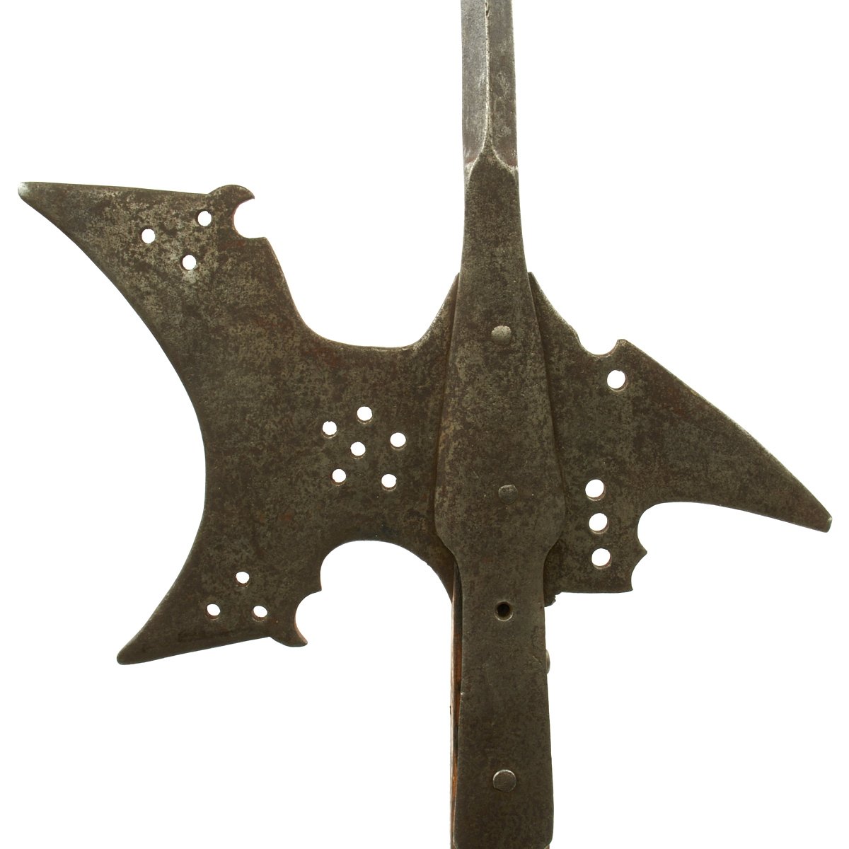 For ease of transportation the haft has been sawn at an angle, with a fat wooden dowel inserted so it can be reassembled for display, each section measuring approximately 57". The iron head displays an AXE on the one side and a spiked HOOK on the other, both decorated with holes in clusters. These 1500-1600 Halberd are known for the extra long spike to the tops which were largely obsoleted by the English Civil War of 1640.