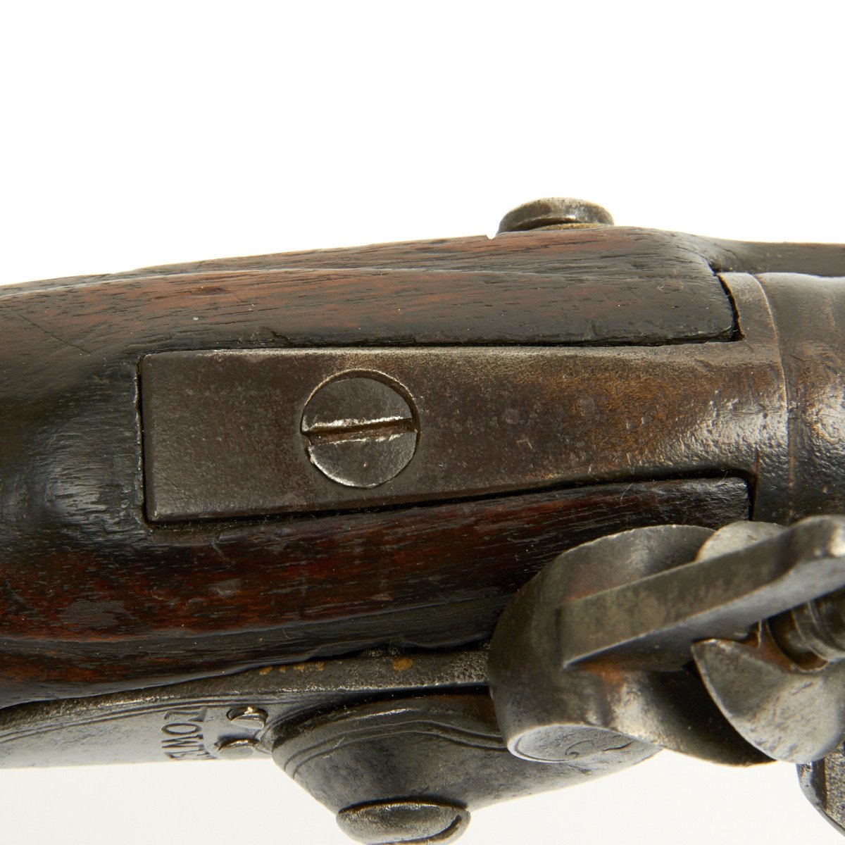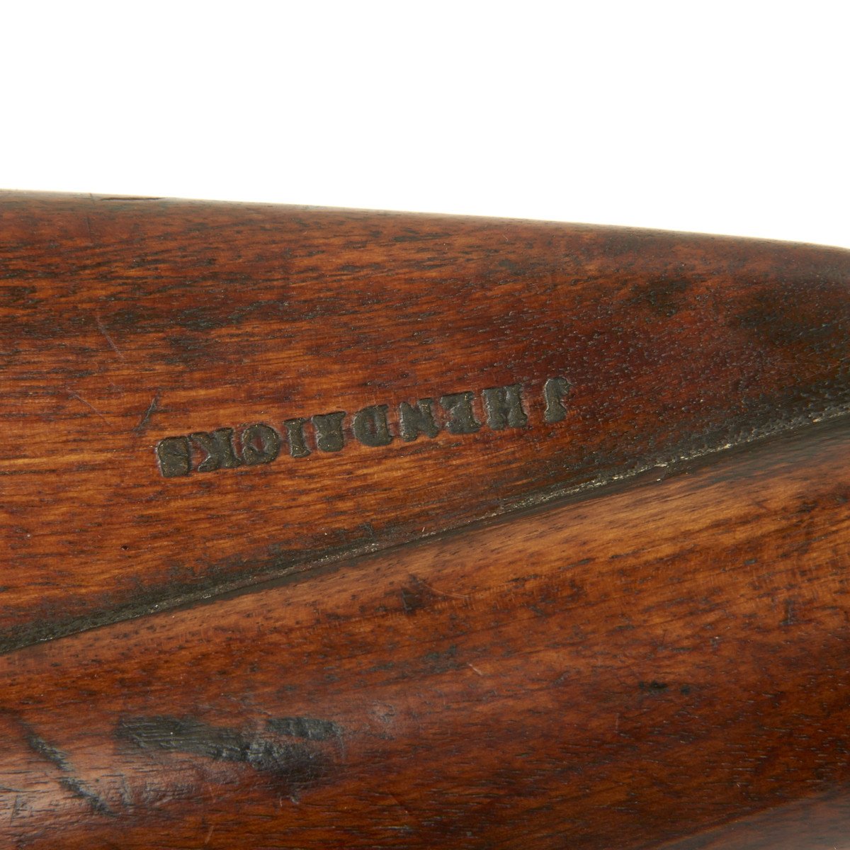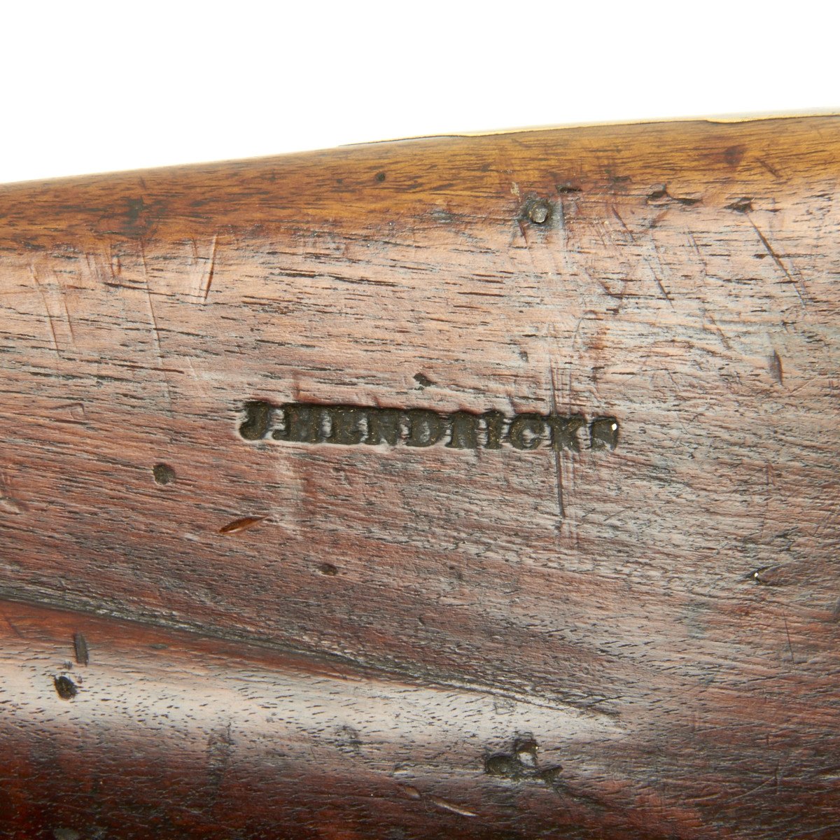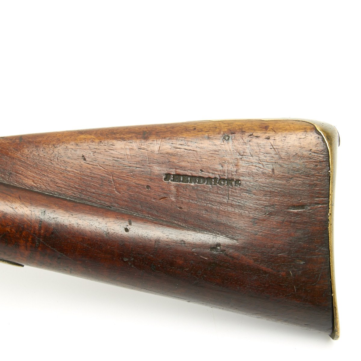 This fine musket has a solid walnut stock, all brass mounts and the lock is marked TOWER across the tail with a Crown over G.R.. It comes complete with English proofed barrel and an iron ramrod. The butt stock is stamped on both sides with the name J. HENDRICKS which was the name of the trading company that purchased the musket once released from service in the late 1820s.