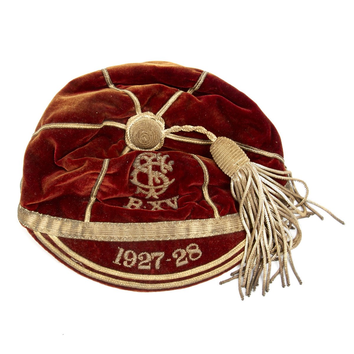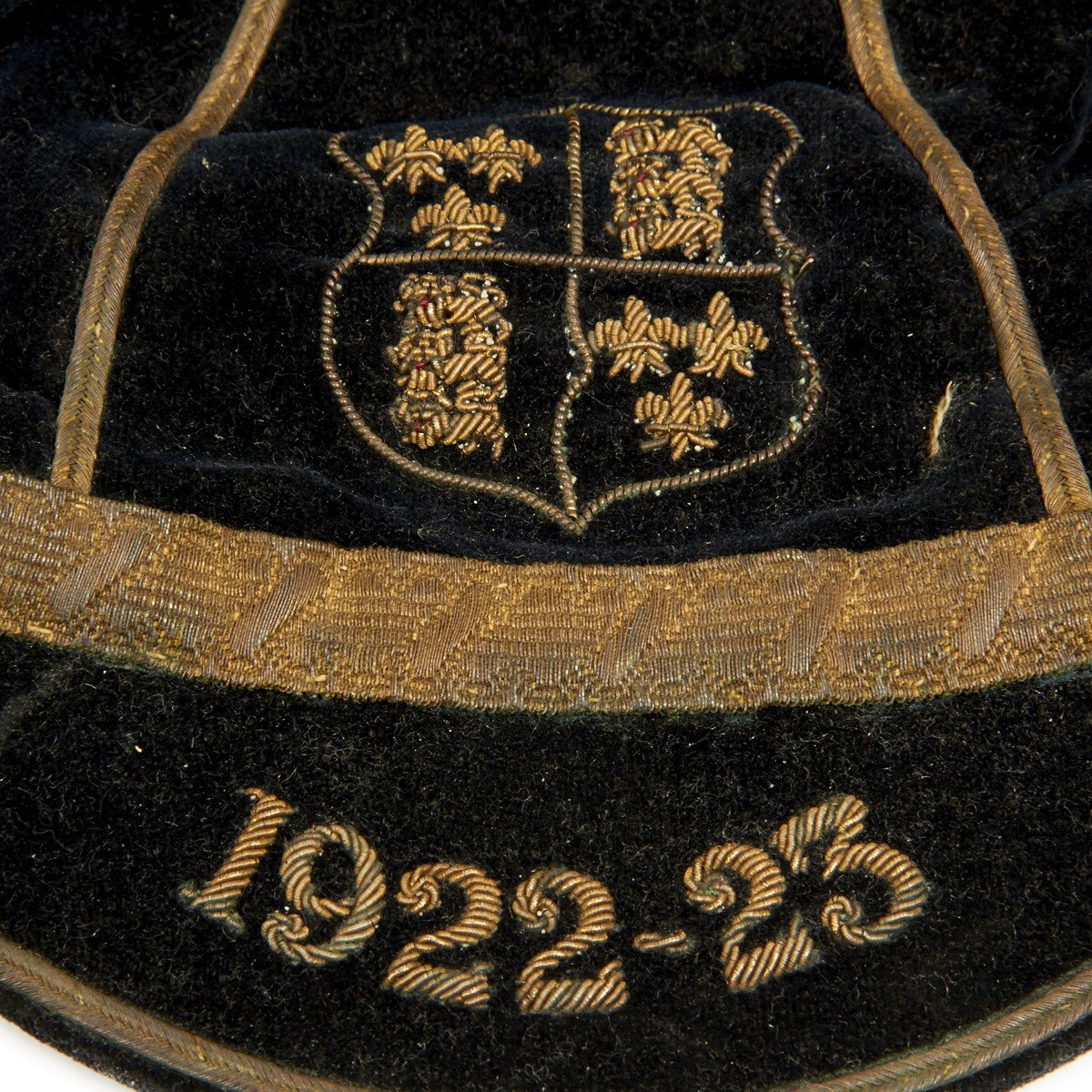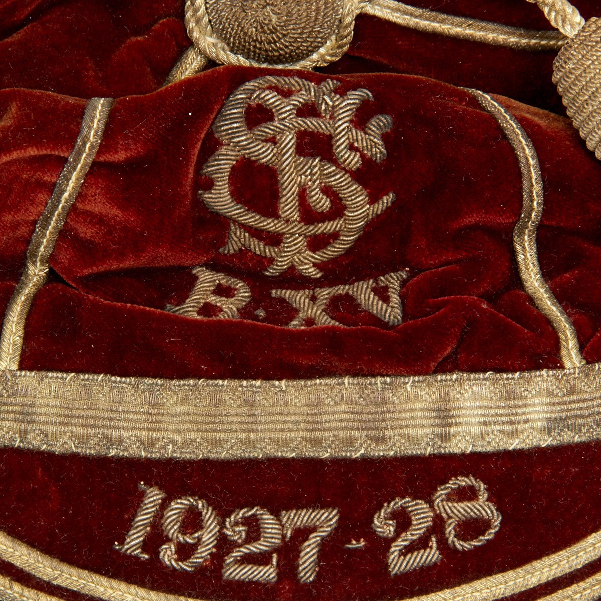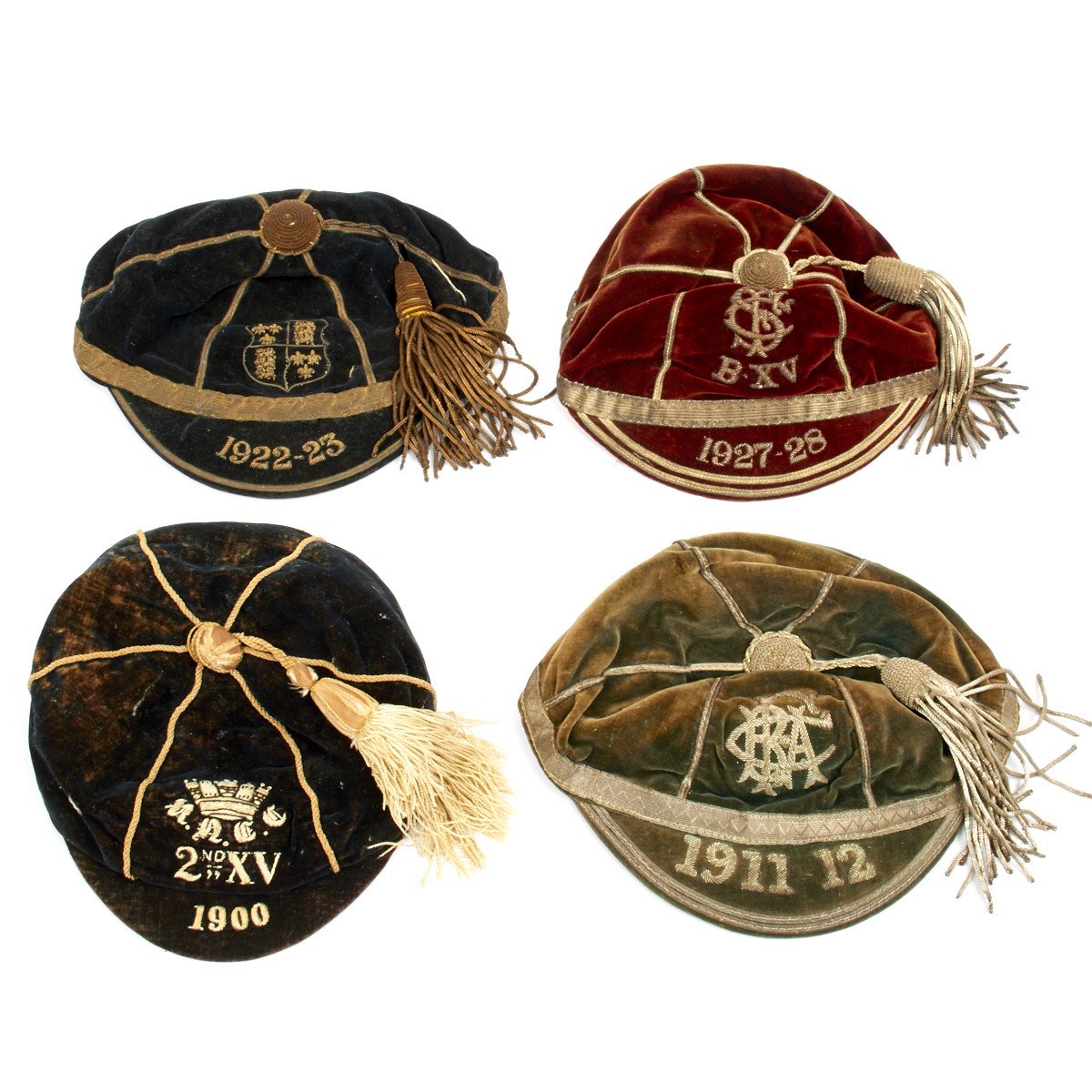 Here we have a Collection of four caps dated from 1900 to 1928, all but the earliest still bear an original tailor's label. They each have their very dashing gilt tassels and badges, the bodies of the caps being constructed of lined velvet. This all harks back to the saying that England's greatness was molded on the playing fields of Eton. This is a lovely collection ranging from Queen Victoria to King George V.