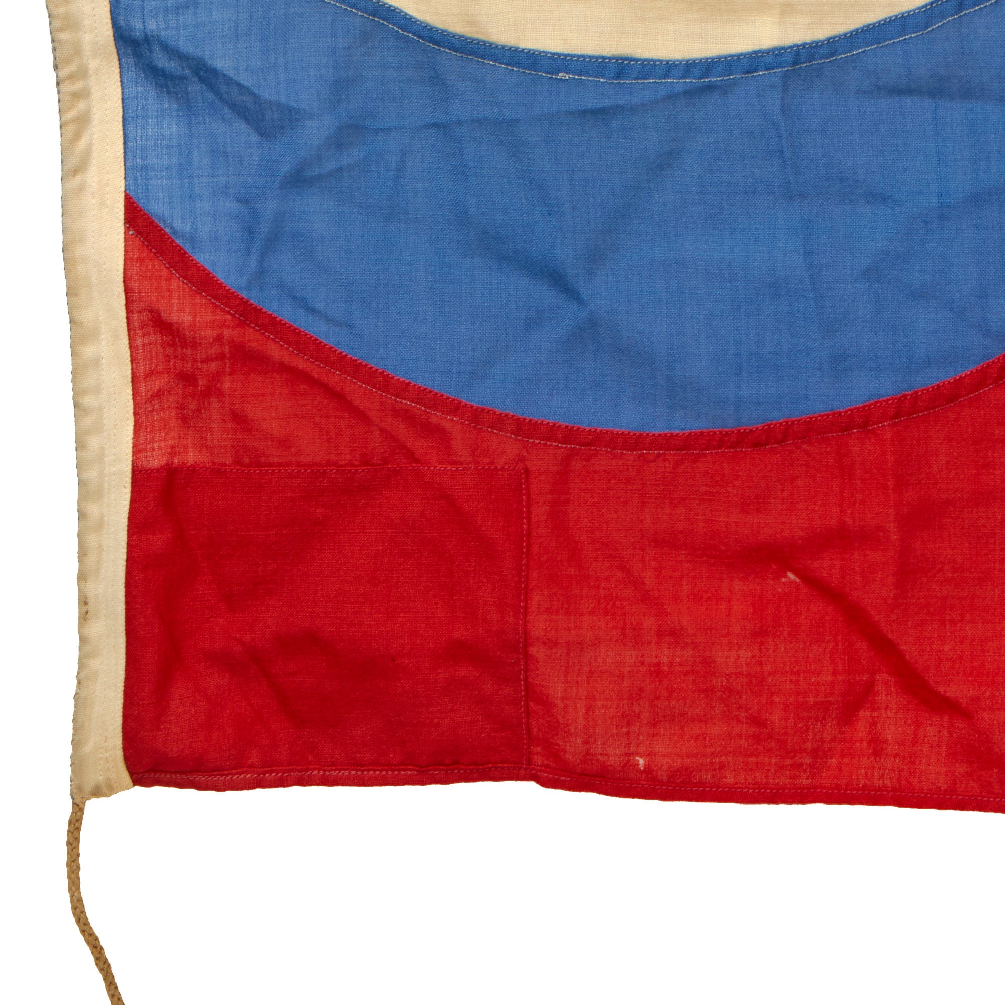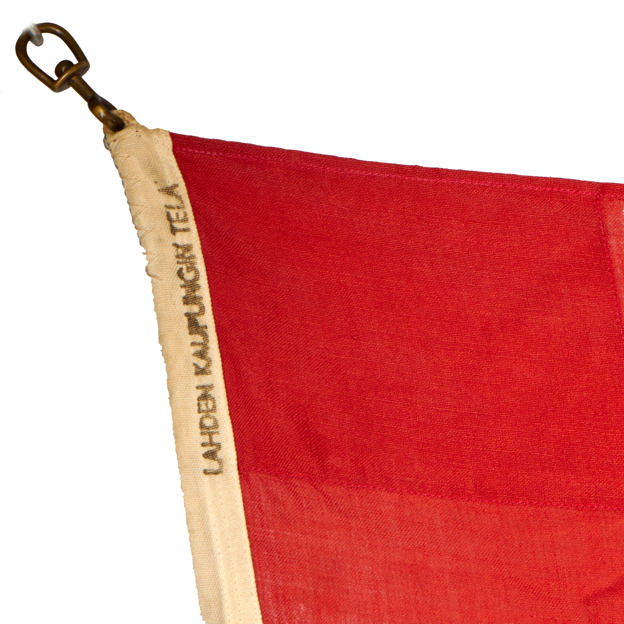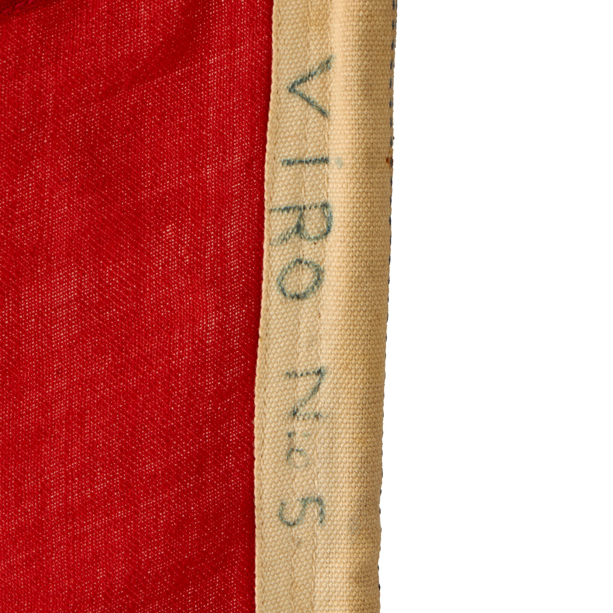 The flag is red with the Soviet “Sickle and Hammer” under a star in the top left, with blue and white waves going across the flag a bit above the bottom. The flag has a halyard and hook at the other end with a maker’s tag for KARHU and the words VIRO NO. 5 are written next to the tag. On the opposite side is the stamp LAHDEN KALPLINGIN TELA. These are certainly Estonian maker’s-marks. The flag is very well stitched and has very few flaws minus some tiny holes and staining. This flag likely dates to the 1950s-1970s, being adopted in 1953 and relinquished in 1990.