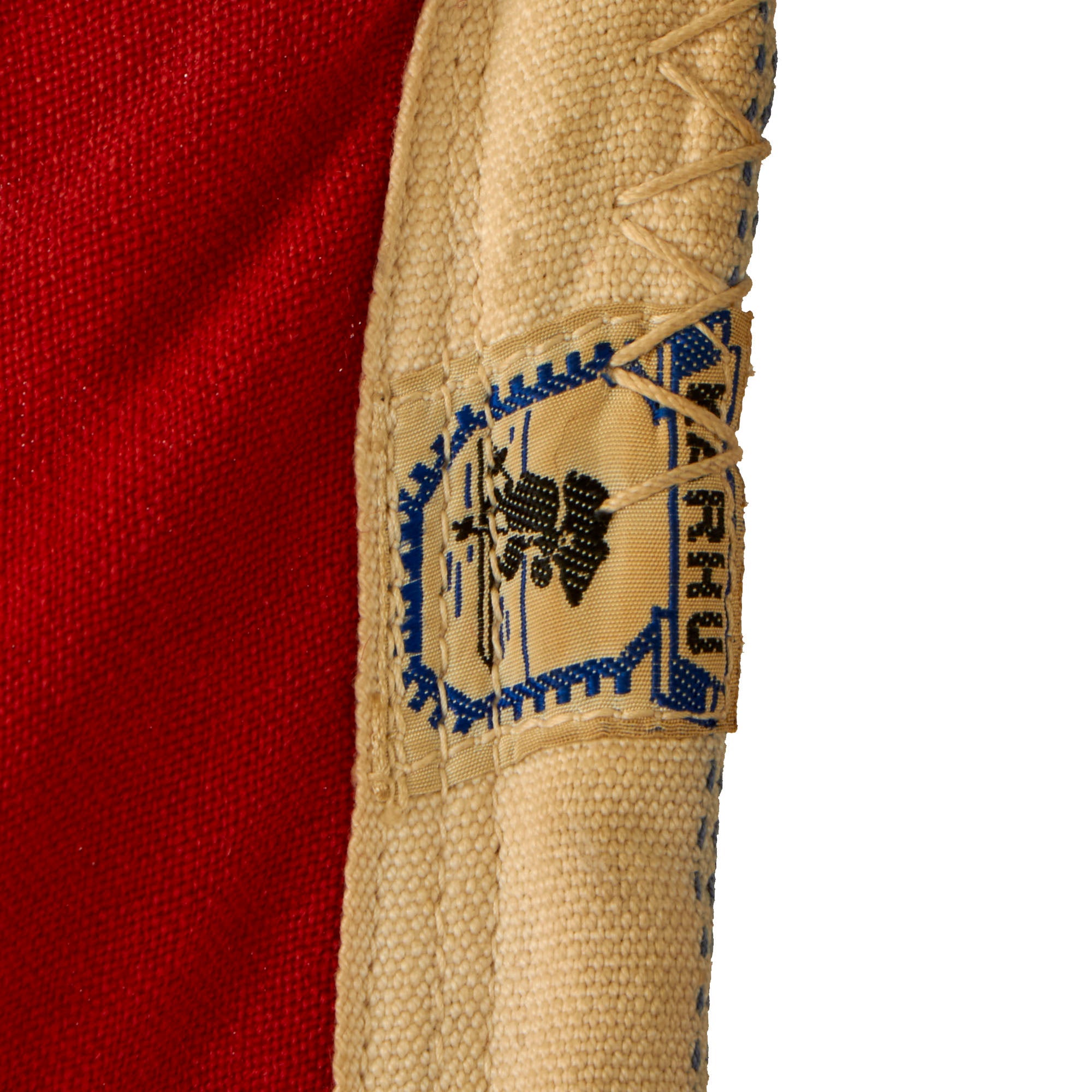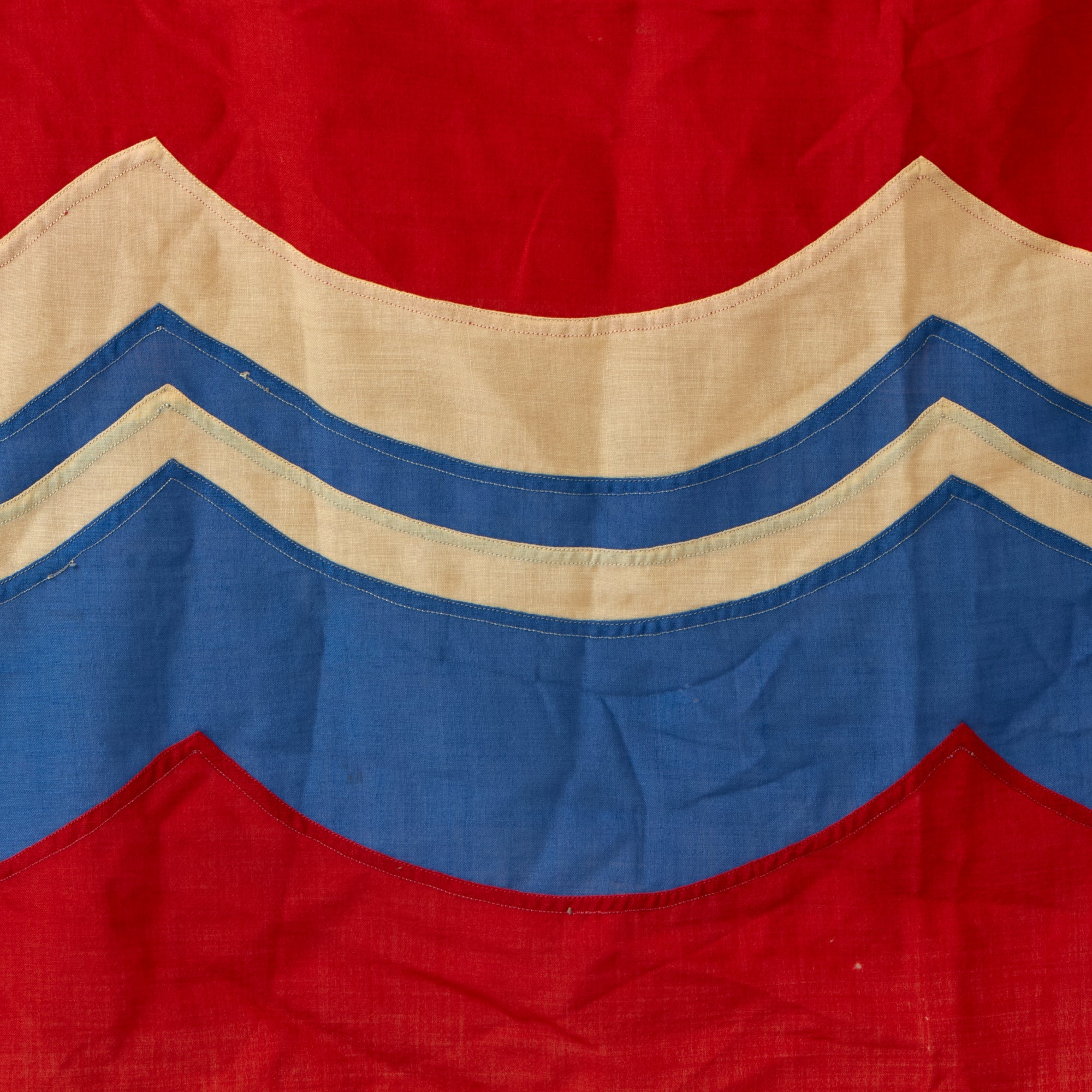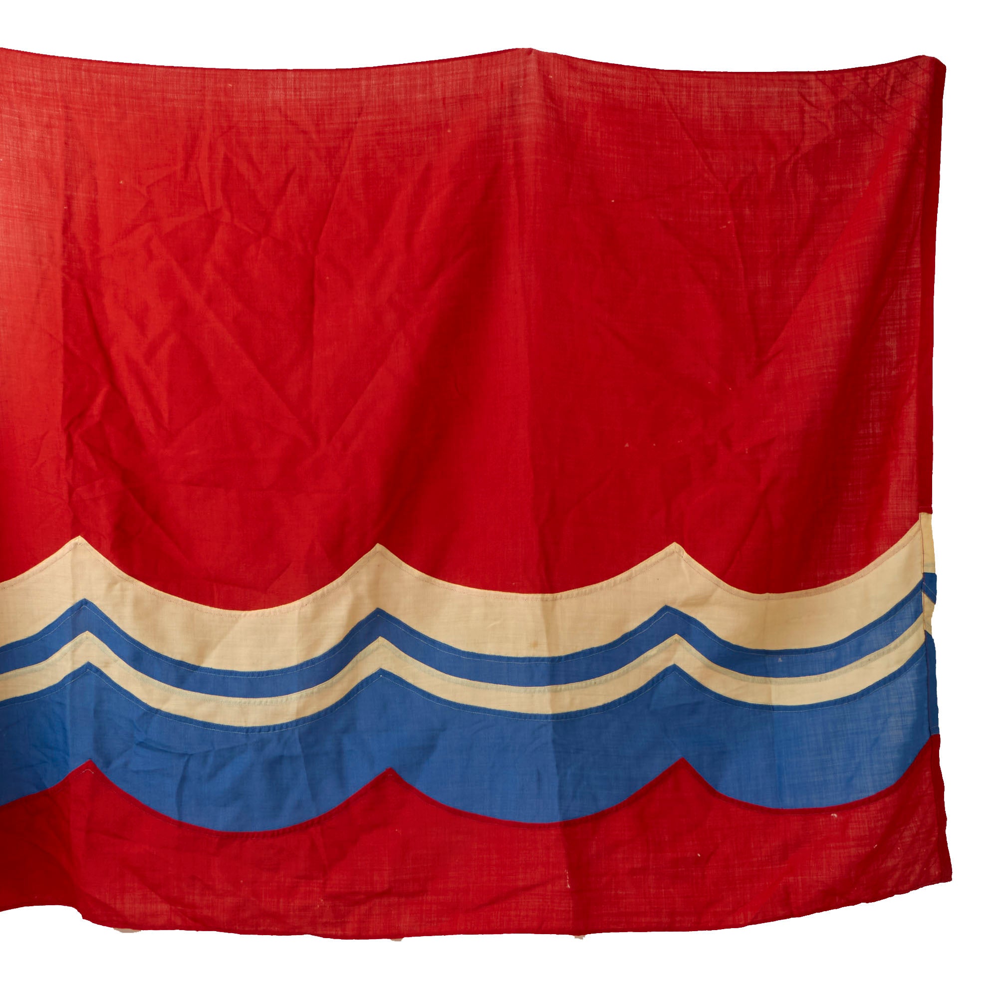 The flag is red with the Soviet “Sickle and Hammer” under a star in the top left, with blue and white waves going across the flag a bit above the bottom. The flag has a halyard and hook at the other end with a maker’s tag for KARHU and the words VIRO NO. 5 are written next to the tag. On the opposite side is the stamp LAHDEN KALPLINGIN TELA. These are certainly Estonian maker’s-marks. The flag is very well stitched and has very few flaws minus some tiny holes and staining. This flag likely dates to the 1950s-1970s, being adopted in 1953 and relinquished in 1990.