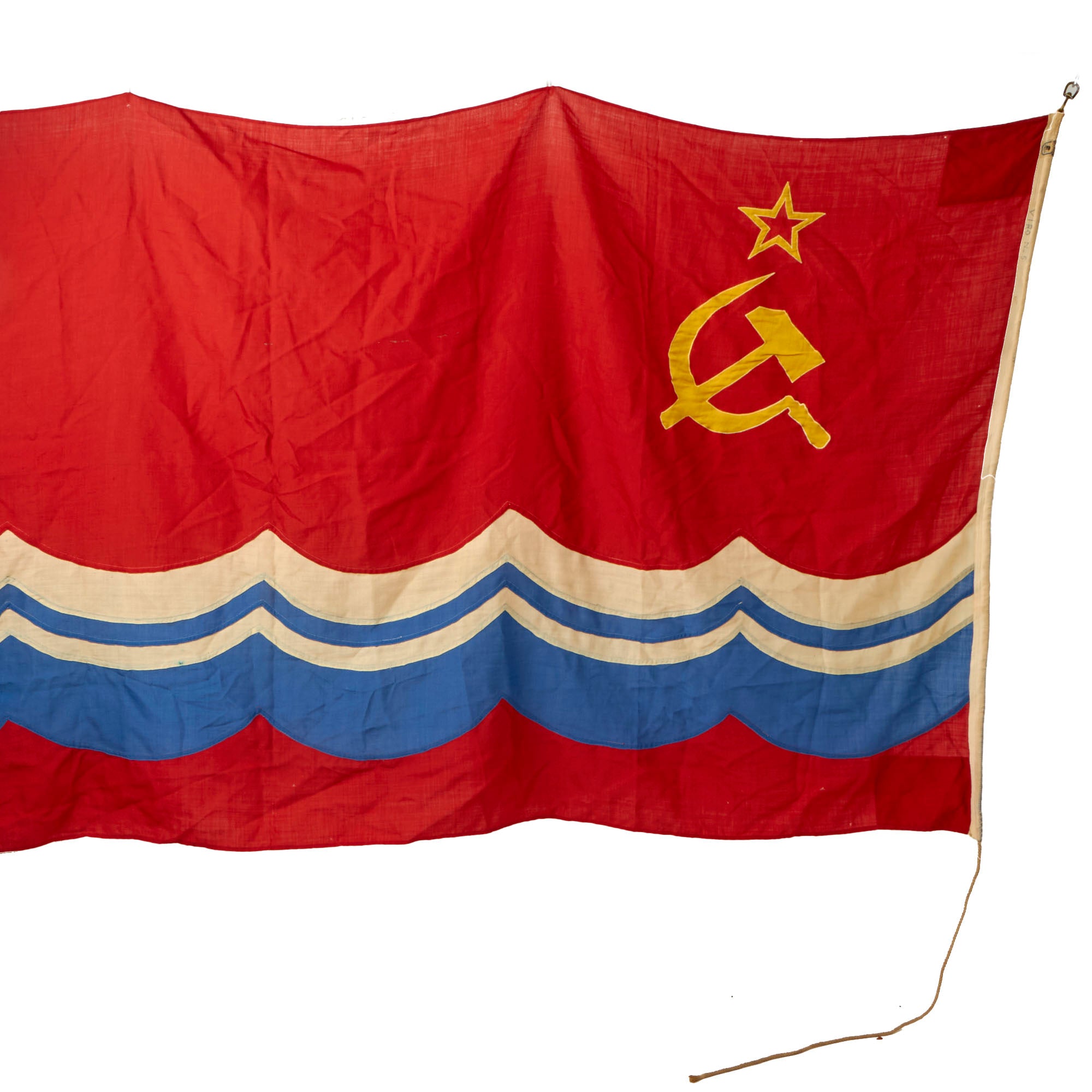 Original Item. Only One Available. This is a very flag of the Estonian Soviet Socialist Republic in a very large size, roughly 52" x 108”. During the period of foreign rule in 1940–1991, the Estonian diaspora and diplomatic service around the world continued to use the national flag of Estonia, whereas the use of the national tricolor and its blue, black and white color combination was banned and punishable by law in the Soviet Union until 1988.