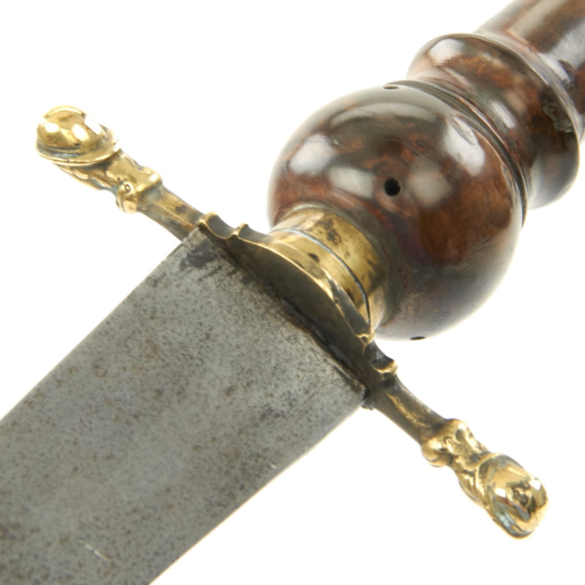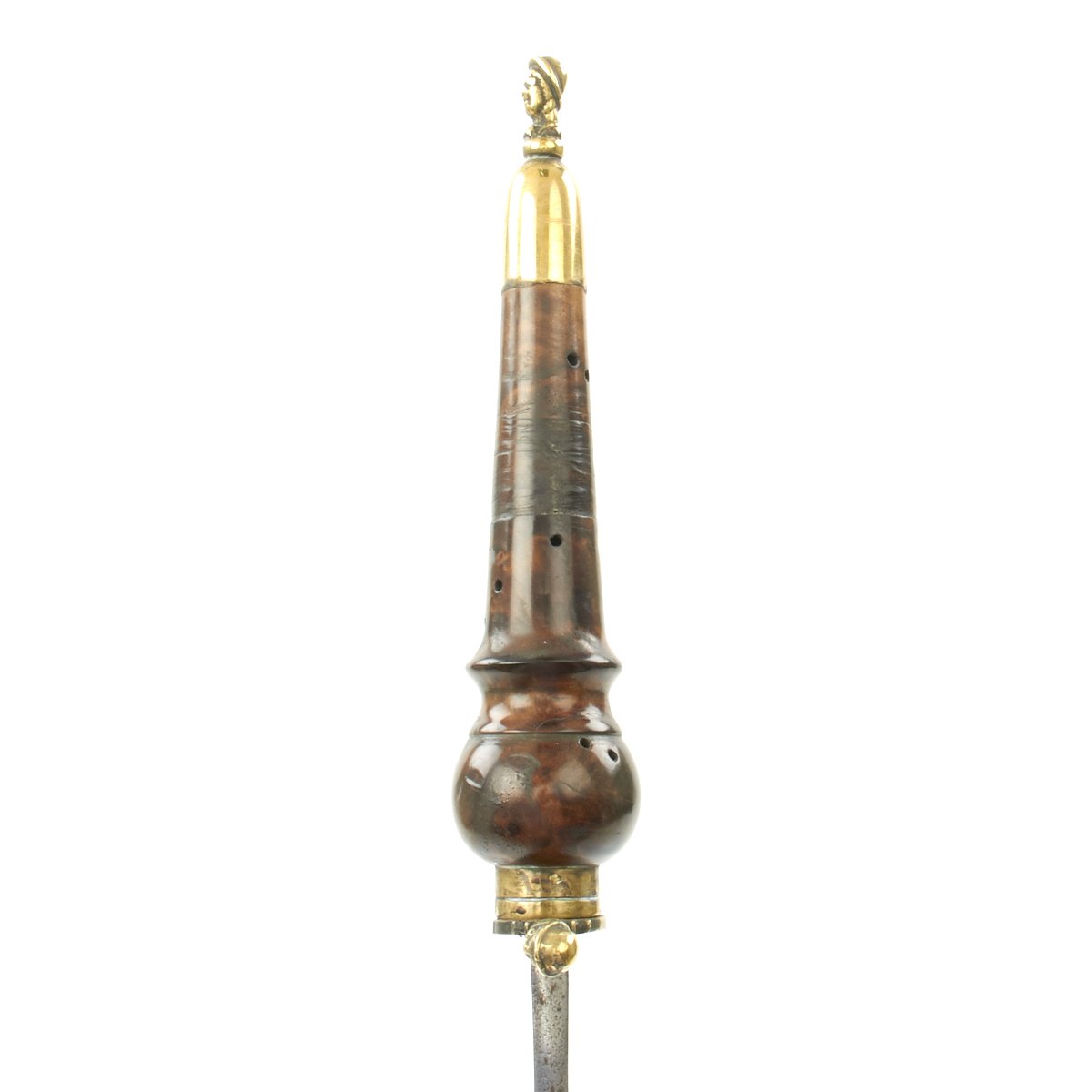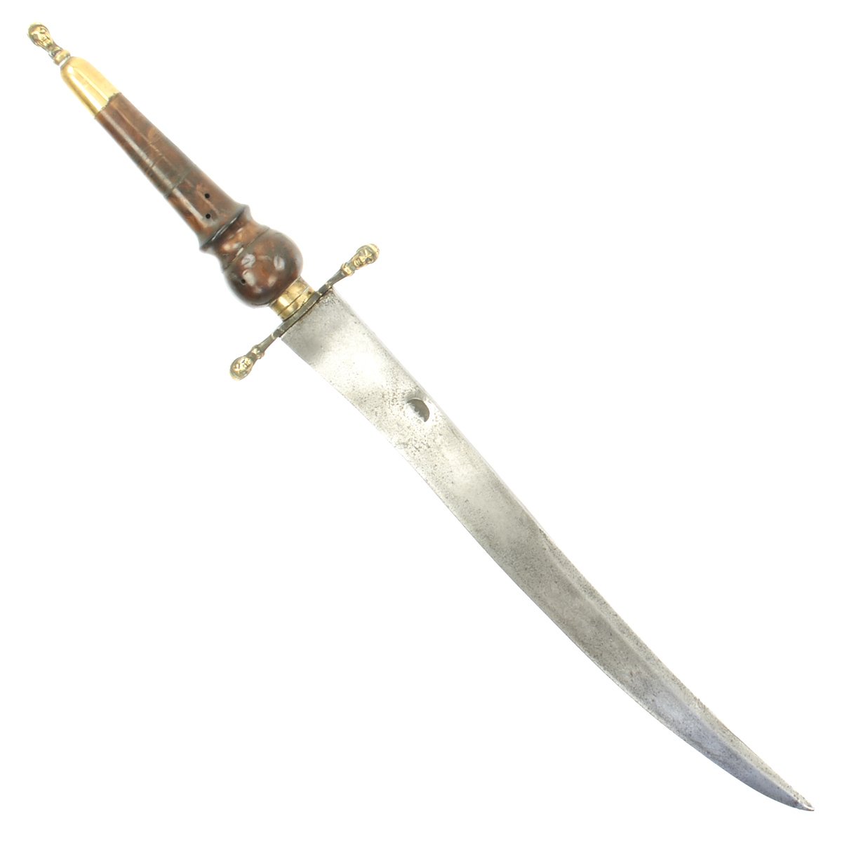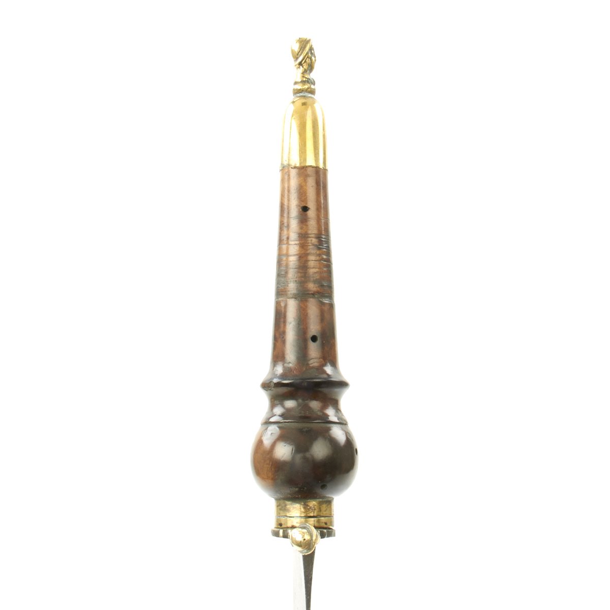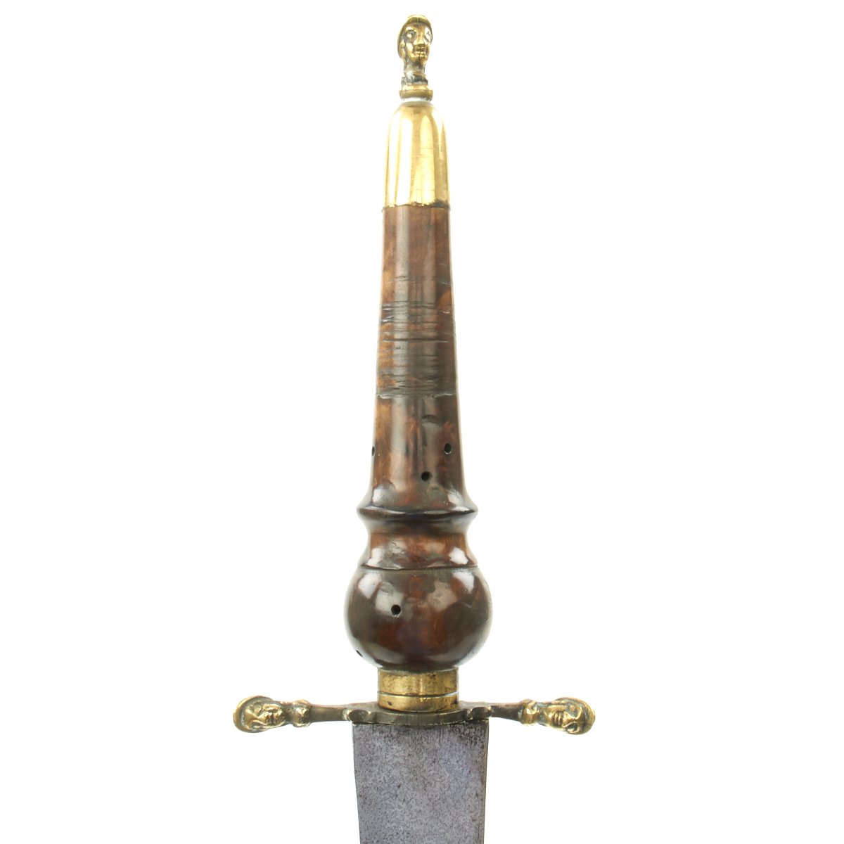 Original Item: Only One Available. This is a most attractive early Plug Bayonet that appears to have clearly seen some use, judging by the muzzle impressions still apparent on the wood hilt. The handle is quite attractive, looking to almost be made of burl walnut. Mounted in brass with a cross guard and pommel displaying 17th century helmeted heads. The blade, almost of a Bowie design, shows sharpening in a most pleasing manner and bears a very deep Armorer's Mark the resembles a Crescent Moon with a face in profile. Measuring almost 19" overall, the blade alone is 12" in length.