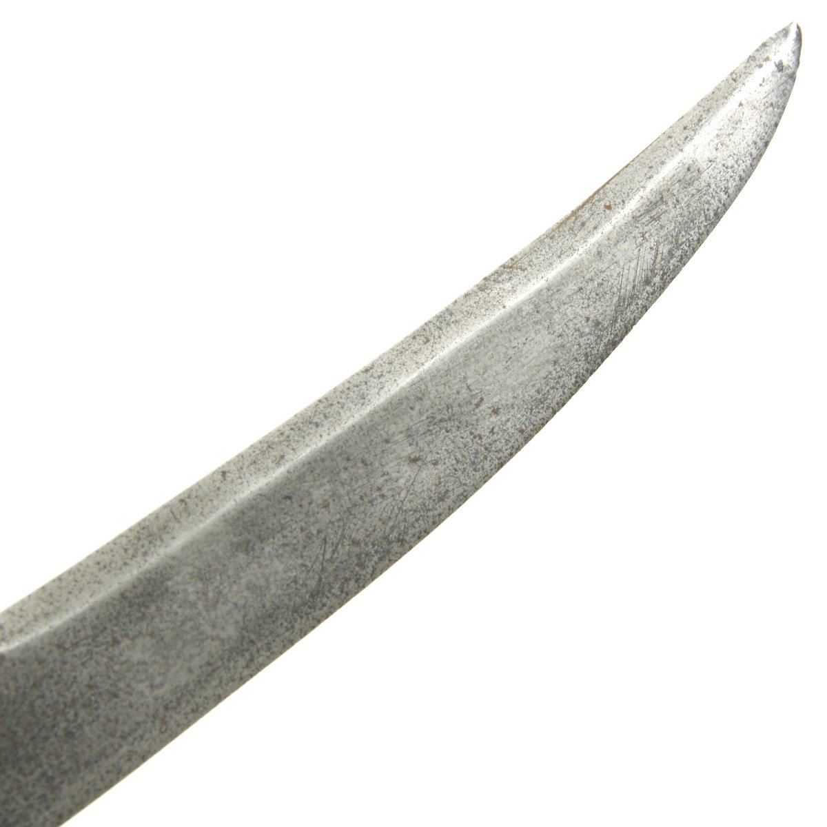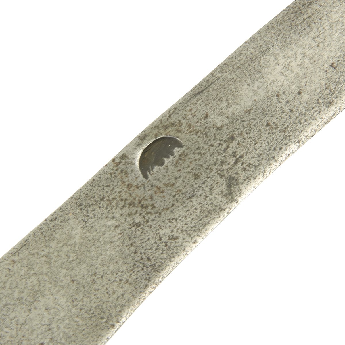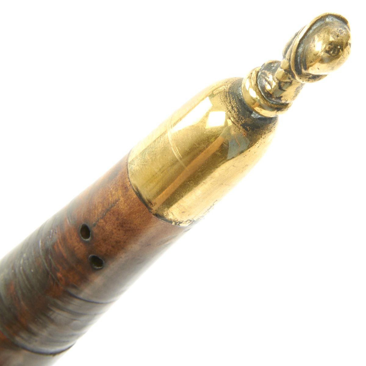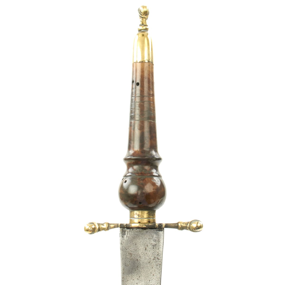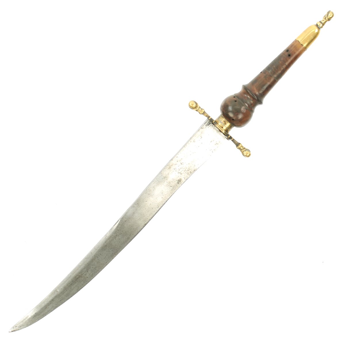 Original Item: Only One Available. This is a most attractive early Plug Bayonet that appears to have clearly seen some use, judging by the muzzle impressions still apparent on the wood hilt. The handle is quite attractive, looking to almost be made of burl walnut. Mounted in brass with a cross guard and pommel displaying 17th century helmeted heads. The blade, almost of a Bowie design, shows sharpening in a most pleasing manner and bears a very deep Armorer's Mark the resembles a Crescent Moon with a face in profile. Measuring almost 19" overall, the blade alone is 12" in length.