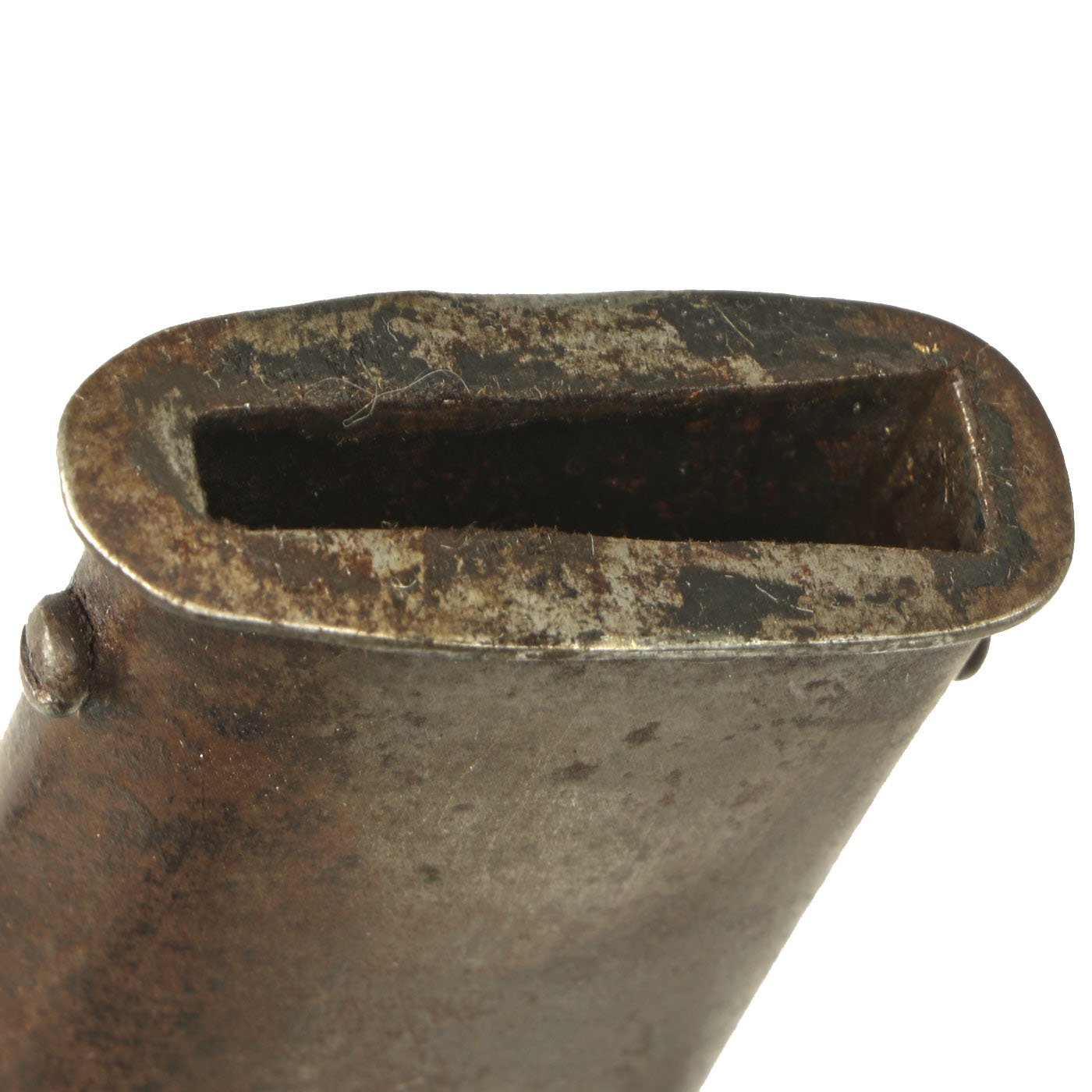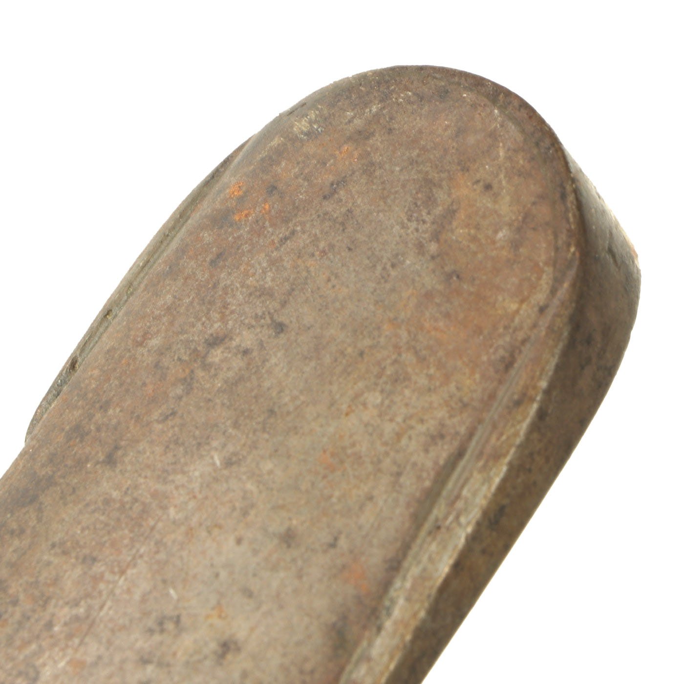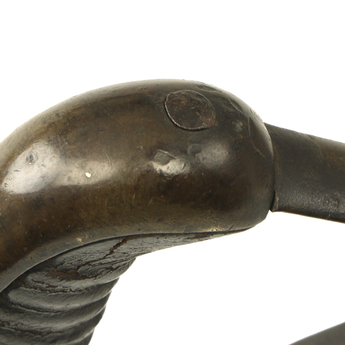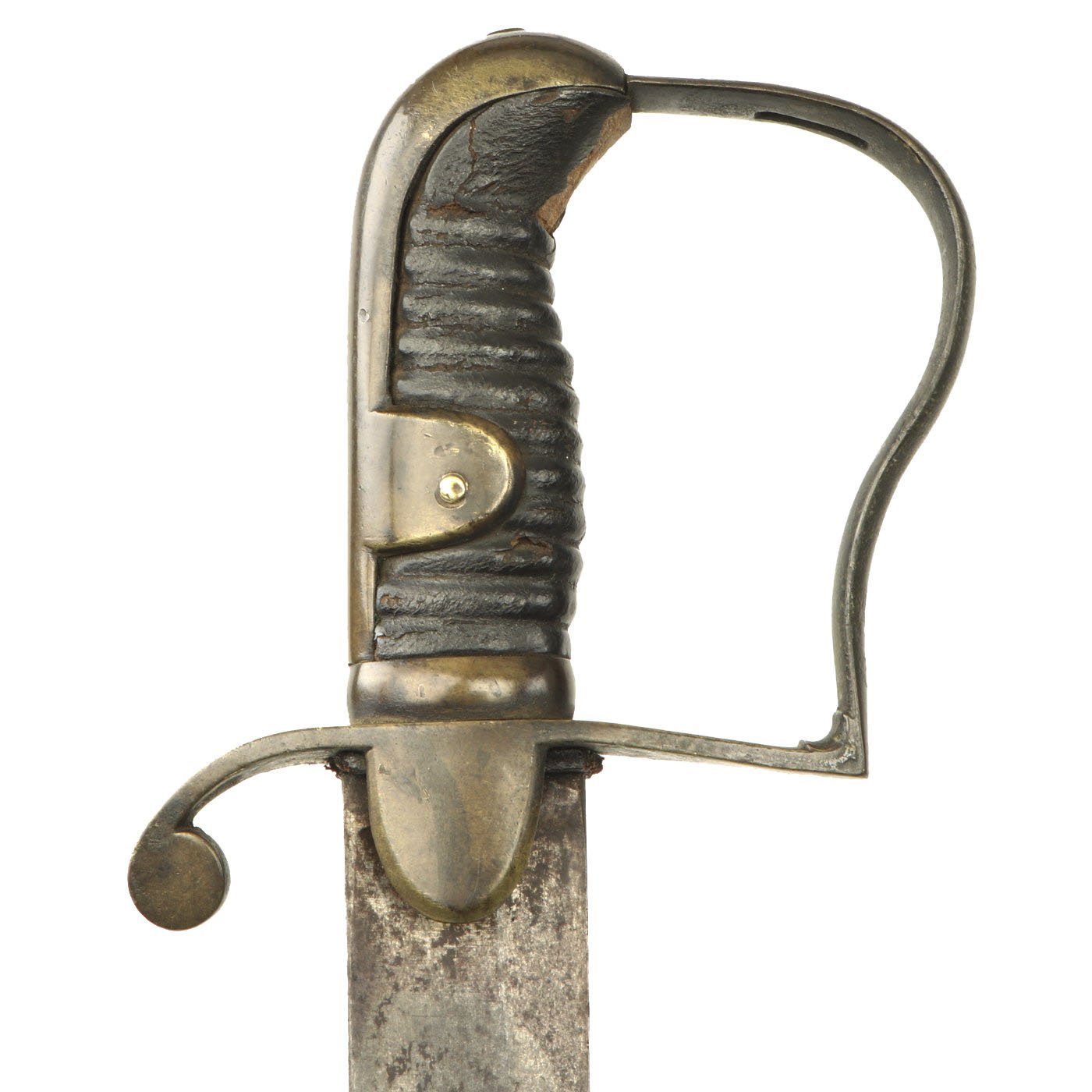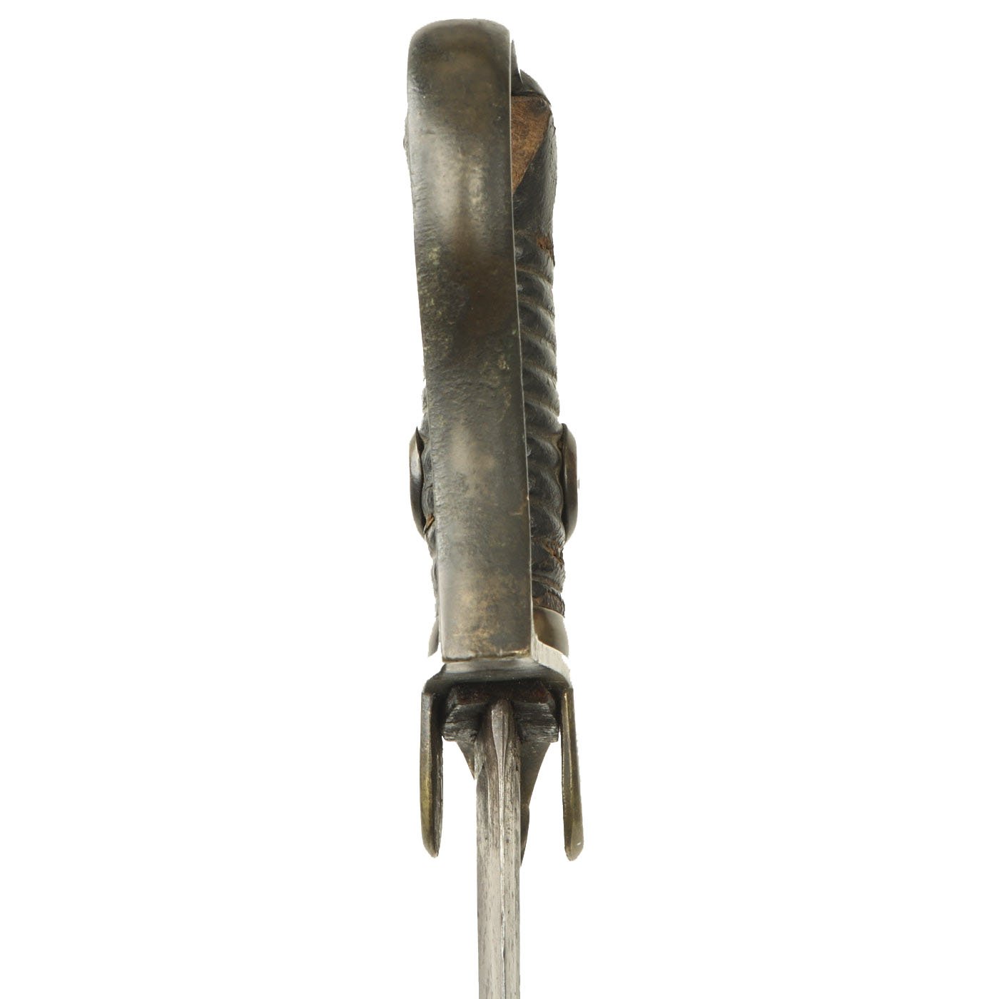 Our example is a complete SLEEPER, left uncleaned as we found it, and retains its wood ringed bound leather grip and stirrup brass guard together with its original heavy iron Scabbard. The curved hatchet point blade measures 33" x 1 1/2", with an overall length of 37 1/2". The blade is substantial, and is unmarked, even under the langets. We feel this sword is most likely Prussian in origin due to the width of the blade. Unfortunately without any maker or proof marks, it isn't possible to know.