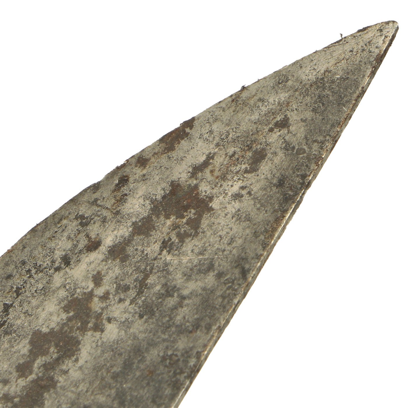 Condition is quite nice, with the expected wear and damage from use. The leather clad wooden grip is missing a chunk, and is somewhat dried out. The blade shows staining, as does the scabbard, and there are some nicks on the edge, along with some rust spots. The scabbard also has a few dents and other issues, but still retains both hanger rings, and fits the sword beautifully.