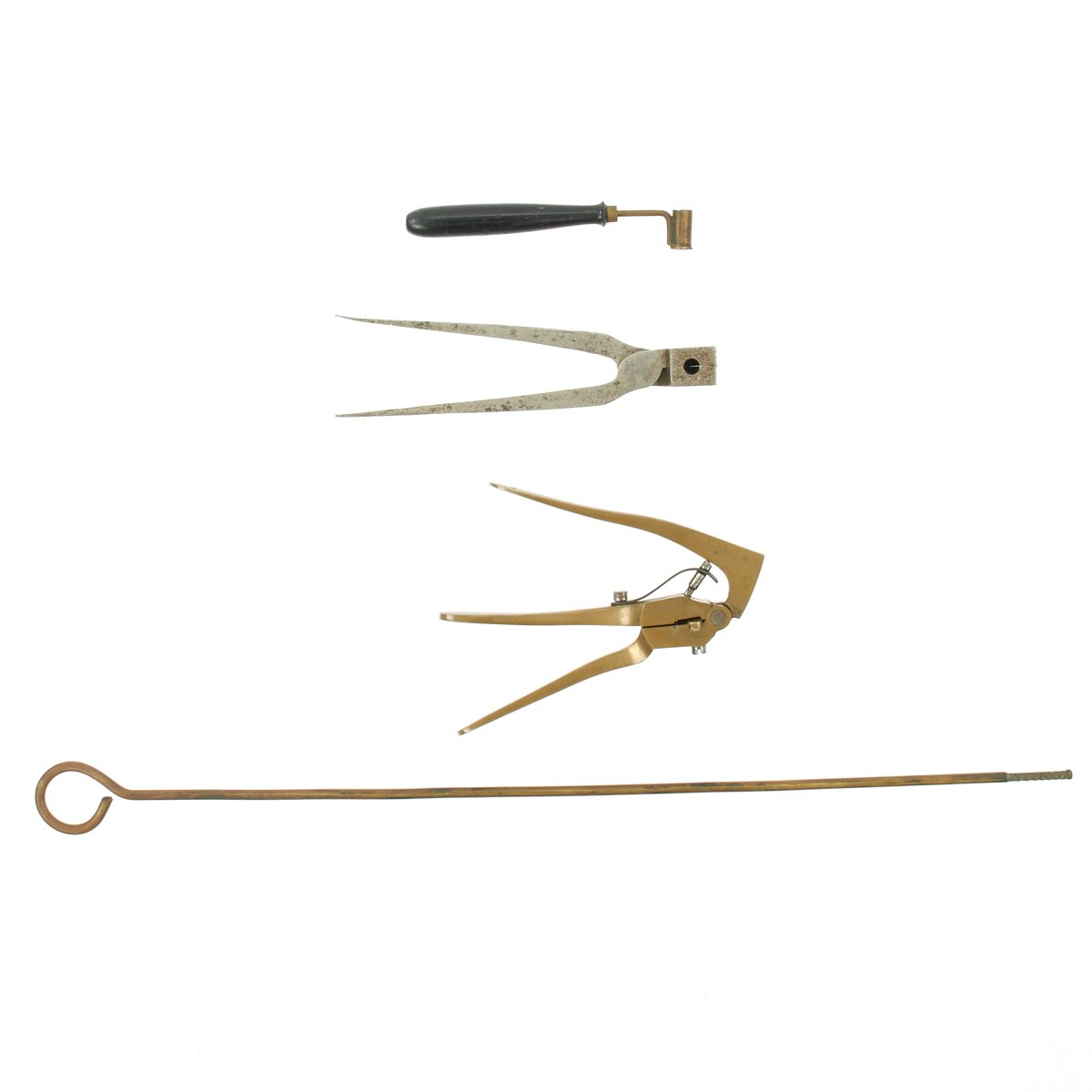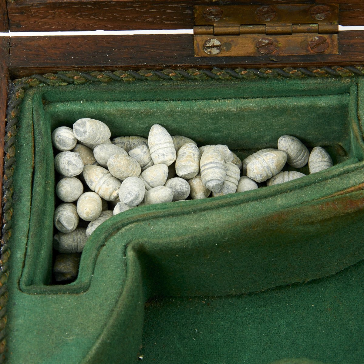 The wood case measures 18" x 10" x 2 3/4". The case is lined is green felt with silhouette compartments for both pistols and the related cartridge re-loading tools included. The lining is a bit worn from age and use, so some care is needed when placing the items in the case. There is a lidded compartment full of old cast lead bullets that have turned white with age. There is a cleaning rod, a bullet mold with 320 marked on it, a powder measure with handle and a cartridge re-loading tool with crimper, also marked 320. We assumed that this might be for .320 caliber, but the bores are only around .315, so it may be just a serial number for the set.