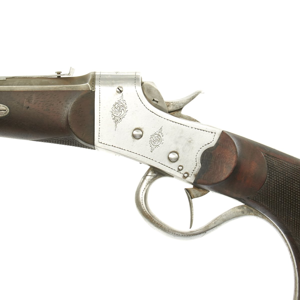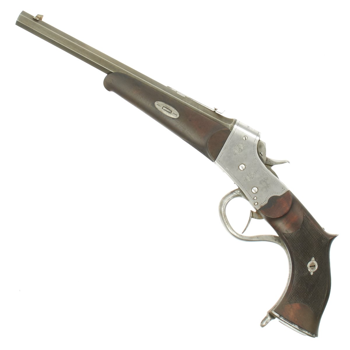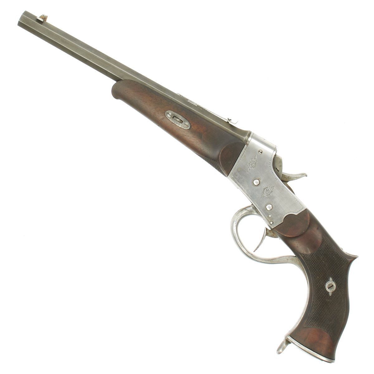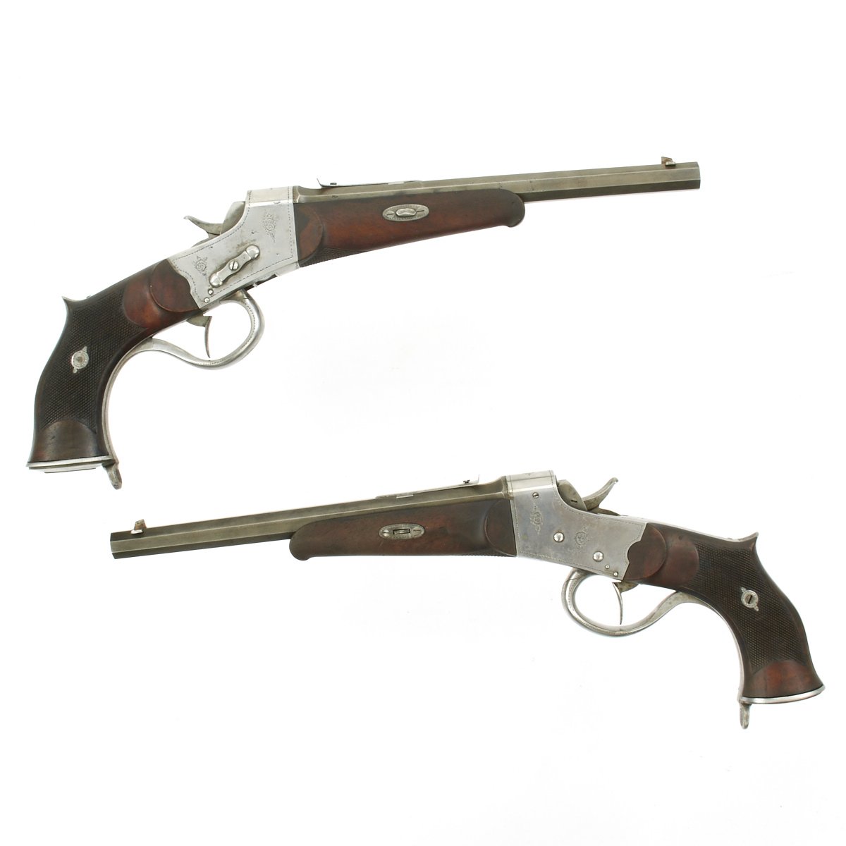 Original Items: Only One Set Available. Adopted by the U.S. Army in 1871 in .50 caliber this system was based on Remington's Patent of 1866. Of course, Remington Rolling Block rifles are very plentiful, however single shot Remington Rolling block pistols are extremely hard to come by. Here we have a Fabulous pair of very high quality civilian pistols, made in Europe and fully cased in the continental style with multiple accessories.