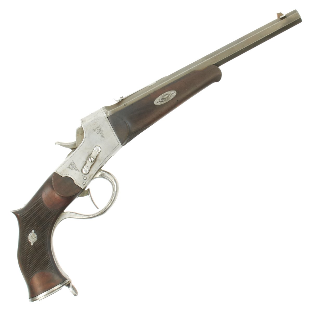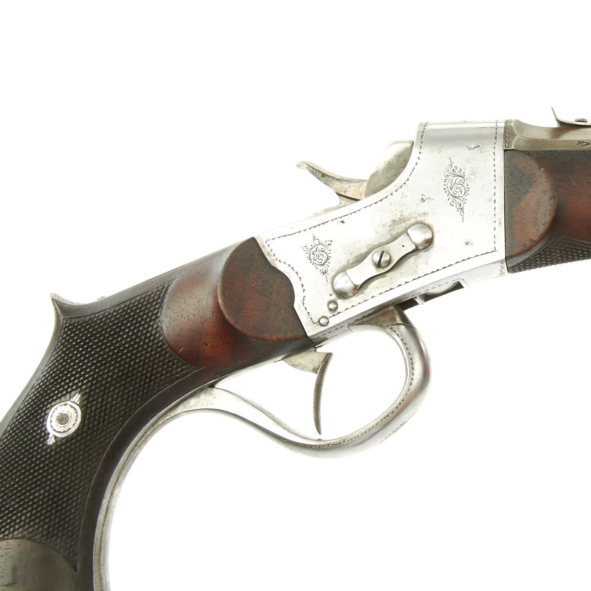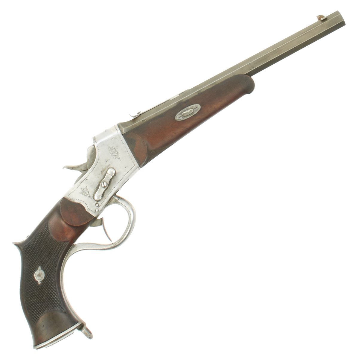 The pistols themselves have 10" octagonal barrels and are quite smart looking. Interestingly, the trigger guards double as the action opening levers that when lowered retract the rolling block which ejects the spent cartridge case whilst re-cocking the hammer. When put back in its original position against the pistol grip the action is fully closed, cocked and ready to discharge the next round. This is definitely a step up from the standard rolling block, which requires all of this to be done manually in separate steps.