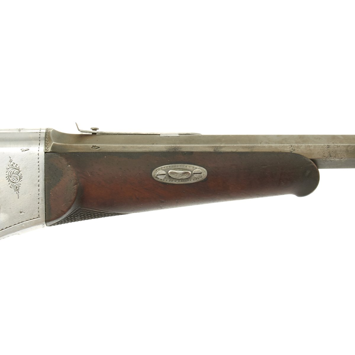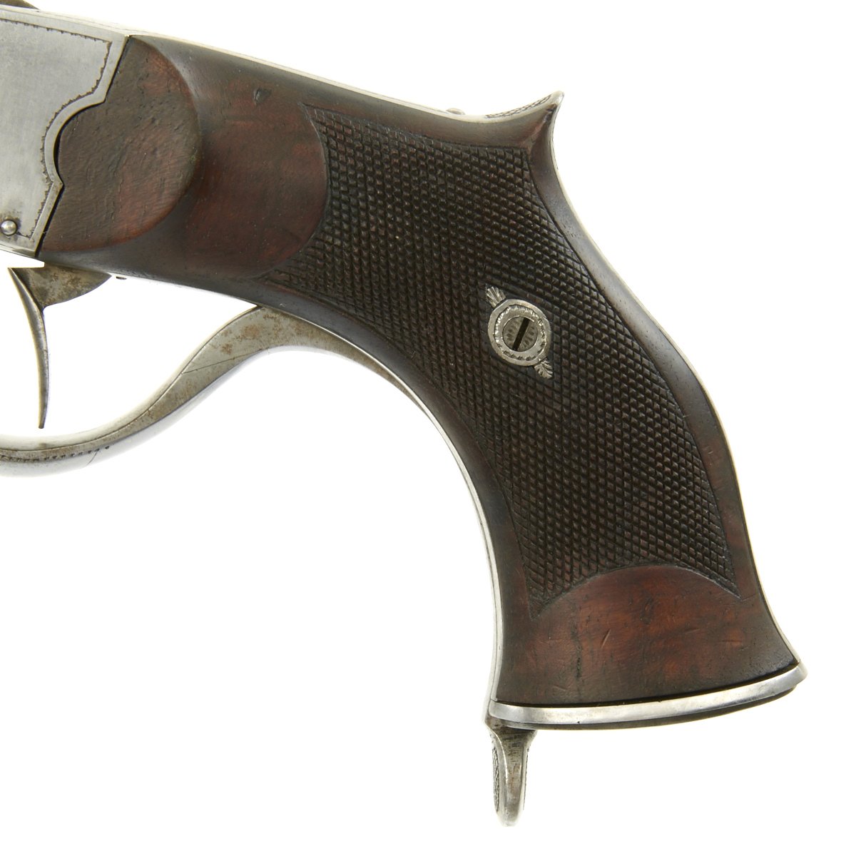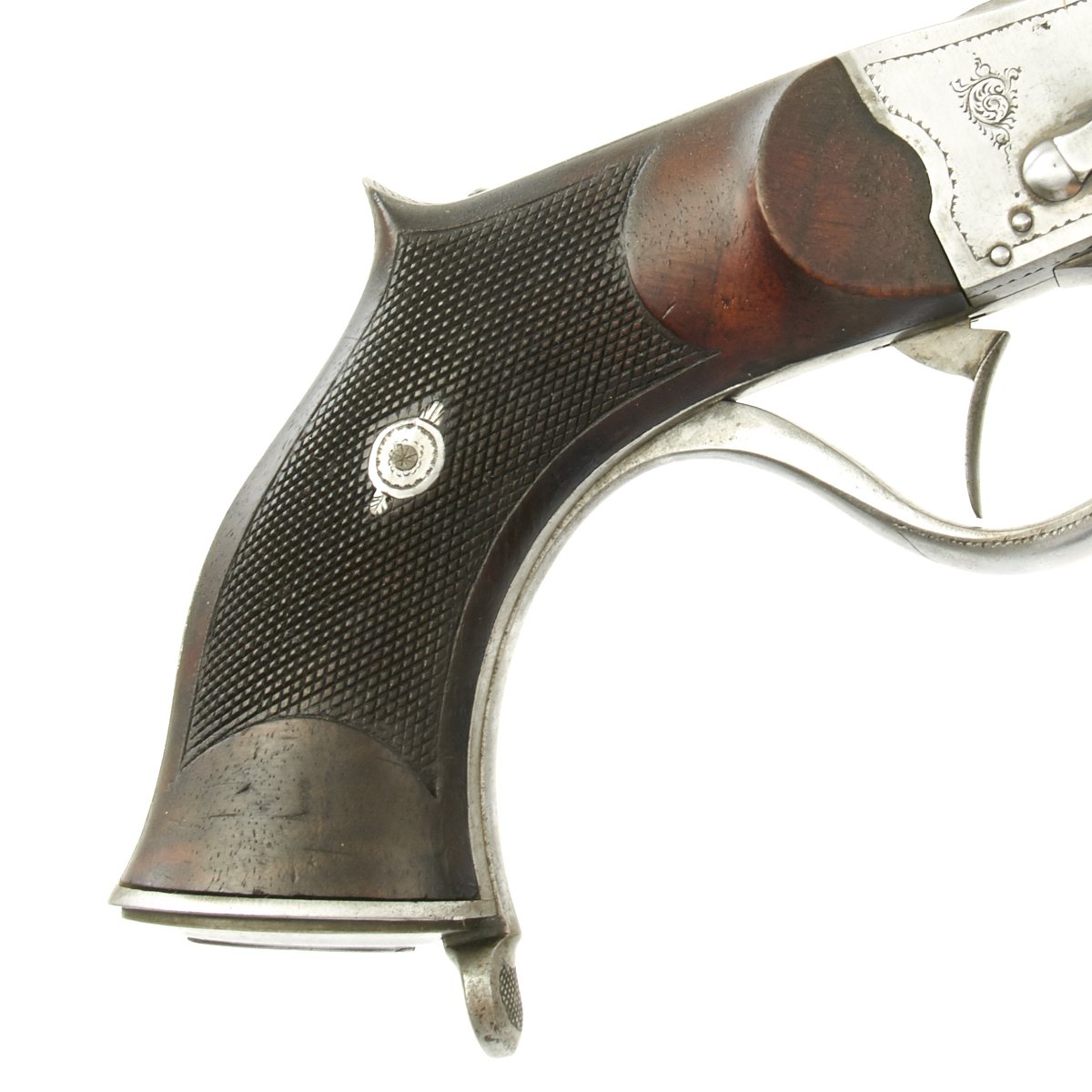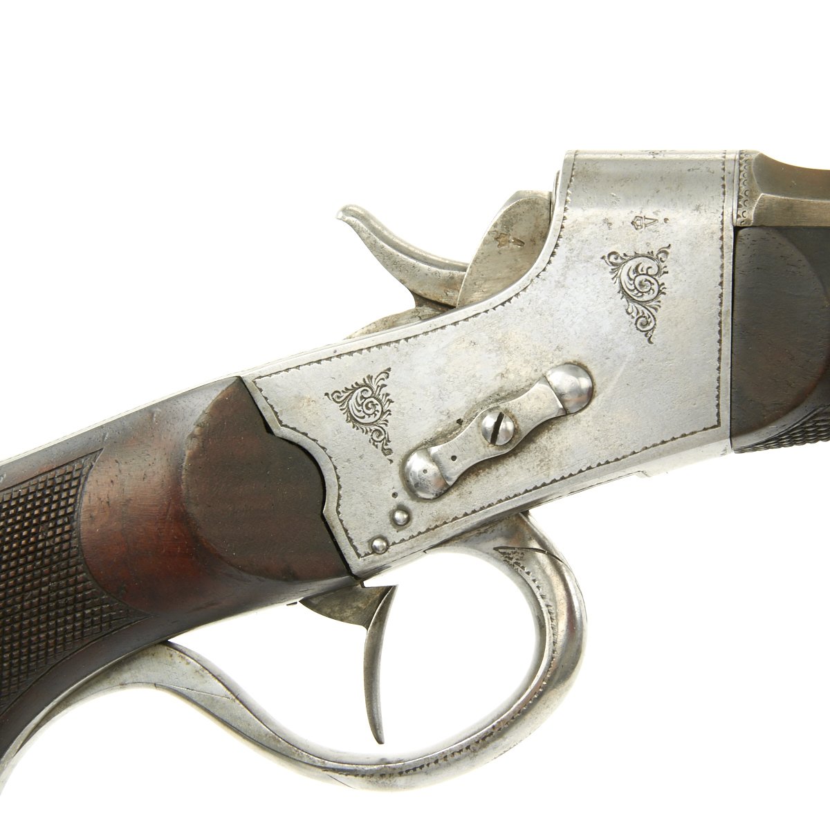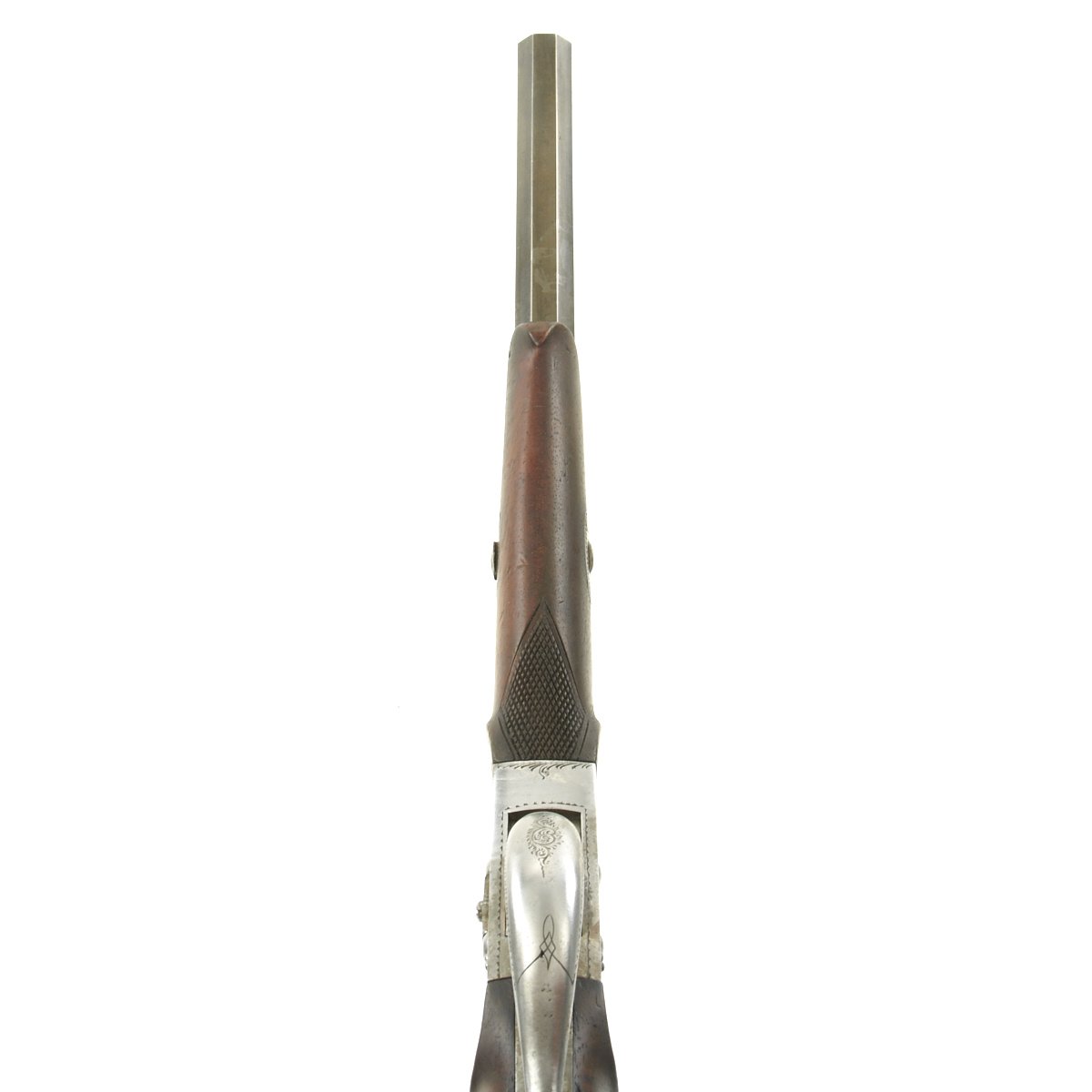 The action is tastefully and moderately engraved in panels and the elaborate wood grip scales are checkered and most comfortable for the target shooting these were originally intended for. The only markings present on the pistols are (CROWN) / V on the action and barrel, which usually represents that it was "viewed" at the London Proof House. These were very possibly bespoke, and that may explain the total lack of markings, as the maker may not have been a licensed Remington manufacturer. The condition on these pistols is just great, and they function correctly as well. The bores are very nice, with little sign of use, having bright finishes with clear lands and grooves.