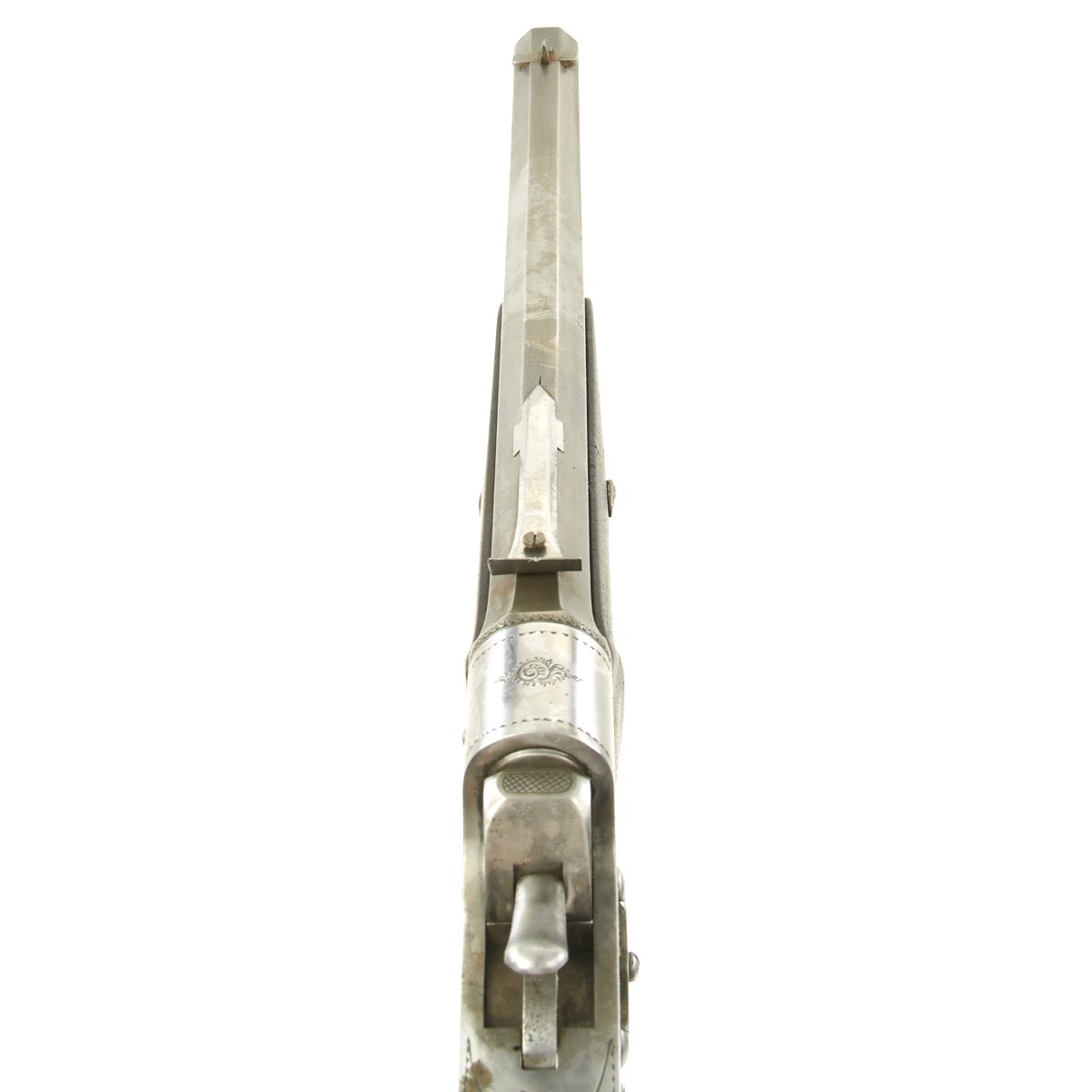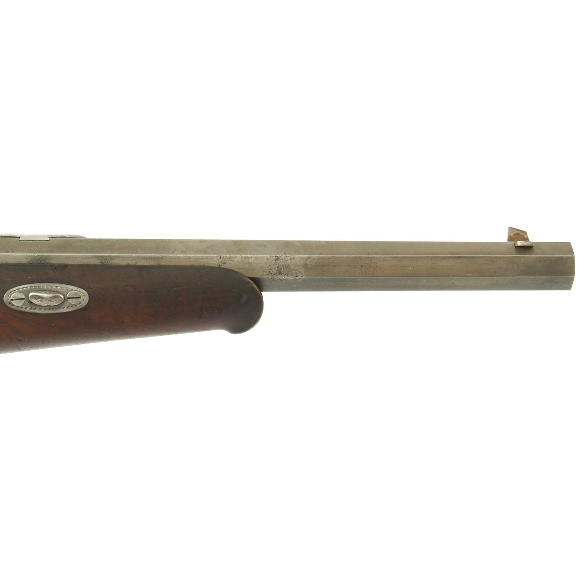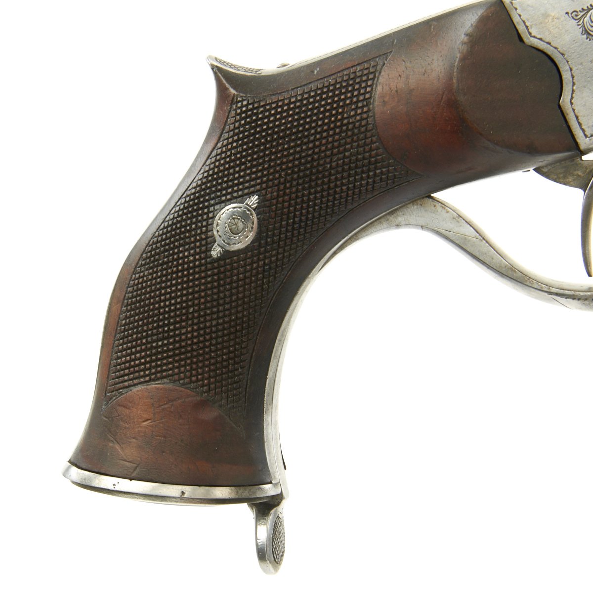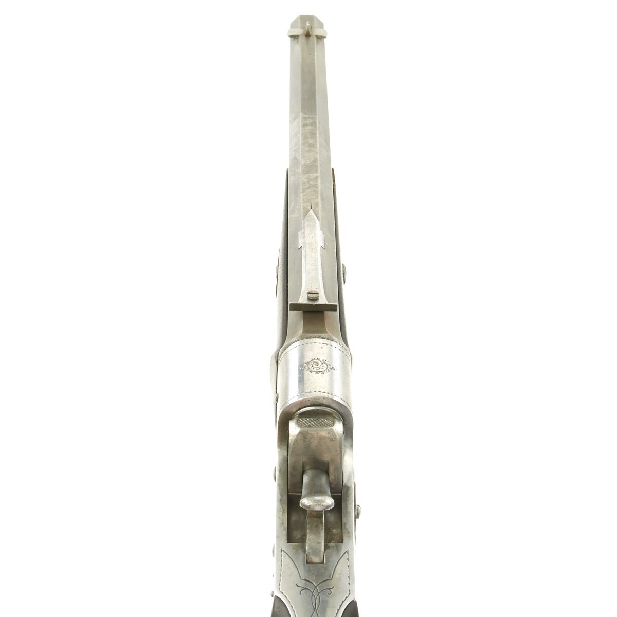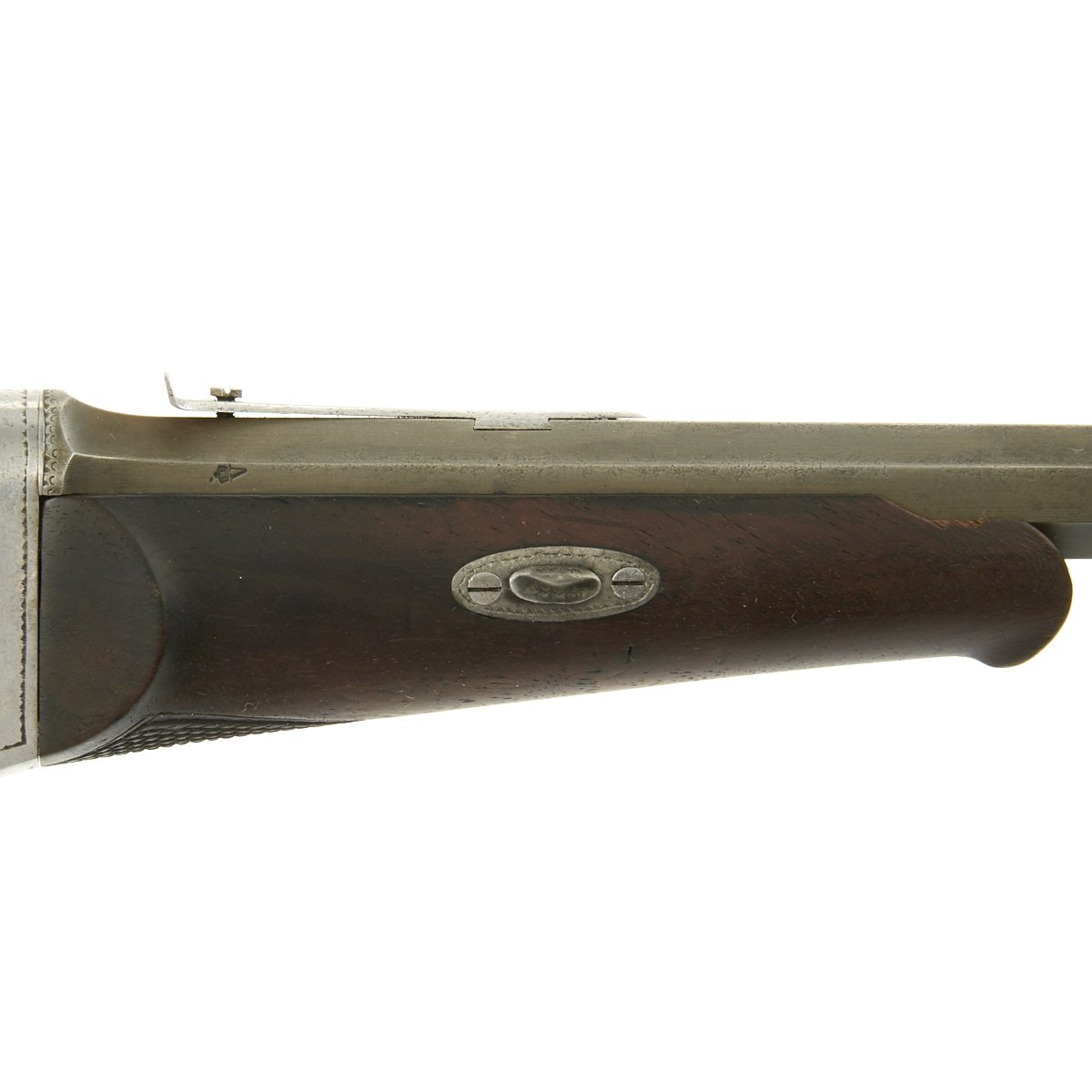 The action is tastefully and moderately engraved in panels and the elaborate wood grip scales are checkered and most comfortable for the target shooting these were originally intended for. The only markings present on the pistols are (CROWN) / V on the action and barrel, which usually represents that it was "viewed" at the London Proof House. These were very possibly bespoke, and that may explain the total lack of markings, as the maker may not have been a licensed Remington manufacturer. The condition on these pistols is just great, and they function correctly as well. The bores are very nice, with little sign of use, having bright finishes with clear lands and grooves.
