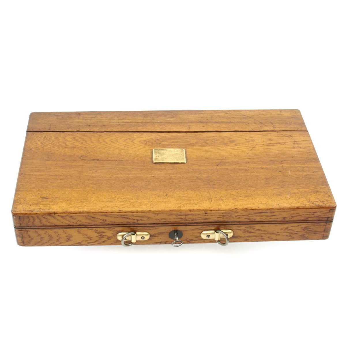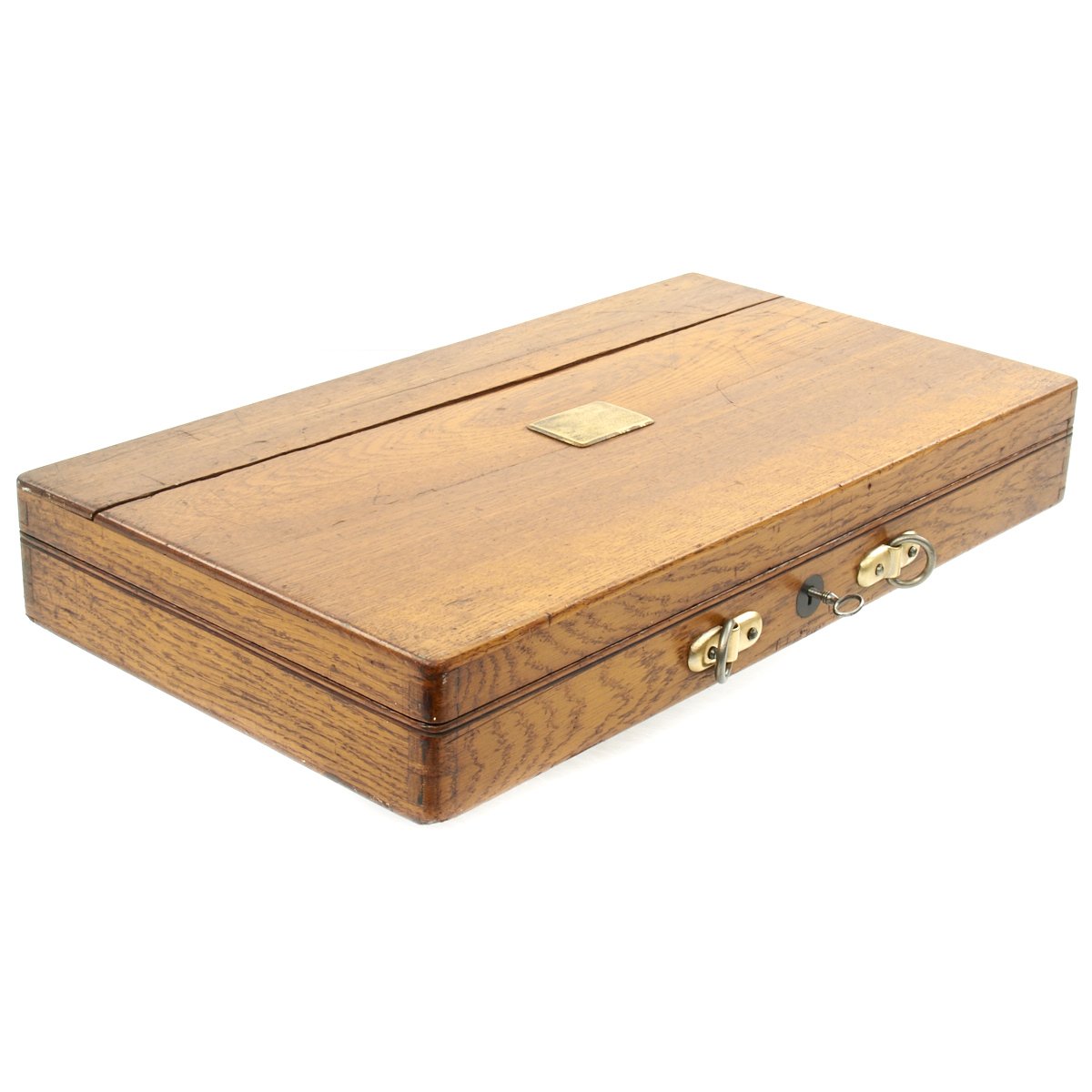The wood case has its handle mounts with rings but the probably briefcase style leather handle is now absent. The case has an escutcheon plate to center of lid for a coat of arms or a gentleman's initials. It is now unmarked. The good news is that the case comes complete with working key.