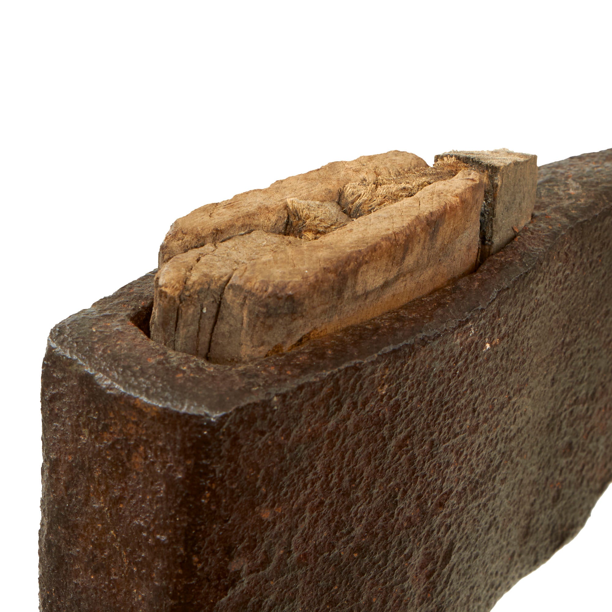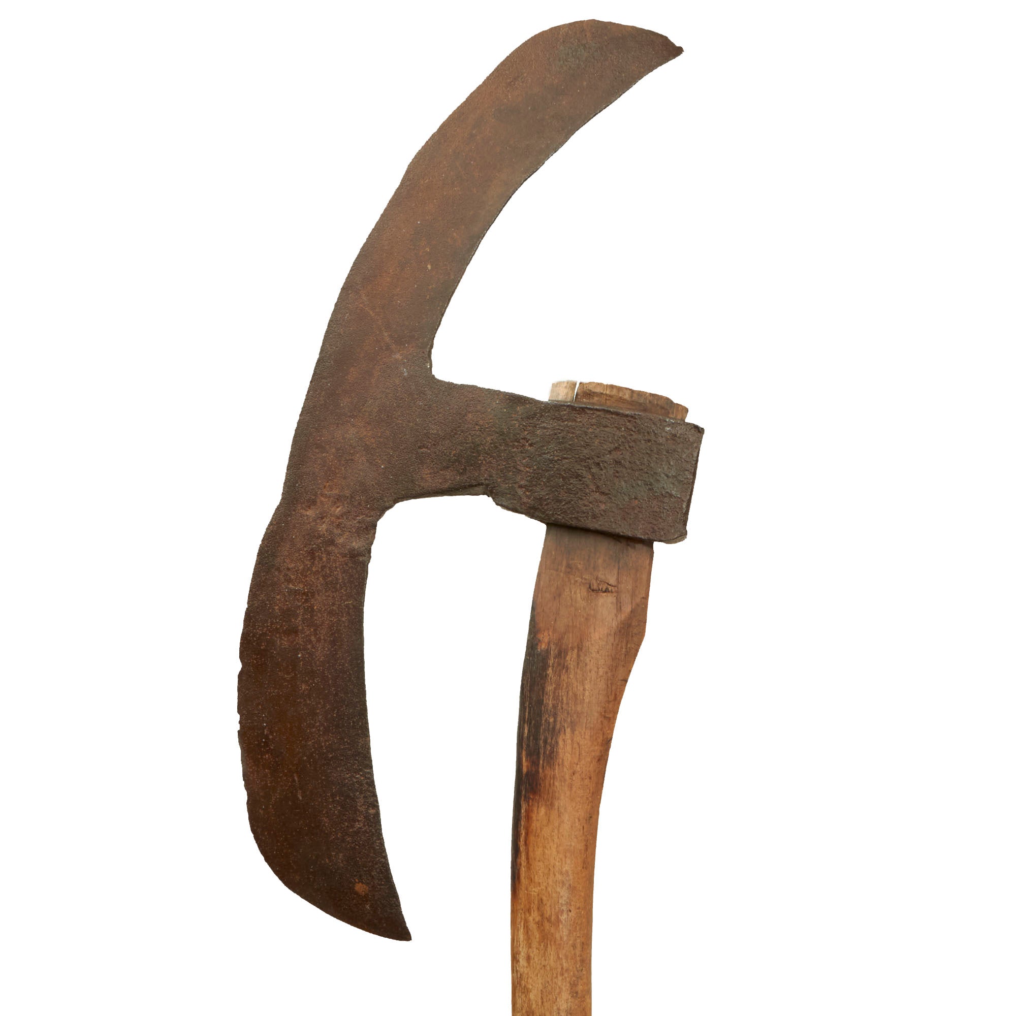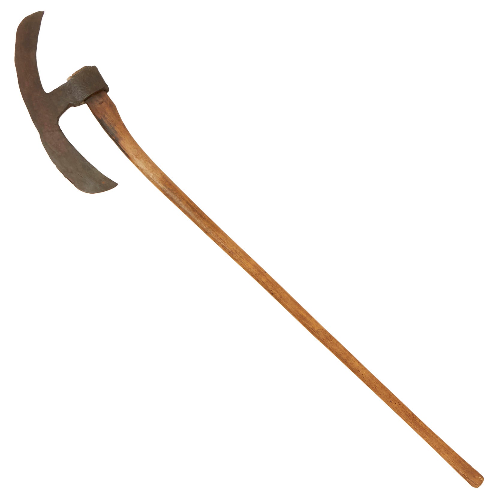 This example measures 61¾” in overall length, with an 18½” blade and a 53¾” shaft. There may have been markings on the blade at one point, but they are now gone. The edge of the blade is a bit inconsistent, so this piece may have been re-shafted at one point. If it was, it was done a very long time ago, as the wooden shaft now has heavy woodworm damage near the bottom. The head is not very tight to the shaft, and an extra piece of wood has been inserted to keep it tight, but it still wobbles a bit.
