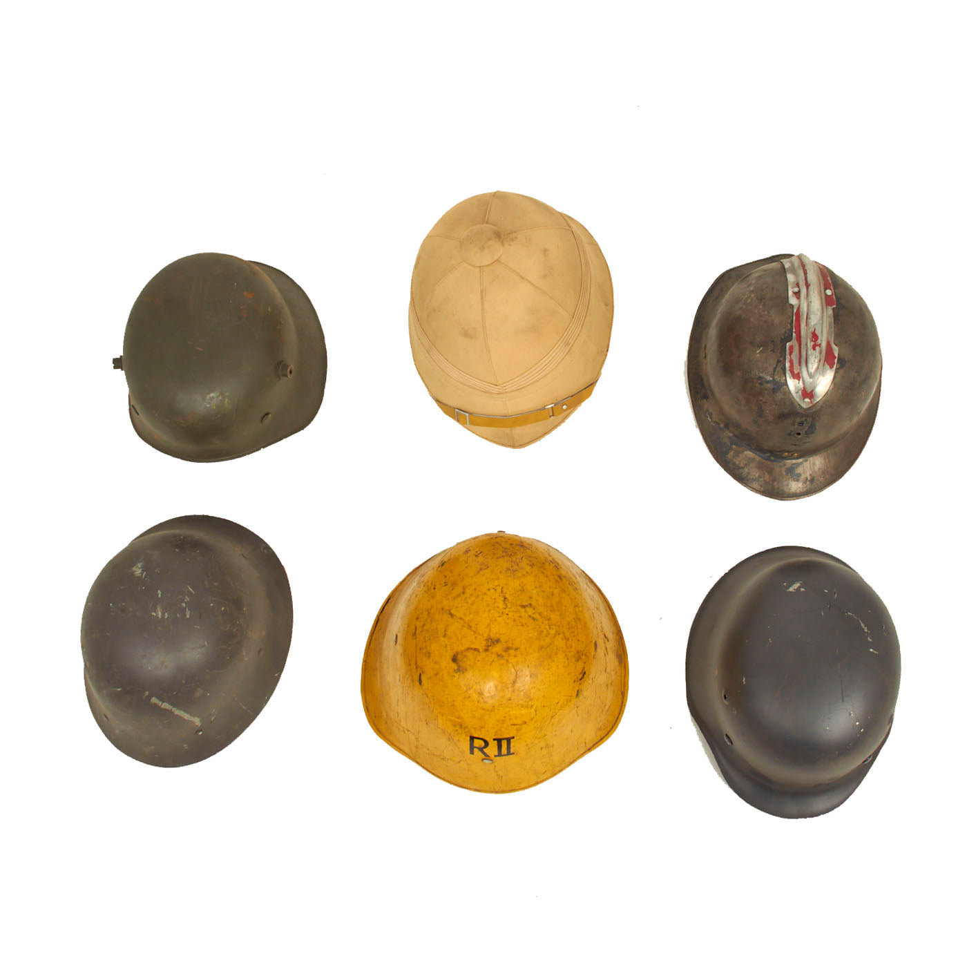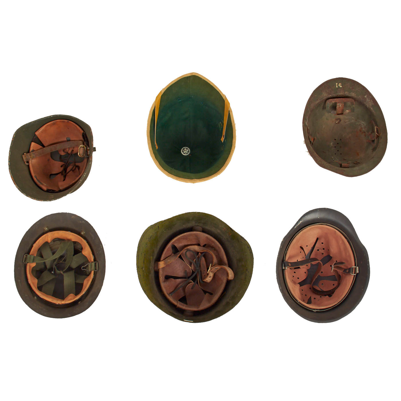 Original Items: Only One Lot of 6 Available. This is a very nice collection of helmets from various time periods and countries. A few helmets are complete with liners and are offered in good condition. This is a wonderful lot to pick up if you are looking to either start collecting helmets or are just wanting to add these really nice examples to your already existing ones.