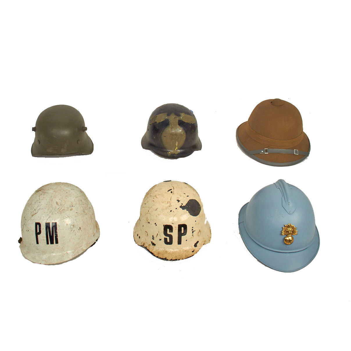 Original Items: Only One Lot of 6 Available. This is a very nice collection of helmets from various time periods and countries. A few of the helmets are complete with liners and are offered in good condition. This is a wonderful lot to pick up if you are looking to either start collecting helmets or are just wanting to add these really nice examples to your already existing ones.