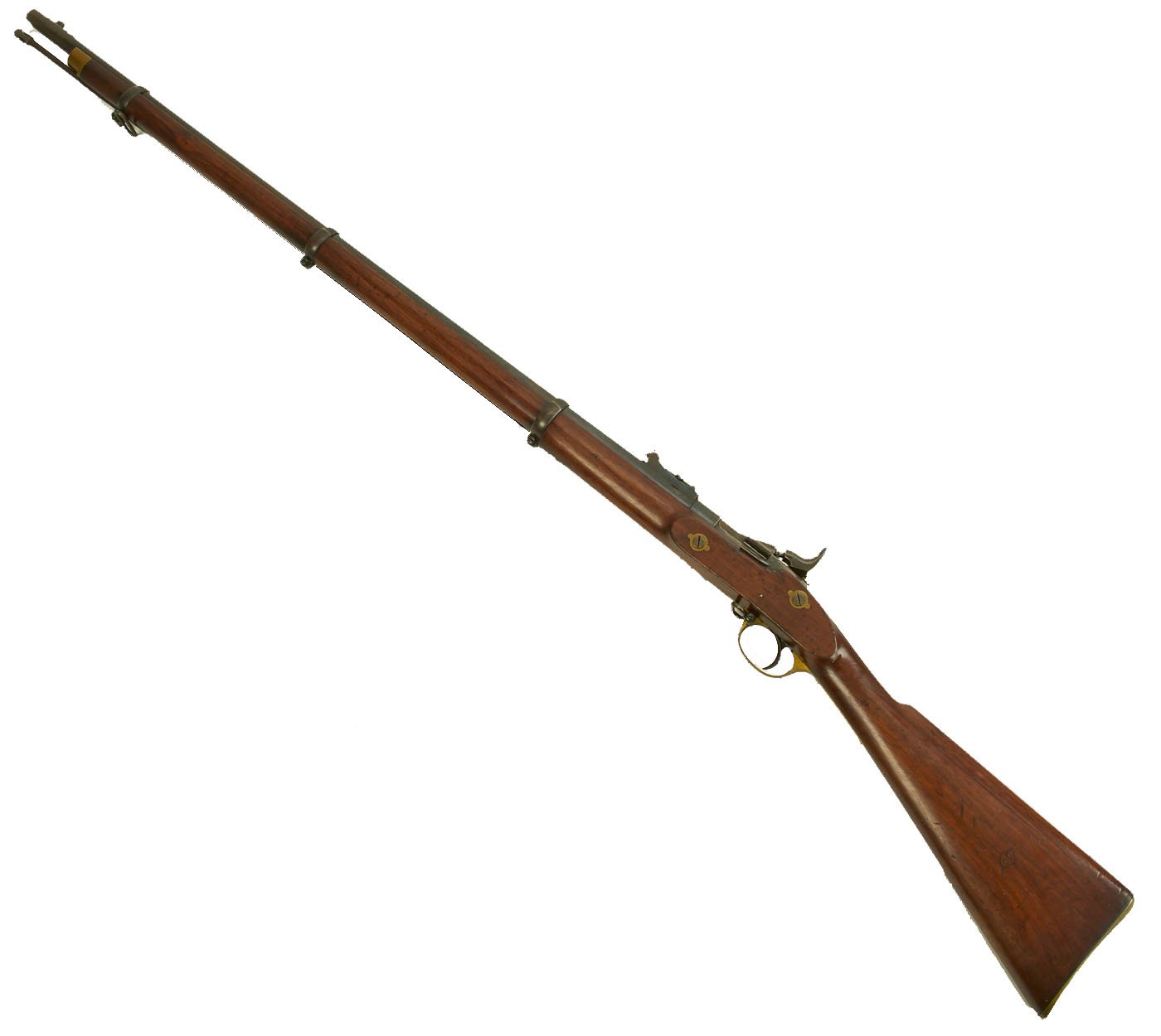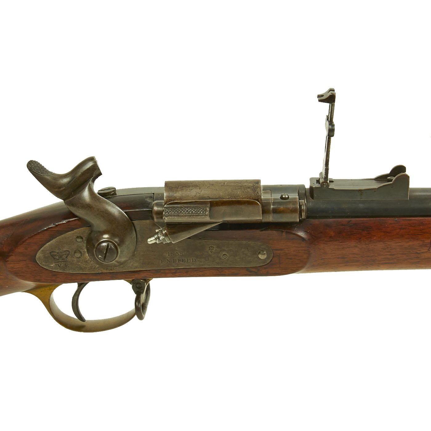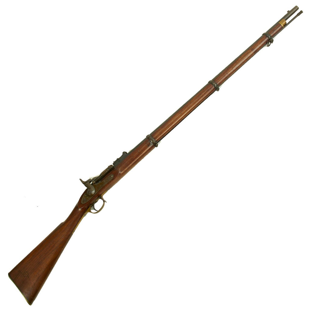Original Item: Only One Available. This rifle is 100% all British manufacture, starting life in 1858 as a .577 caliber three band ENFIELD Percussion Rifle model of P-1853. The lock is plate stamped "CROWN" over V.R. and ENFIELD / 1858, indicating manufacture at the Royal Small Arms factory at Enfield. This was a military issue, as indicated by the royal monogram. The barrel has copious British markings and proof marks, and the whole rifle is in just outstanding condition. Functionally, the rifle is just great. The lock functions correctly, the breech opens and ejects, and the rear sight is intact with the slider.