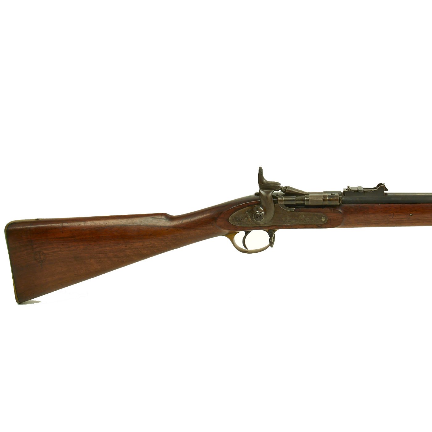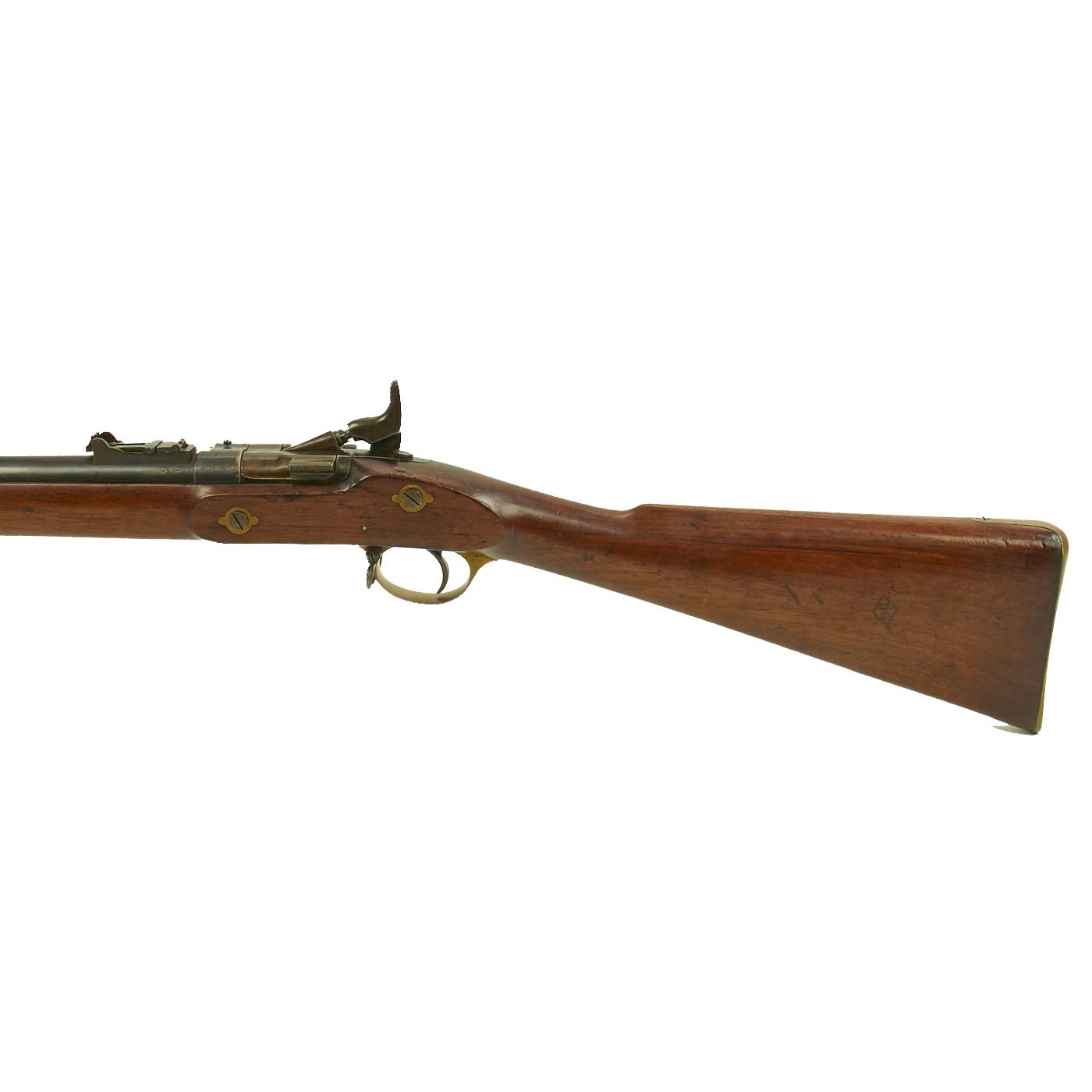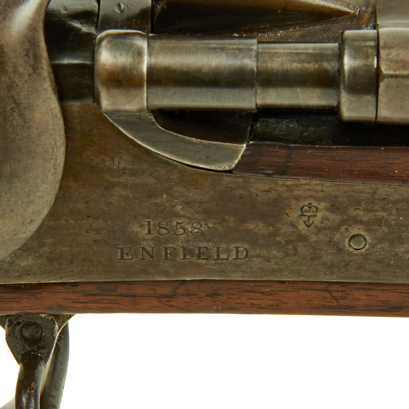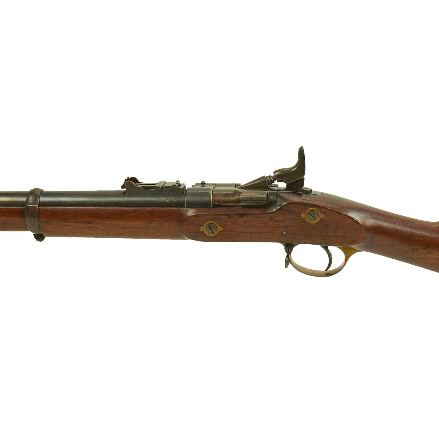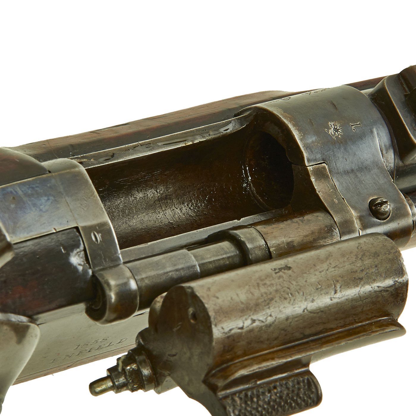 The wood butt stock retains a crisp cartouche, something we almost never see, reading R "Crown" M / ENFIELD / 1 with a proof in the center. The barrel has standard three grove rifling and the bore shows clear lands and grooves, with a mostly bright finish. The finish shows loads of original bluing, with case hardening still on the Snider Breech assembly. There is the correct I. * stamped on top of the breech, indicating it is the MkI* version of the breech. This version modified the chamber to have a square shoulder, as the earlier rounded shoulder ammunition would blow the breech open, definitely not a good thing. Later versions would make additional improvements.