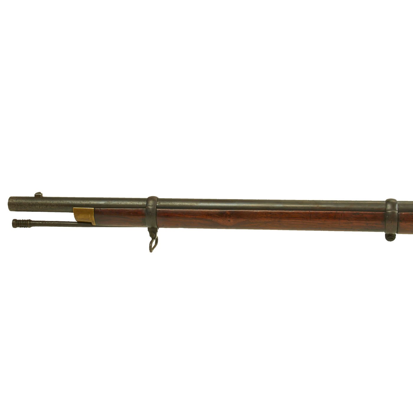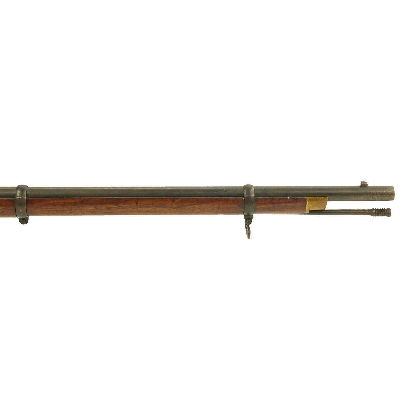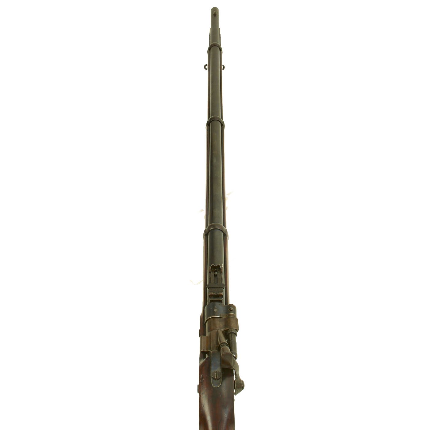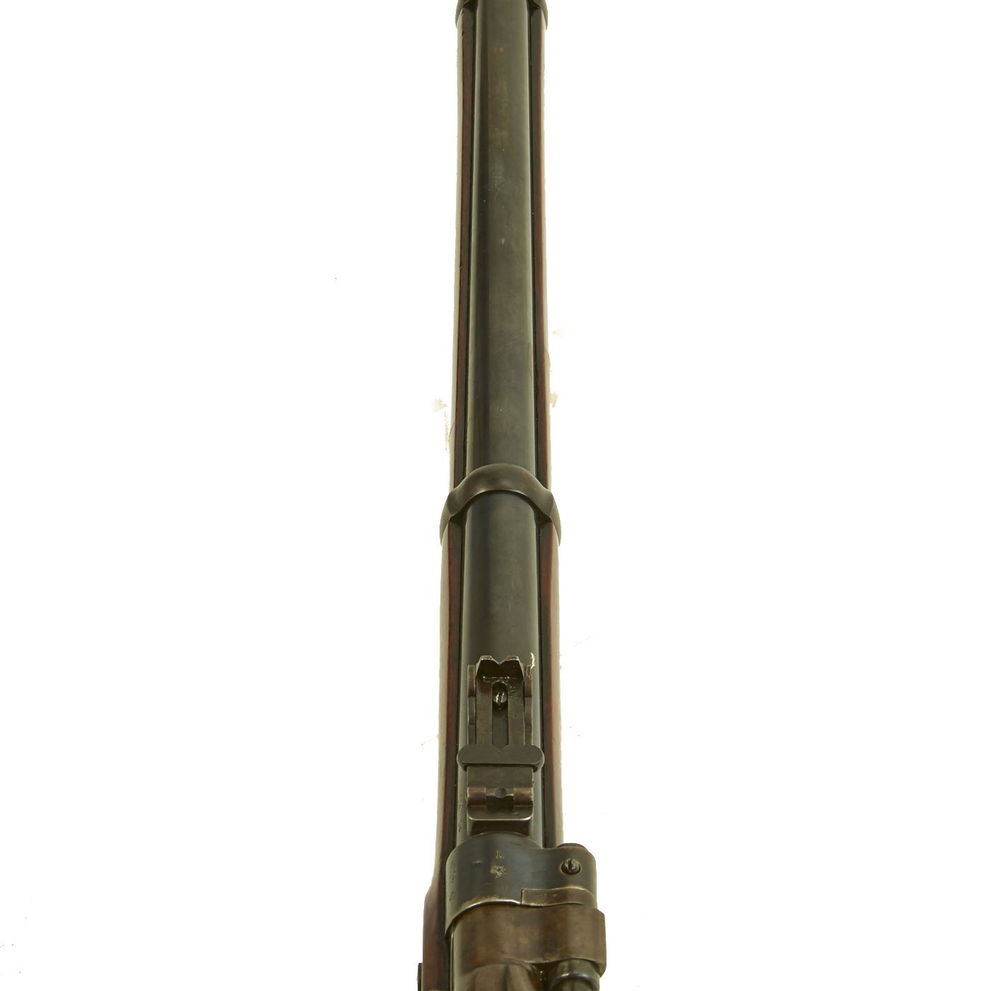 The wood butt stock retains a crisp cartouche, something we almost never see, reading R "Crown" M / ENFIELD / 1 with a proof in the center. The barrel has standard three grove rifling and the bore shows clear lands and grooves, with a mostly bright finish. The finish shows loads of original bluing, with case hardening still on the Snider Breech assembly. There is the correct I. * stamped on top of the breech, indicating it is the MkI* version of the breech. This version modified the chamber to have a square shoulder, as the earlier rounded shoulder ammunition would blow the breech open, definitely not a good thing. Later versions would make additional improvements.