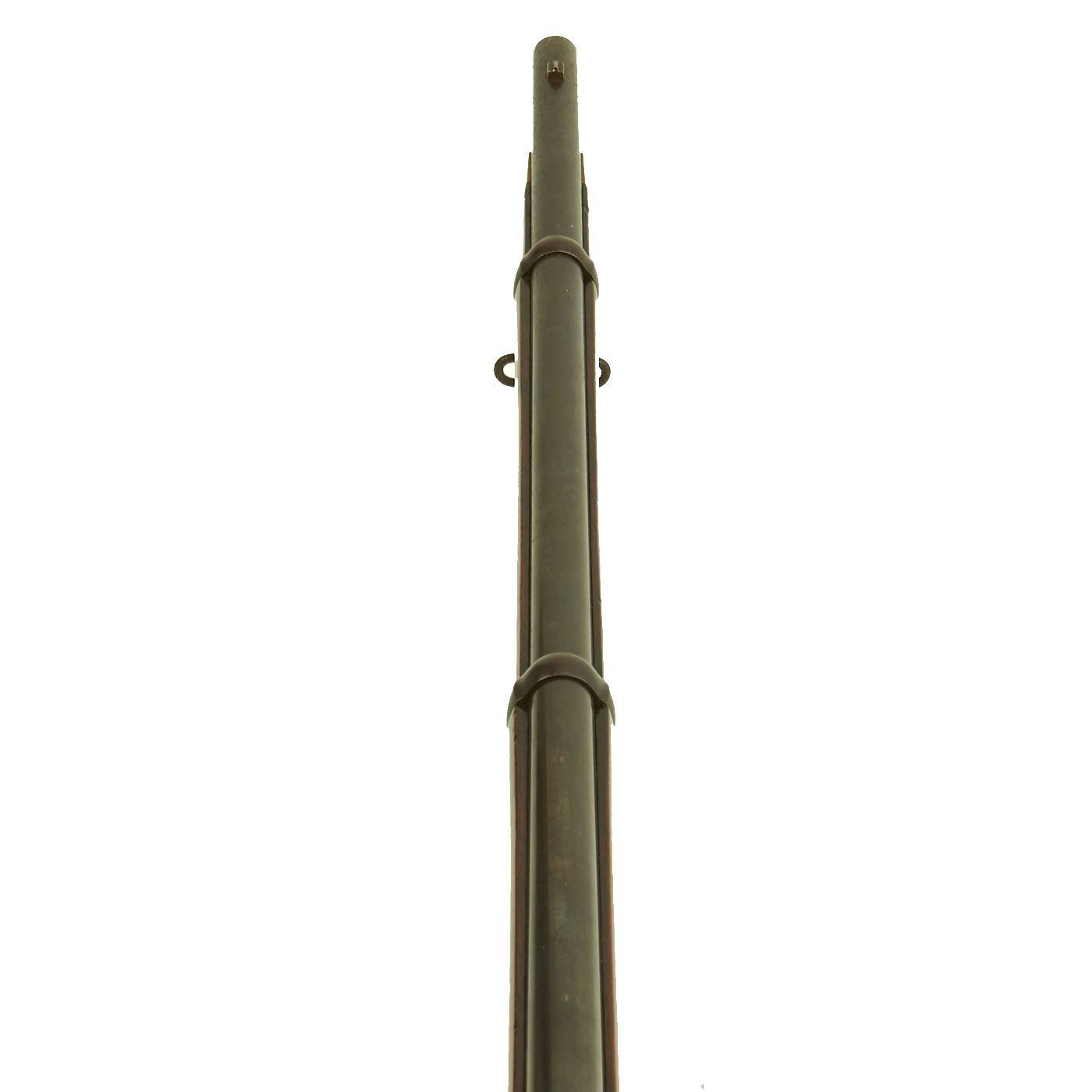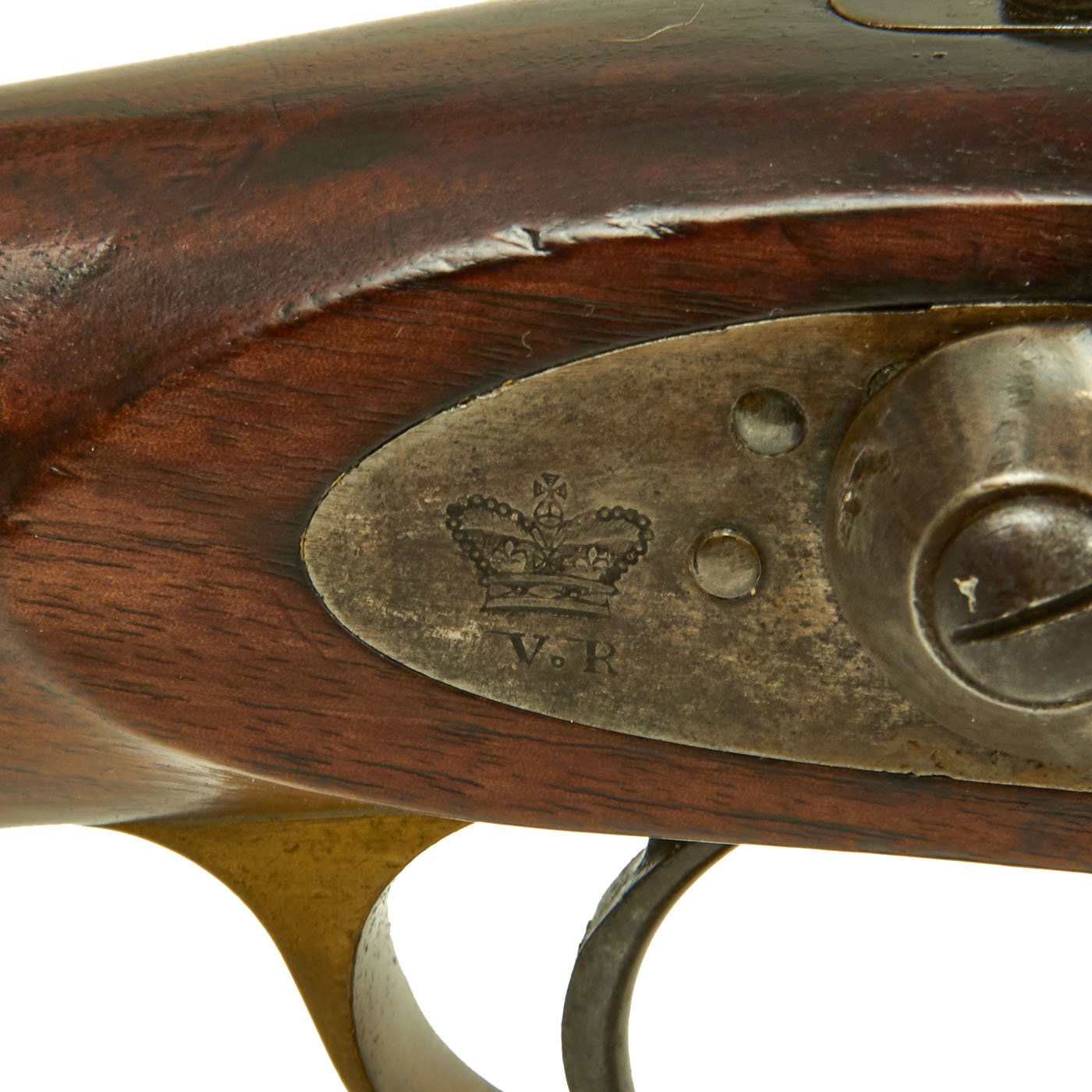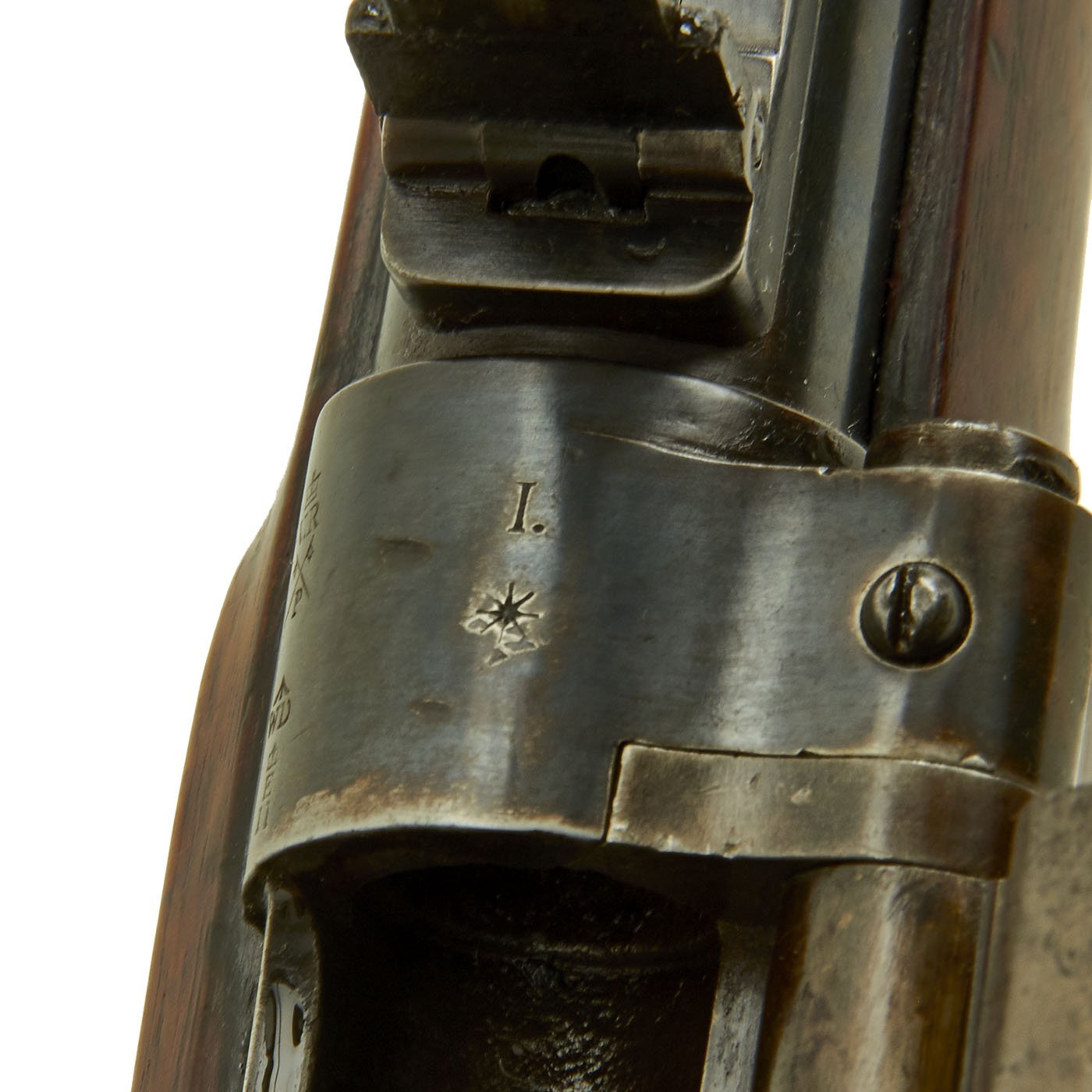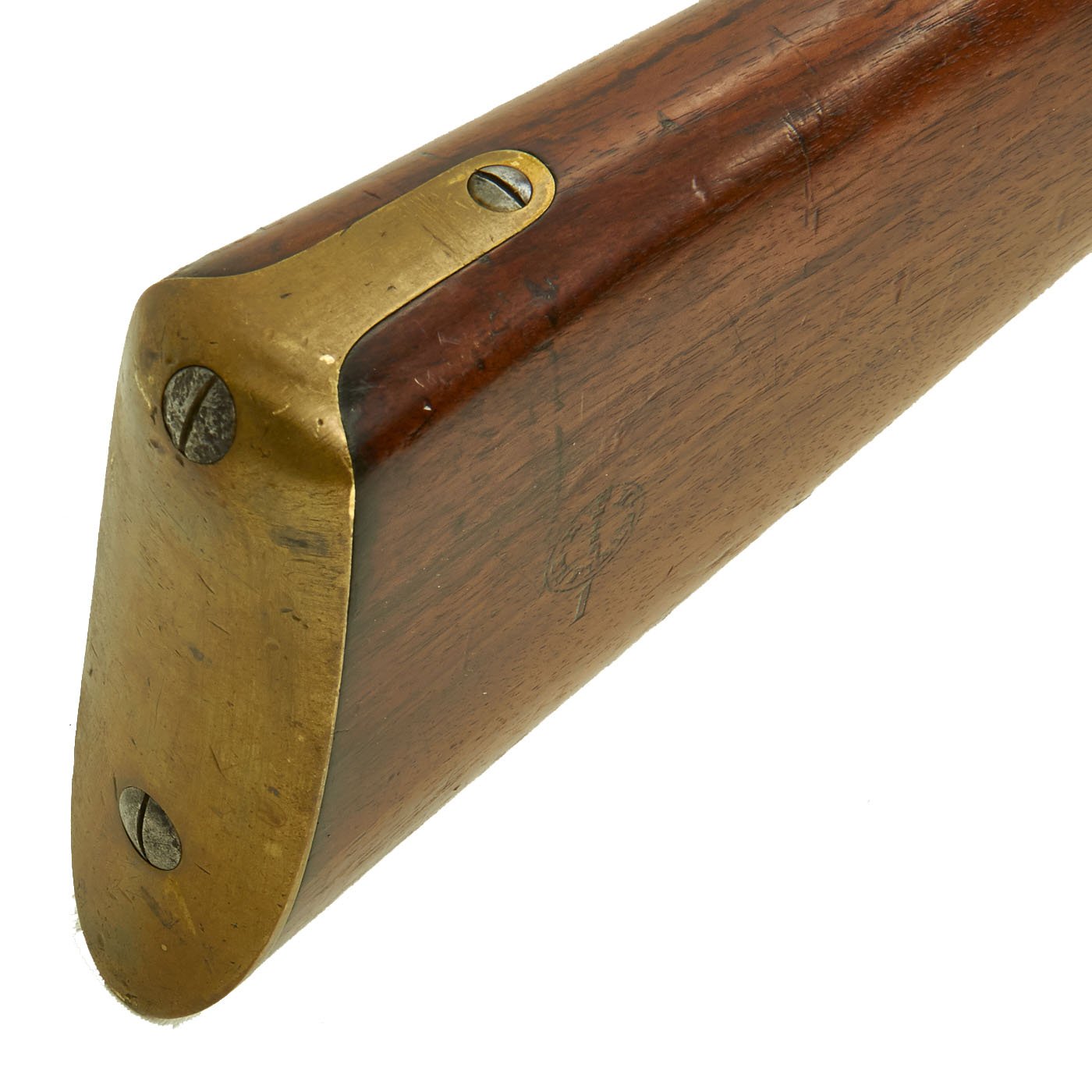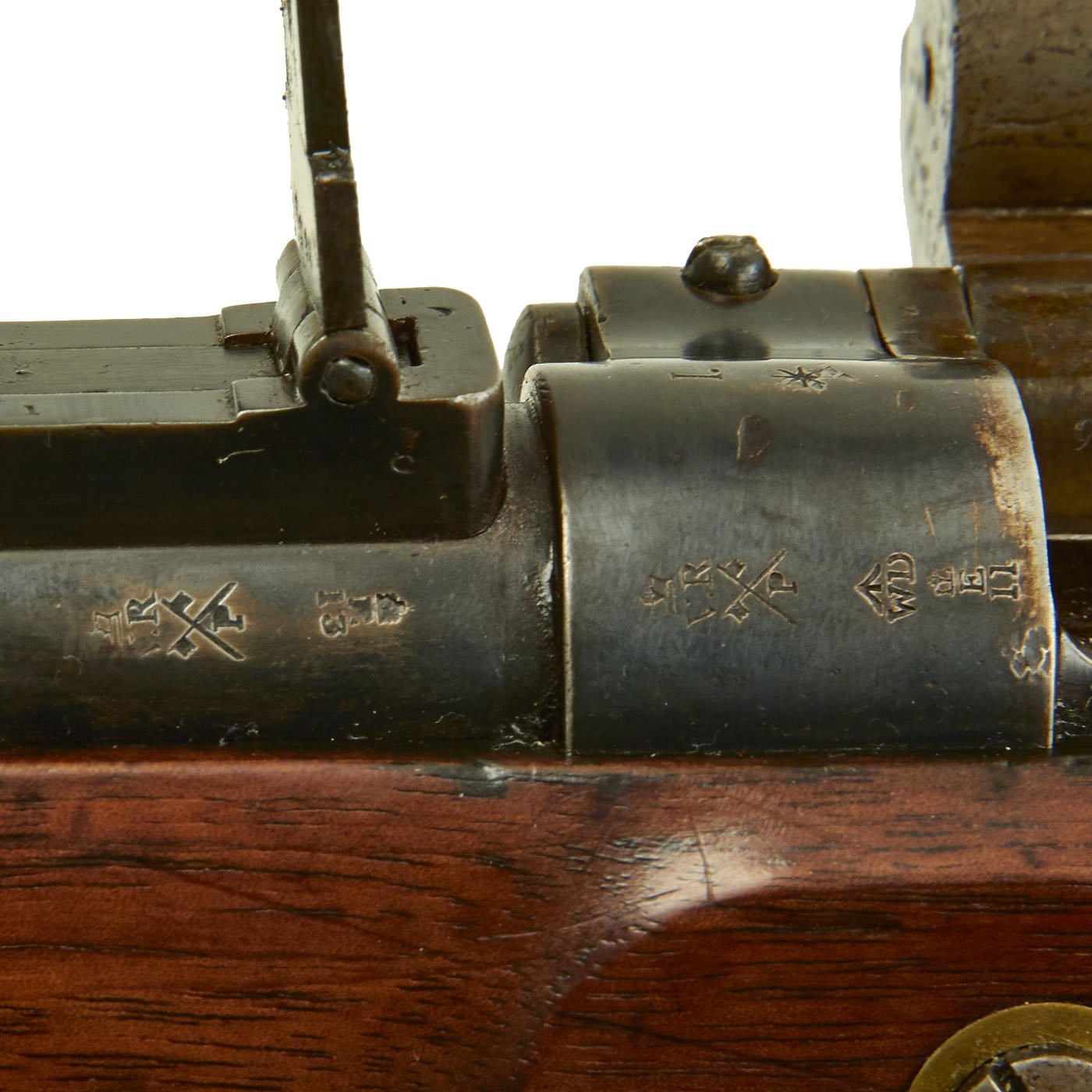 The wood butt stock retains a crisp cartouche, something we almost never see, reading R "Crown" M / ENFIELD / 1 with a proof in the center. The barrel has standard three grove rifling and the bore shows clear lands and grooves, with a mostly bright finish. The finish shows loads of original bluing, with case hardening still on the Snider Breech assembly. There is the correct I. * stamped on top of the breech, indicating it is the MkI* version of the breech. This version modified the chamber to have a square shoulder, as the earlier rounded shoulder ammunition would blow the breech open, definitely not a good thing. Later versions would make additional improvements.