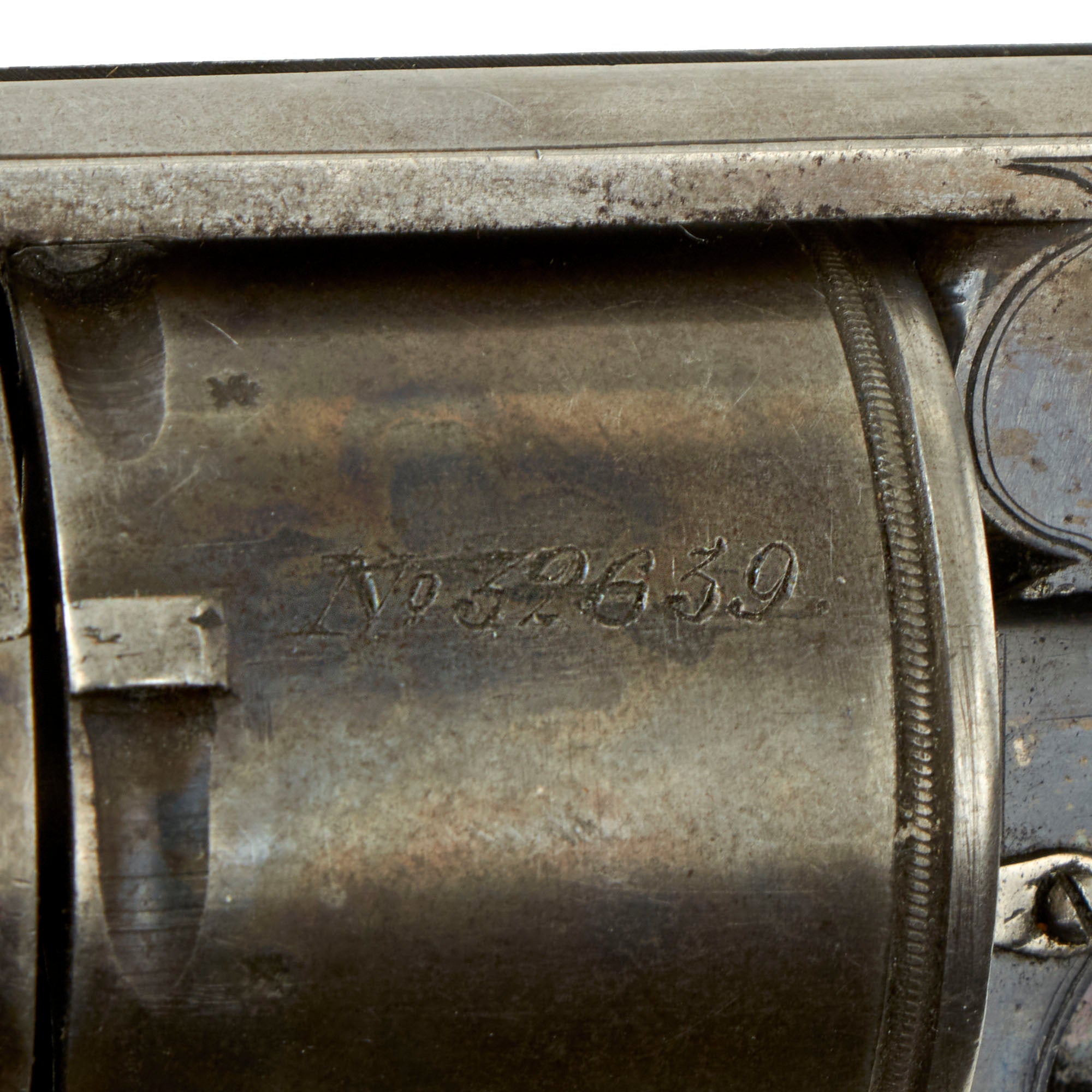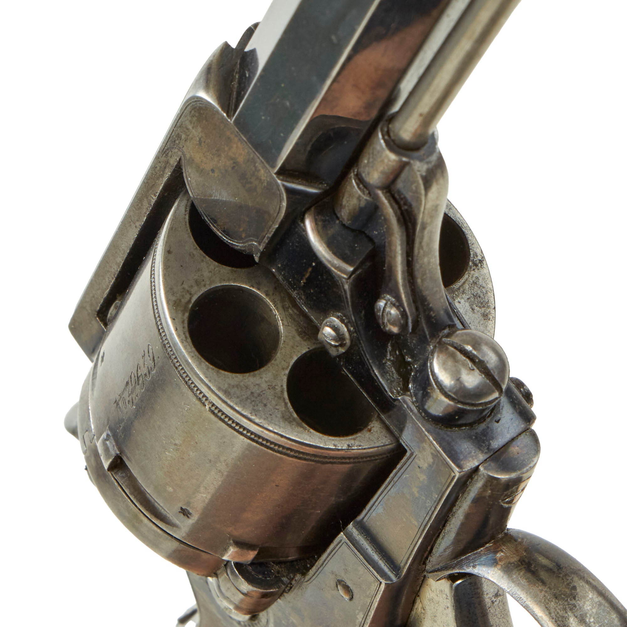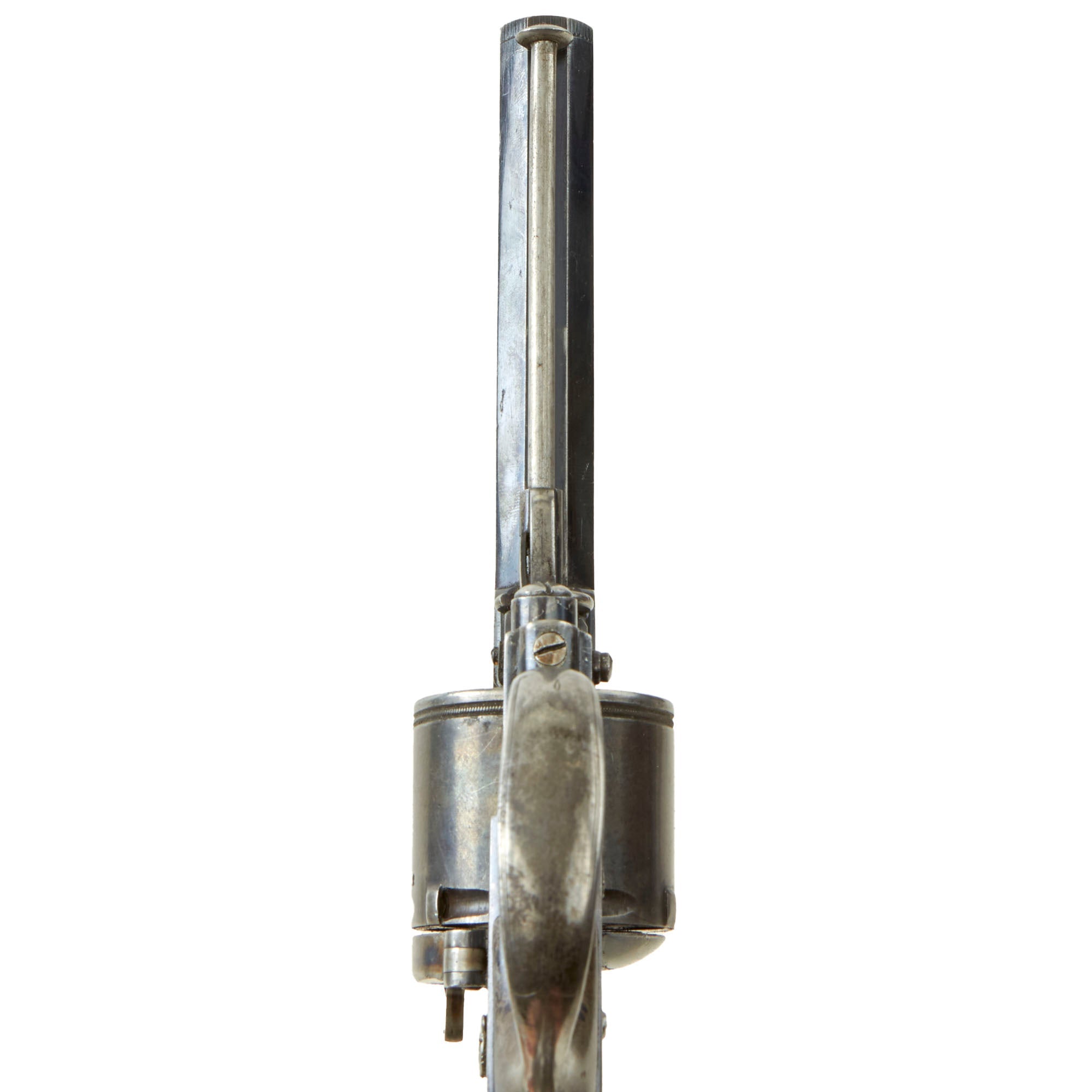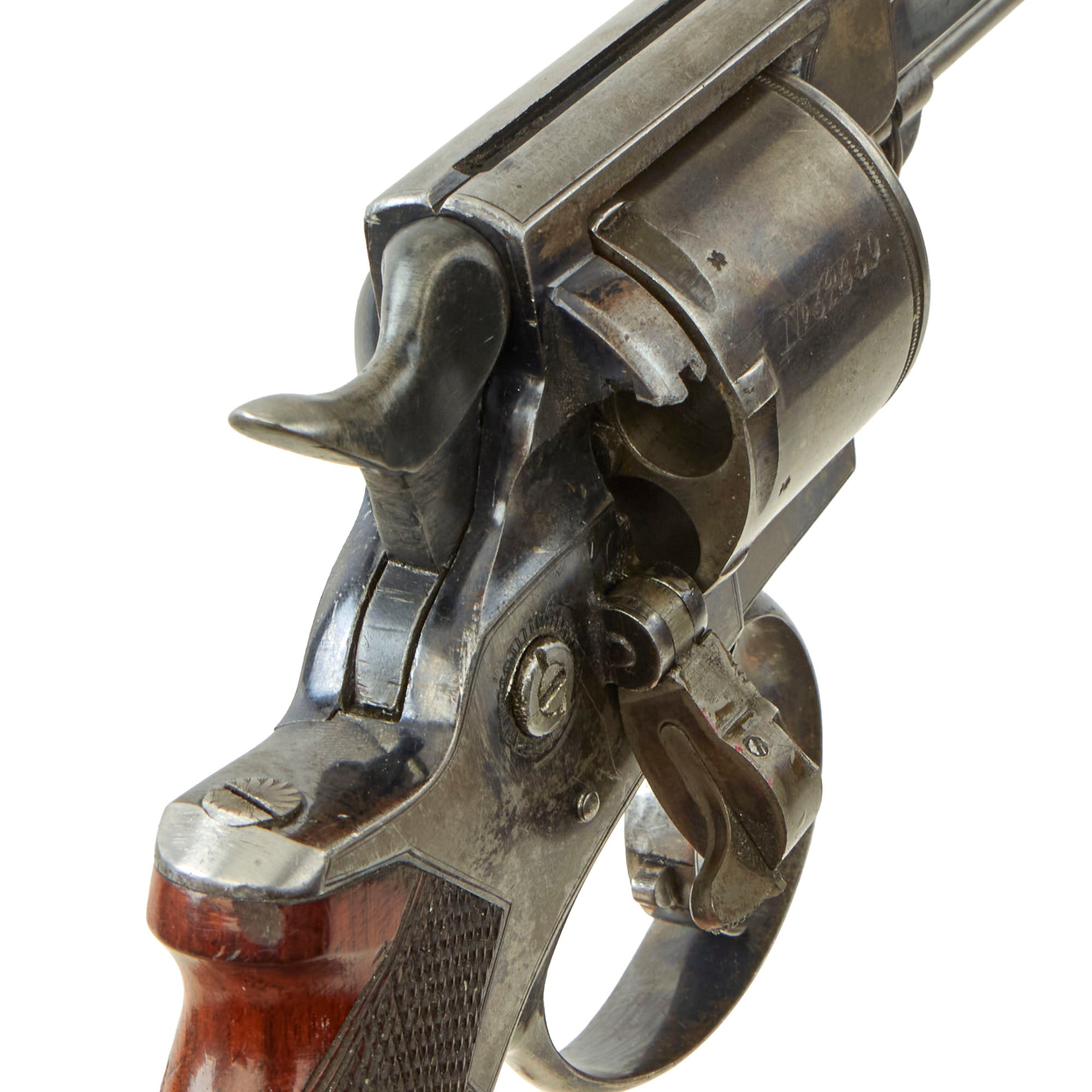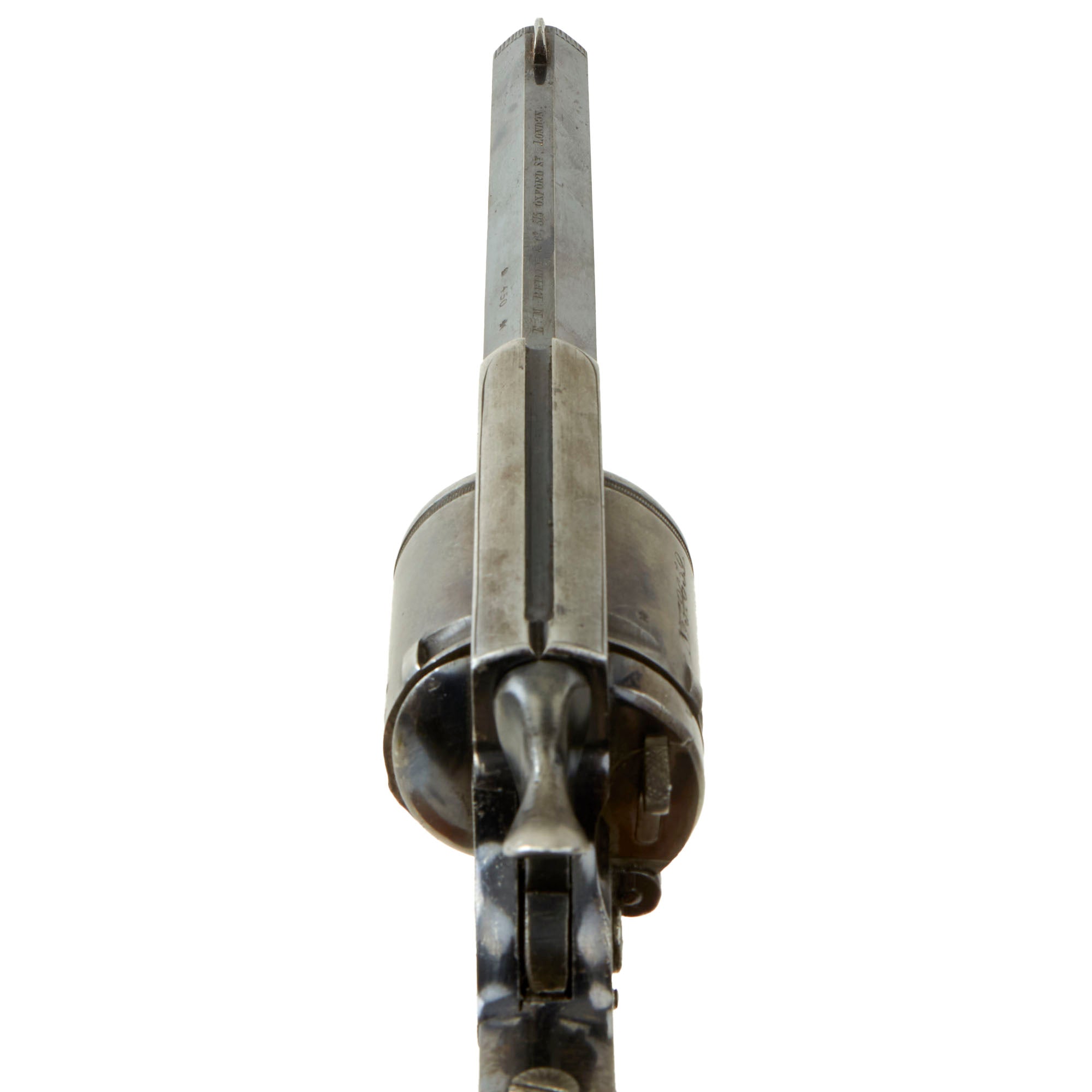 William Tranter was a major Birmingham gun maker who made many private purchase weapons at his factory until his retirement in 1885. The patent marking is also present on the cartridge ejecting rod, as often seen. The basic design of his revolvers was originally developed for cap and ball percussion, but was easily adapted for later Rimfire and Centerfire cartridges. This example is marked on the left barrel facet with 450, indicating it is chambered for the .450 "Boxer" Cartridge. Surrounding this are the correct CROWN / CROSSED SCEPTERS / BPC "proof" and CROWN / CROSSED SCEPTERS / V "viewed" marks from the Birmingham proof house. The cylinder has additional "viewed" markings on the side of every chamber.