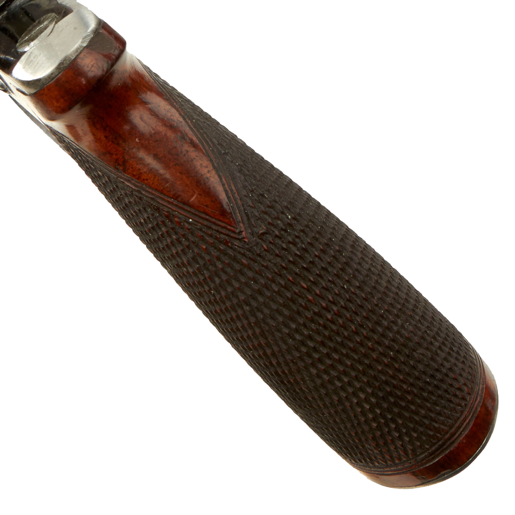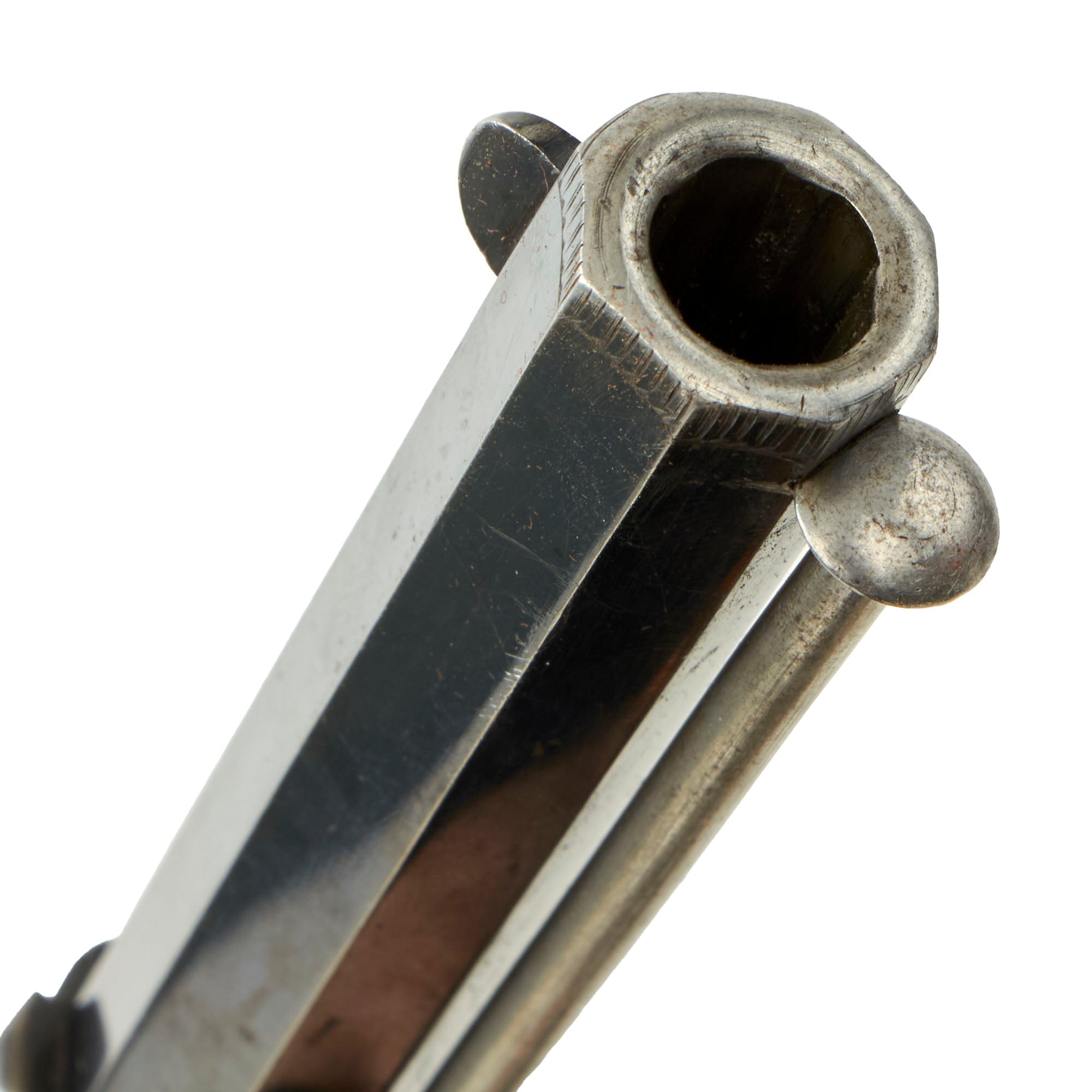 The metalwork retains much of the original blued finish, especially on the barrel and front of the frame, while the rear of the frame and revolver shows wear from use. The walnut checkered wood grip is in great shape, and shows hardly any wear whatsoever, and a lovely color. The cylinder is six Shot with side gate access on the right hand side to the rear of the chamber for re-loading, and the cylinder pin pulls out to break down the revolver. The bore is mostly bright, with clear lands and grooves, and some spots of oxidation. The cycles well in double action, however when using it in single action, the cylinder often fails to advance correctly. It is possible that it was not intended to work in single action. The ejector rod works correctly.