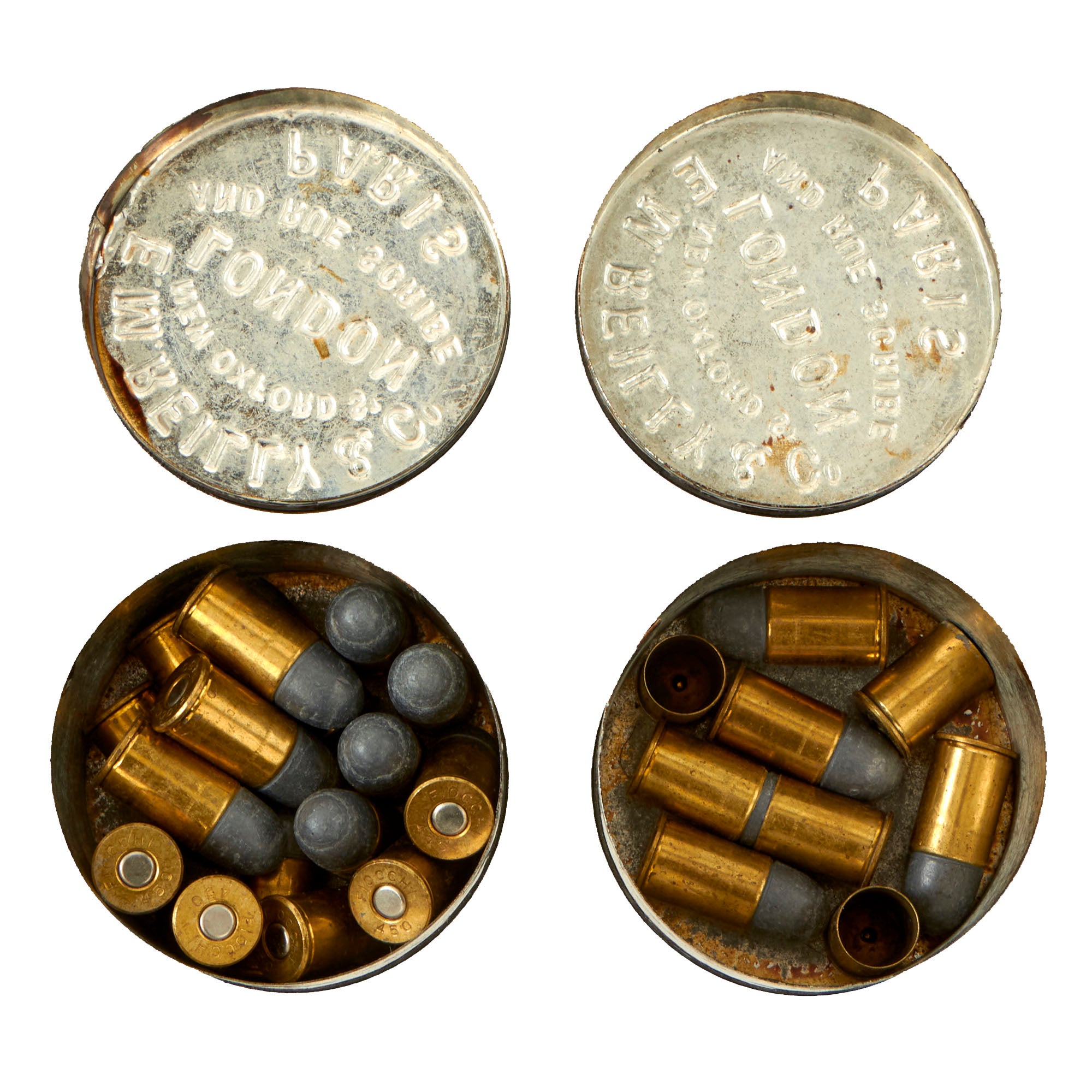 There are also two lovely E M REILLY & CO marked cartridge tins, which contain a good number of 450 cartridges, as well as some spent shell casings. The right compartment where the key is also has an old folded up promissory note or layaway agreement dated 1938, 1939, and 1940, which we assume is from a previous sale of the revolver. Really some fantastic accessories along with this lovely revolver!
